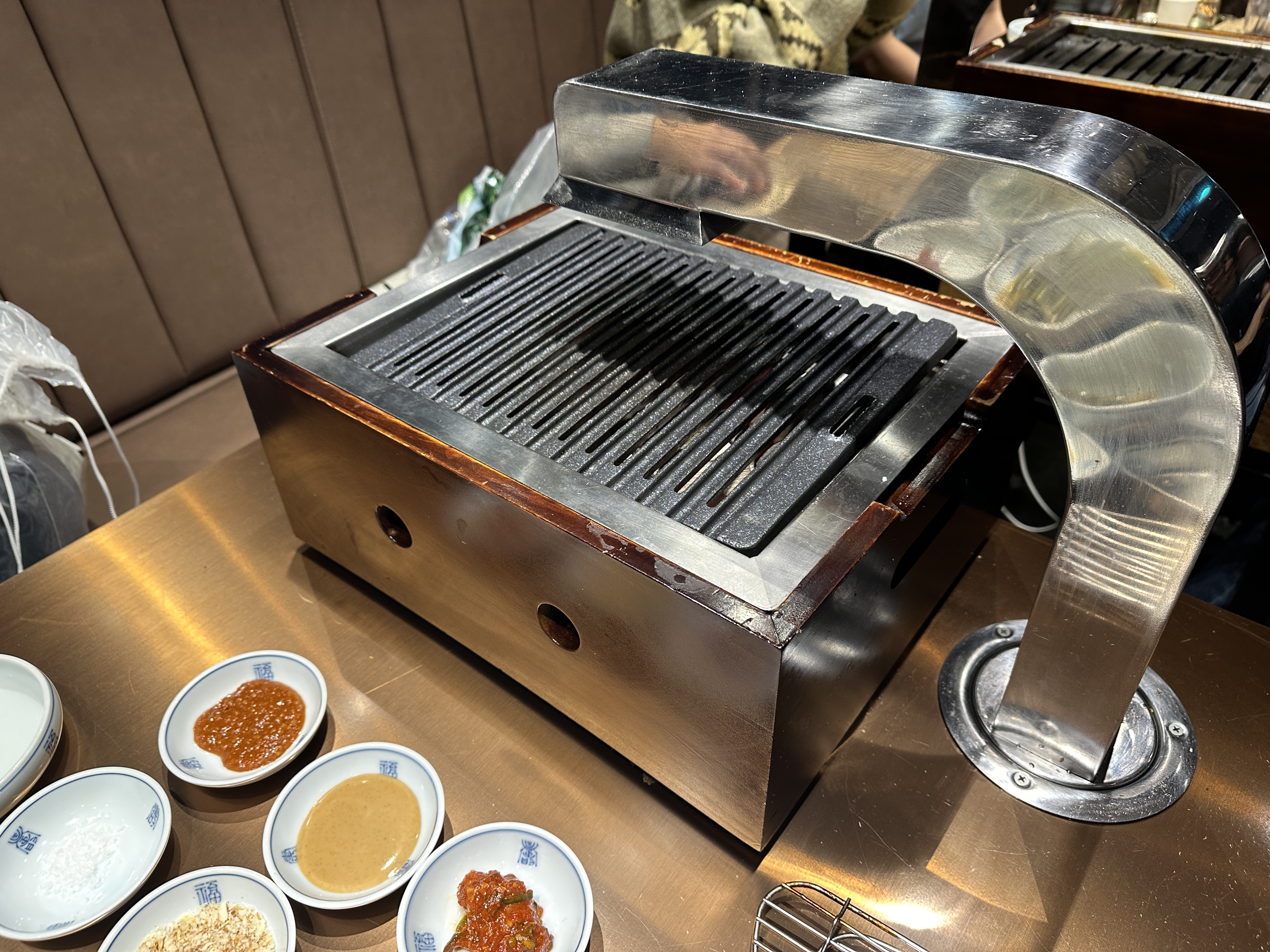 군자역 숙성부심의 테이블 기본 세팅입니다. 많지도, 적지도 않은 반찬의 양과 화로입니다. 사실 이 날에는 저 계란/감자 셀러드가 상당히 짰습니다. ㅋㅋㅋㅋ 화로에서는 바로 연기를 빨아내기에 냄새가 많이 나지 않는 것 또한 큰 장점입니다.