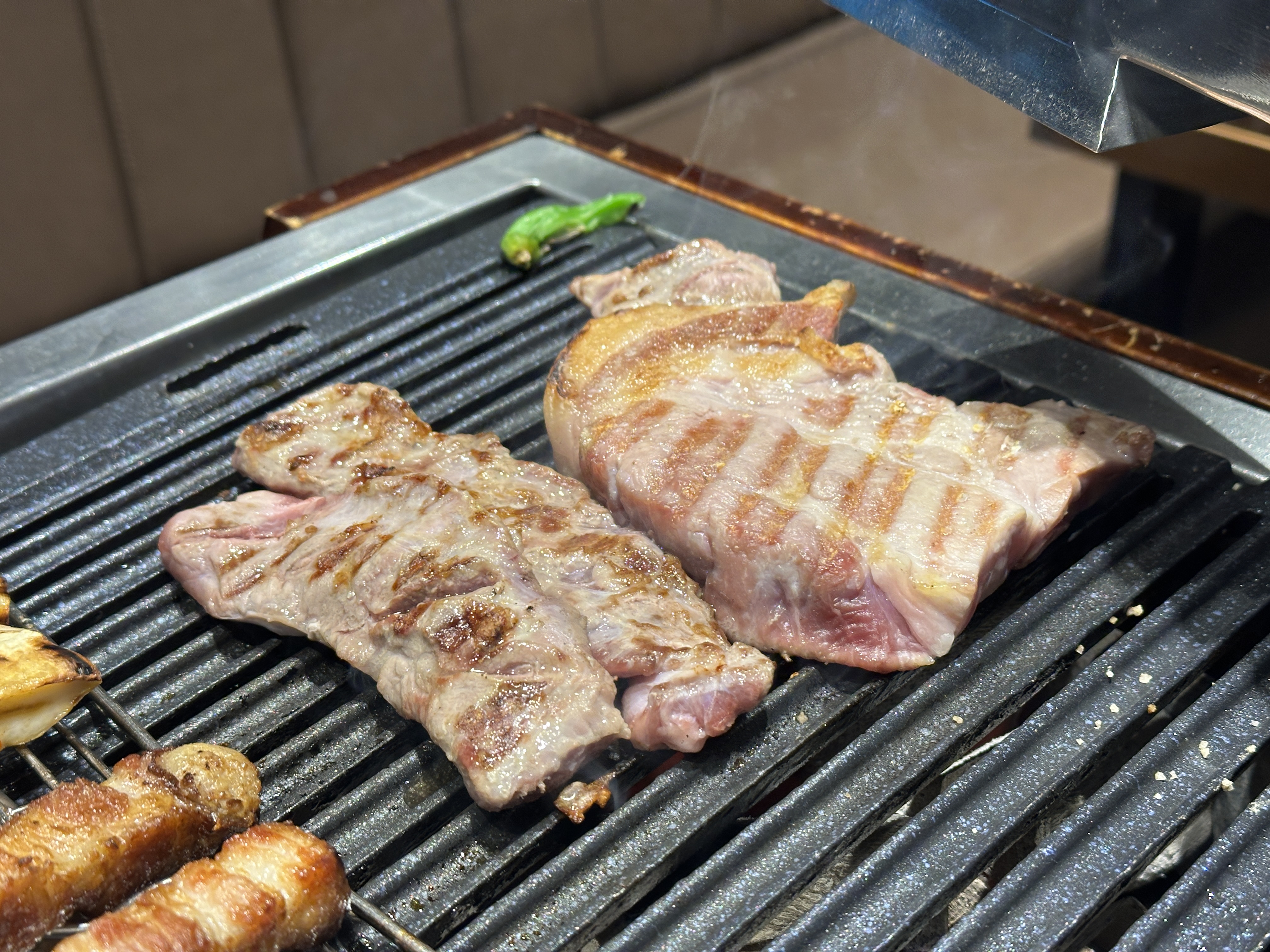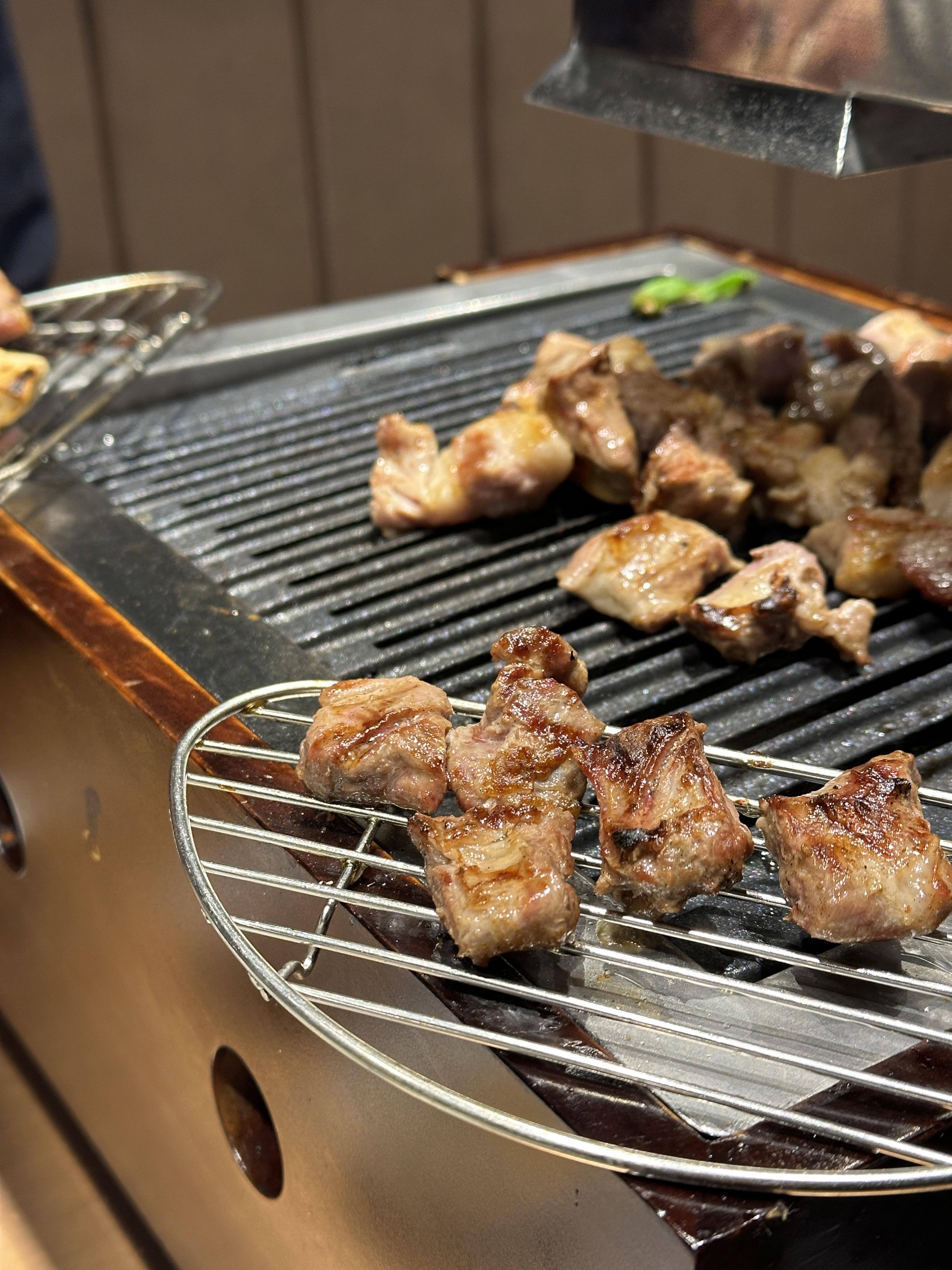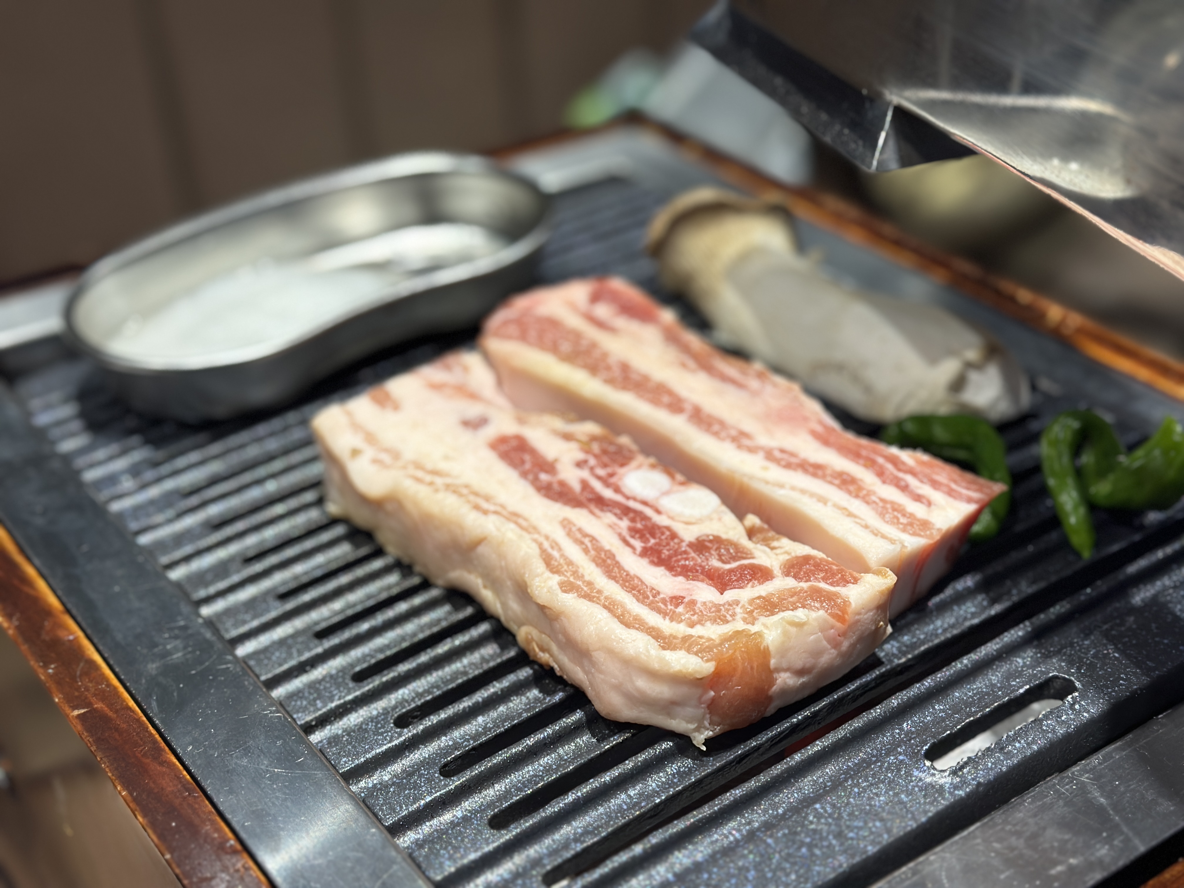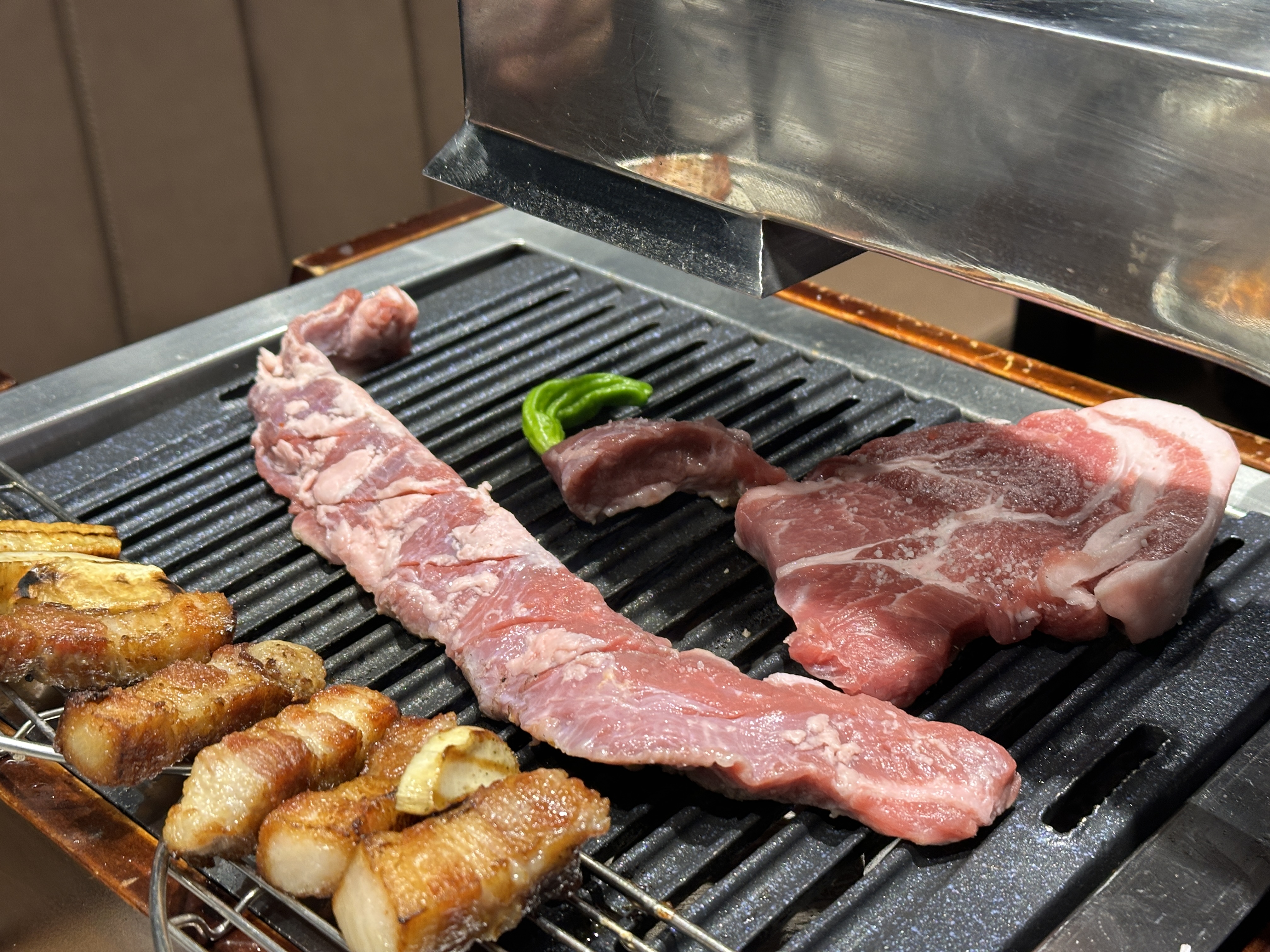3명이다보니 2인분으로 먼저 시킨 고기가 다 떨어질 쯤, 추가로 갈비살과 목살을 시킵니다. 역시 색깔부터 다르죠? 잘 익혀주시는 데 역시 먹기 좋아보입니다.