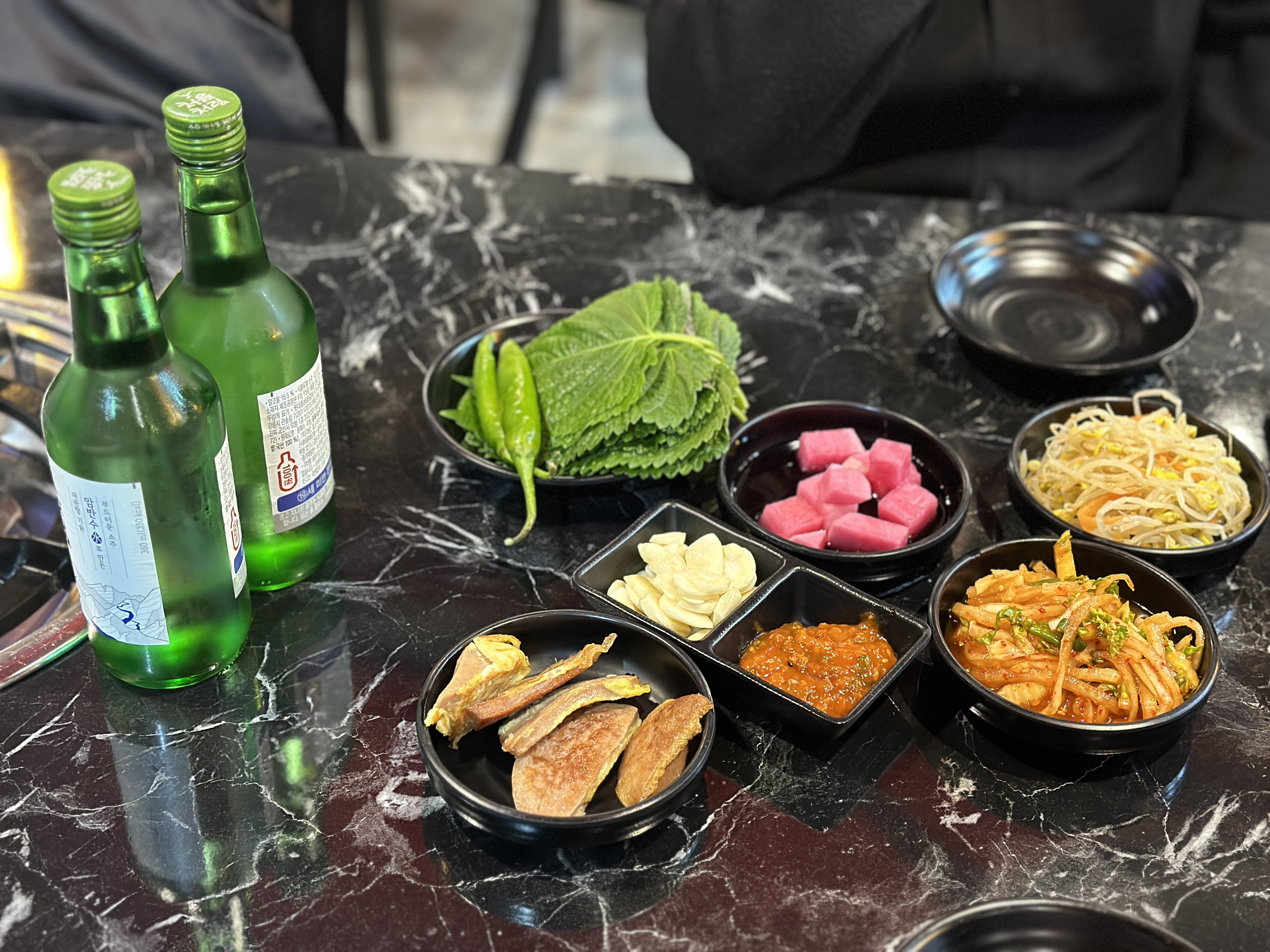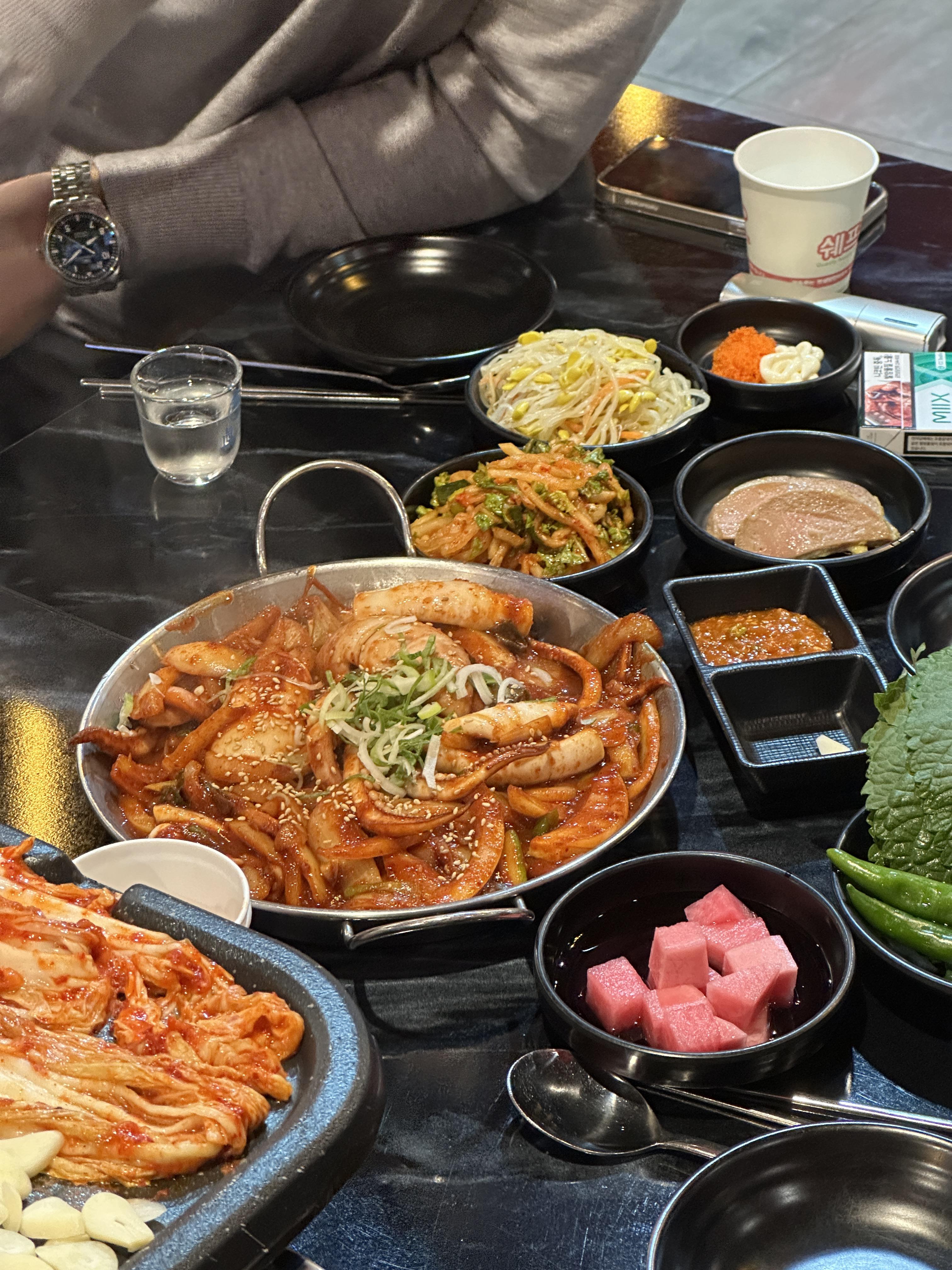 간단하게 삼겹살과 오징어볶음 등 세트구성으로 주문했습니다. (사진을 못찍었네요) 바로 사장님께서 사진과 같이 밑반찬을 세팅해 주십니다. 오랜만에 분홍소세지도 만났네요 ㅋㅋㅋ 맛 자체는 괜찮은 편입니다.