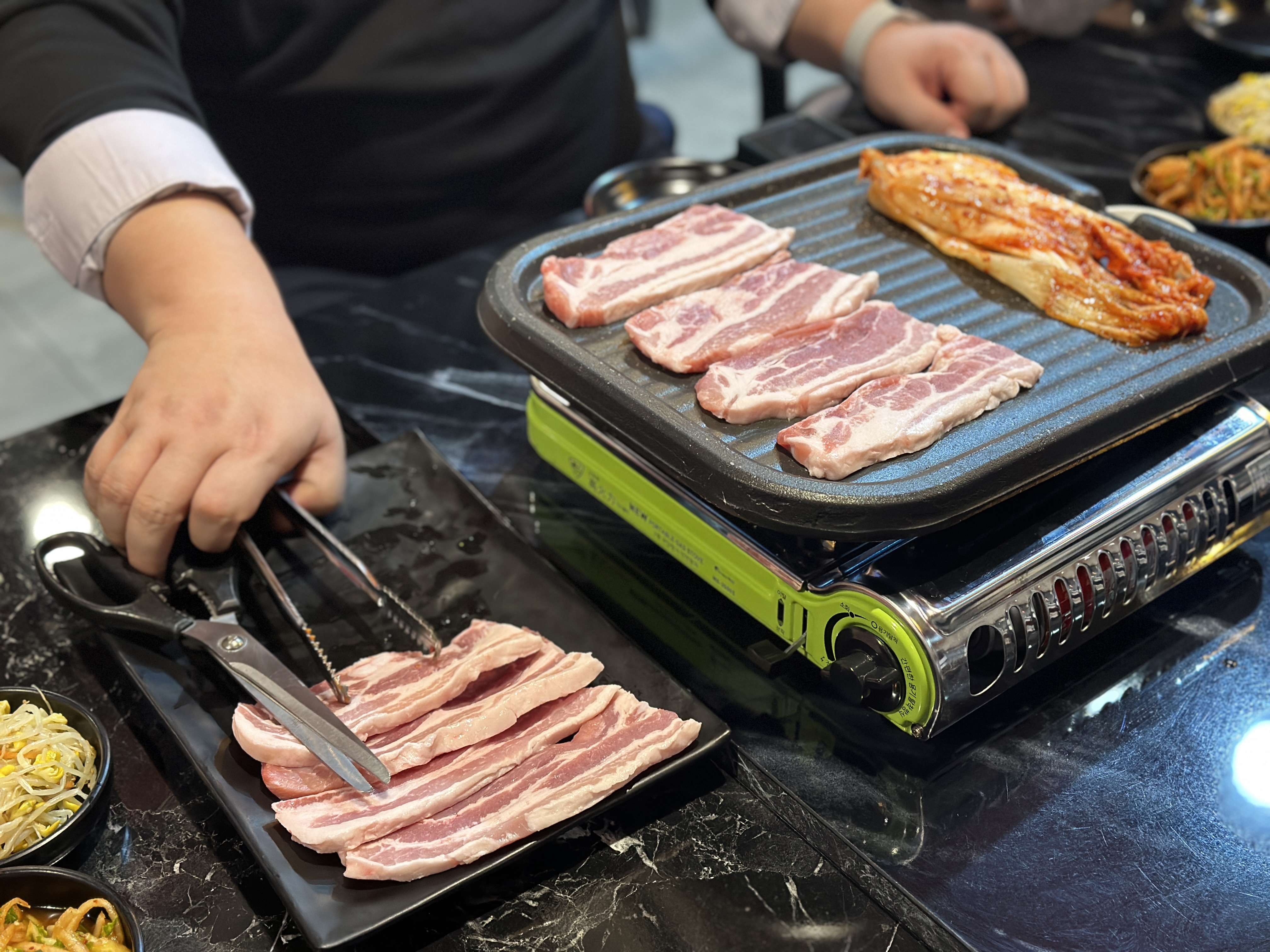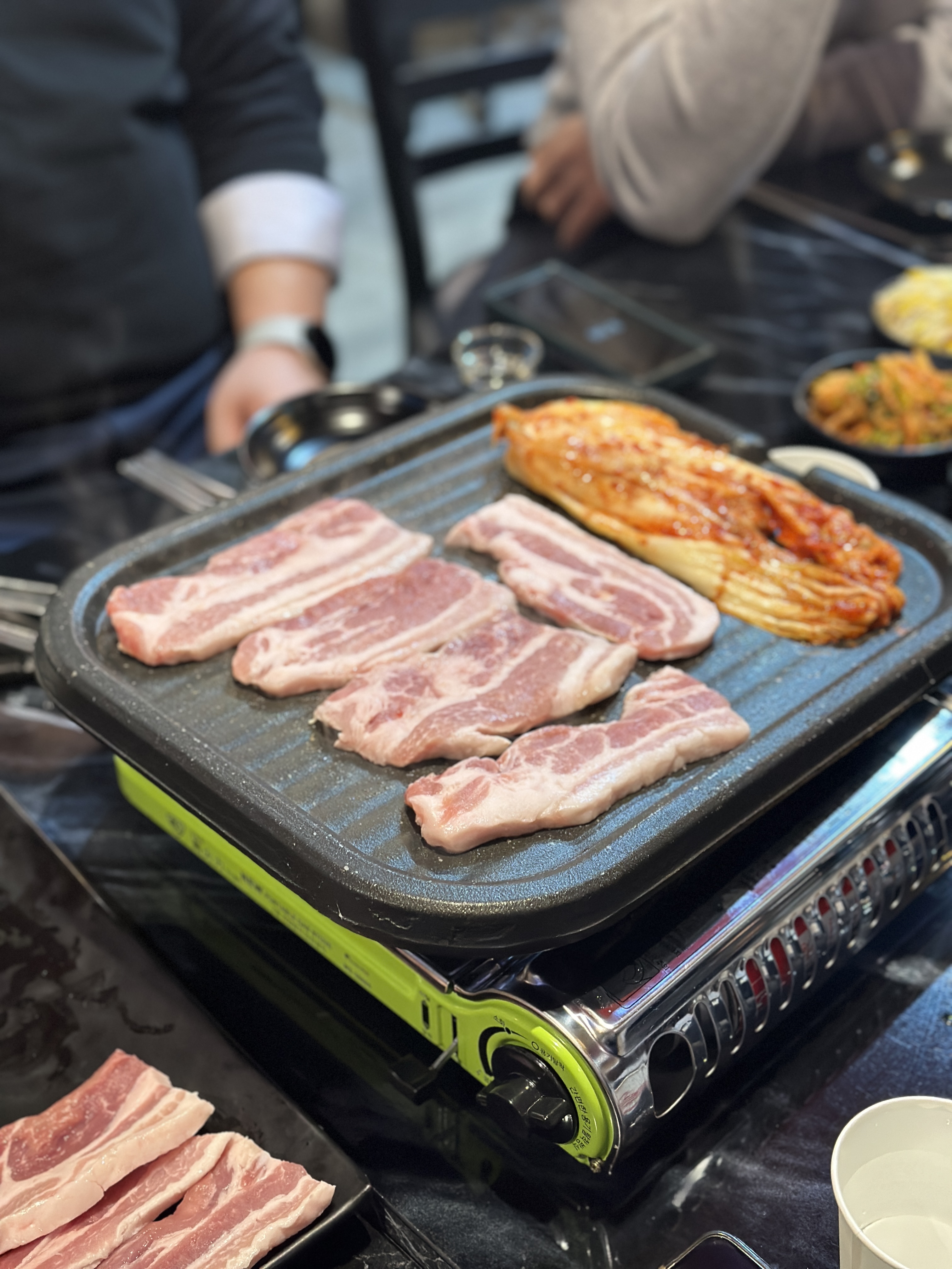 삼겹살을 주문하니 정말 정겨운 부르스타와 삼겹살, 김치가 등장합니다. 신나게 구워봅니다. 맨날 숯불에 구운 두꺼운 삼겹살만 먹다보니 이런 삼겹살도 정감있네요 ㅋㅋㅋ 만족스럽습니다.