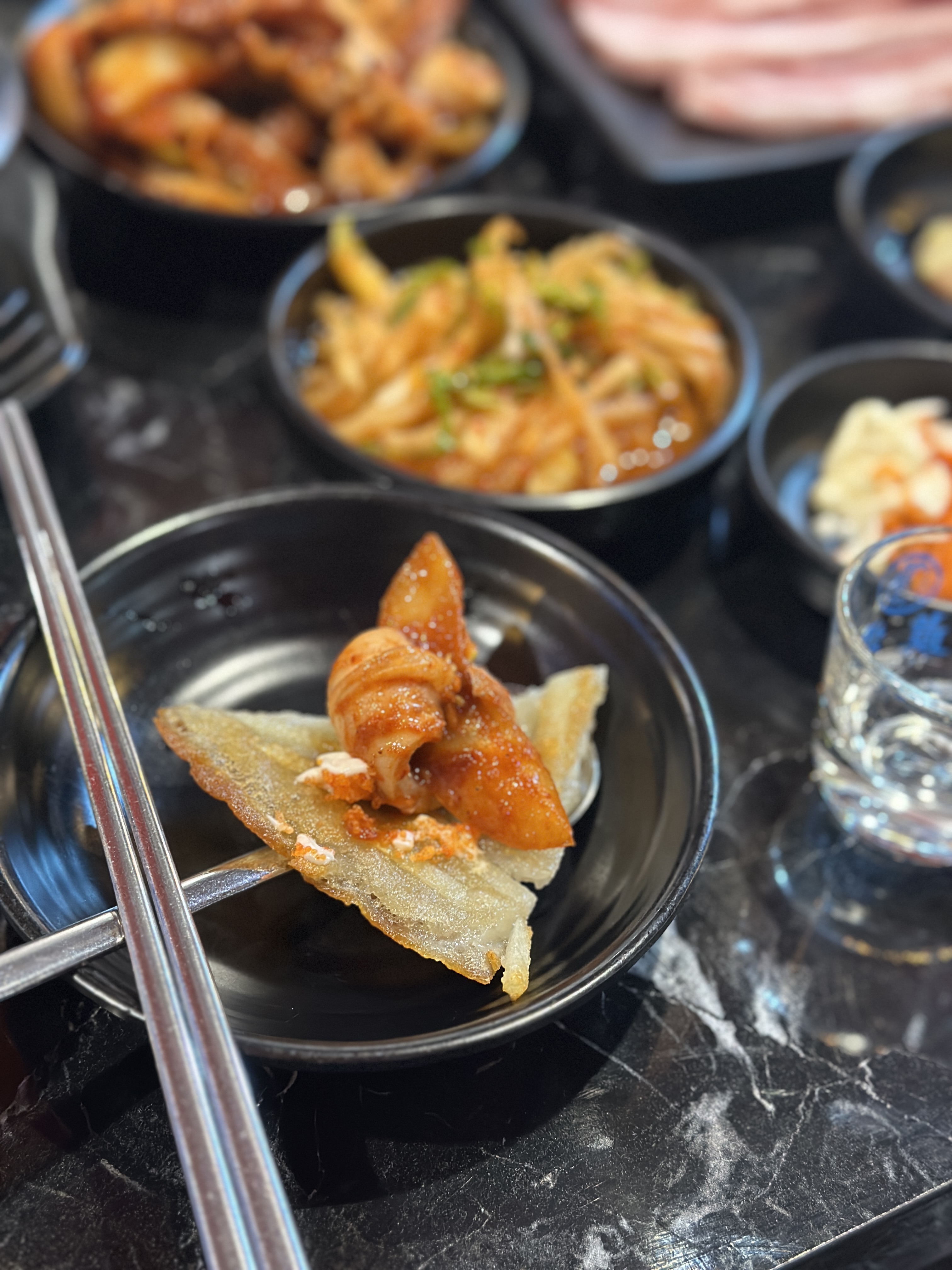 더팔당 왕십리점의 감자전은 생각보다 괜찮았습니다. 세트메뉴 구성에 있어서 시킨 것이긴 하지만, 바삭하게 잘 구워진 감자전 덕분에 입이 아주 즐거웠습니다. 사진처럼 오징어볶음을 한 점 올려서 함께 먹는 것도 좋은 구성입니다.