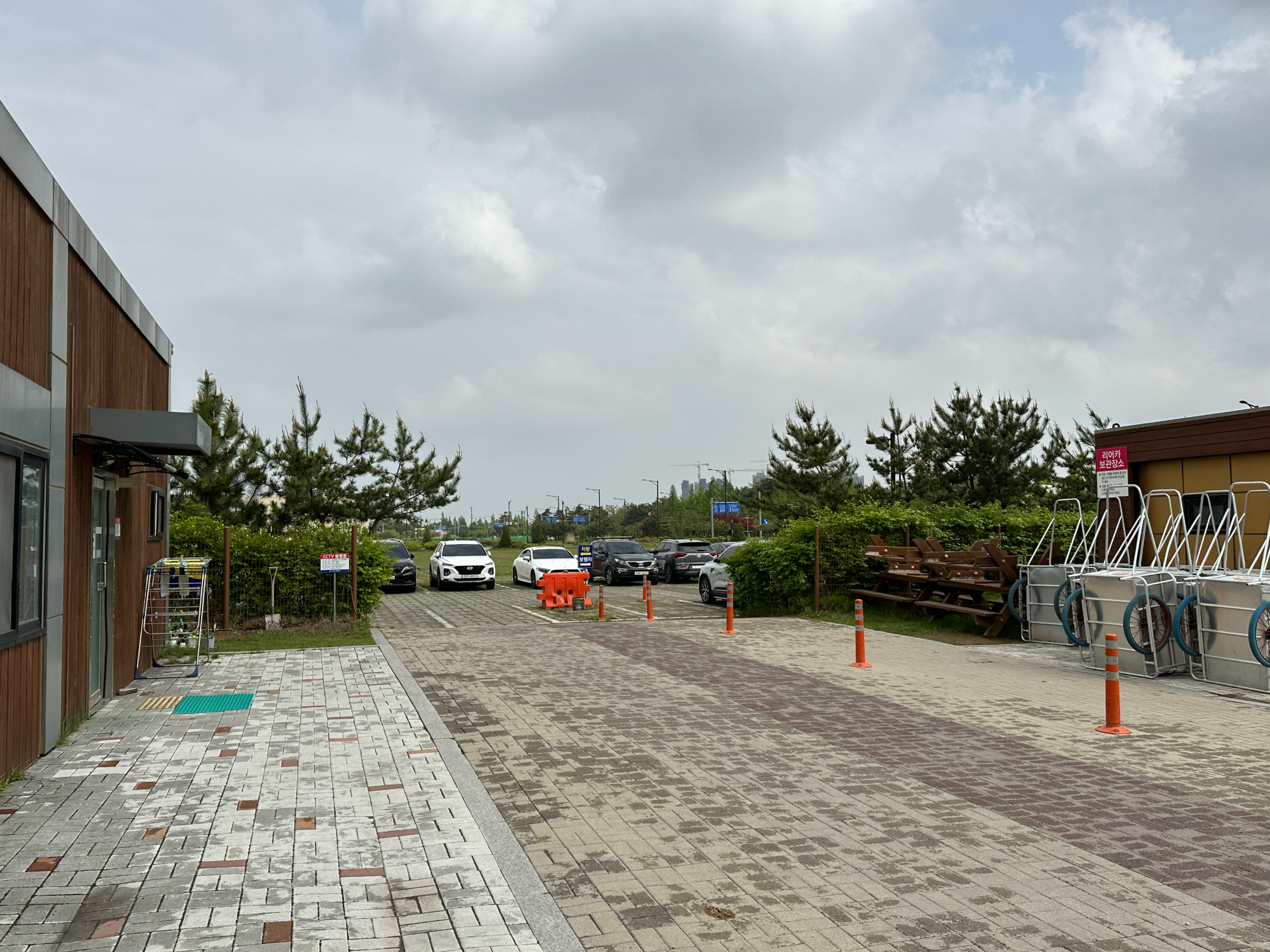 관리동에서 나오면, 이렇게 주차장이 뒤편에 있습니다. 오토캠핑장과 6인 카라반은 사이트 내부에 주차를 할 수 있으나, 시민가족캠핑장과 4인 카라반은 여기의 주차장을 활용하여 주차 후 옆에 비치된 리어카로 짐을 이동하는 개념입니다.