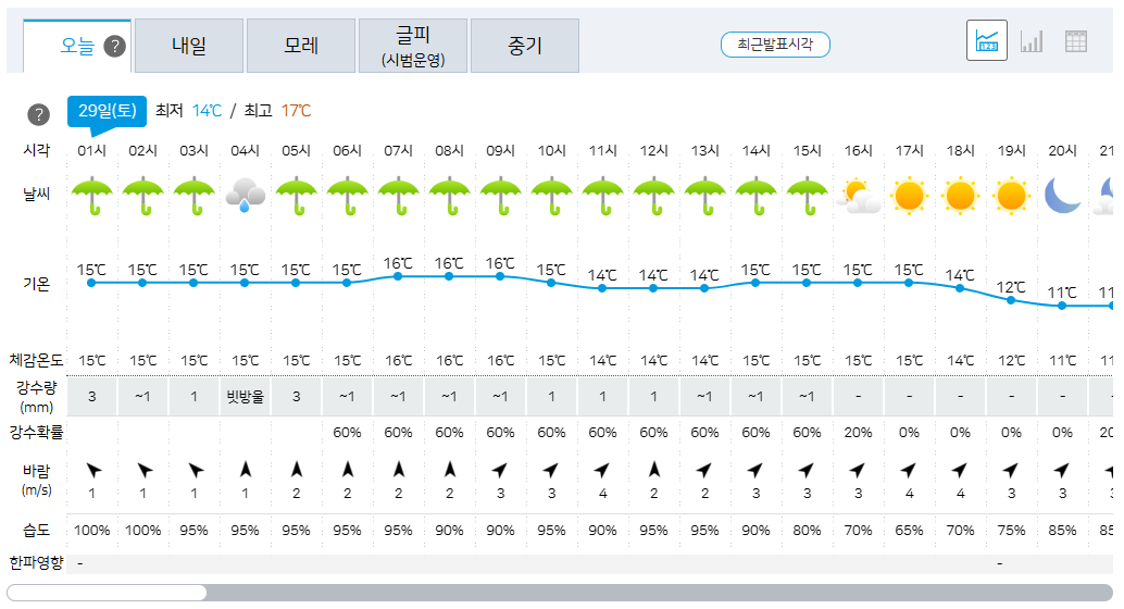 단기 예보를 확인 후, 풍속까지 확인합니다.