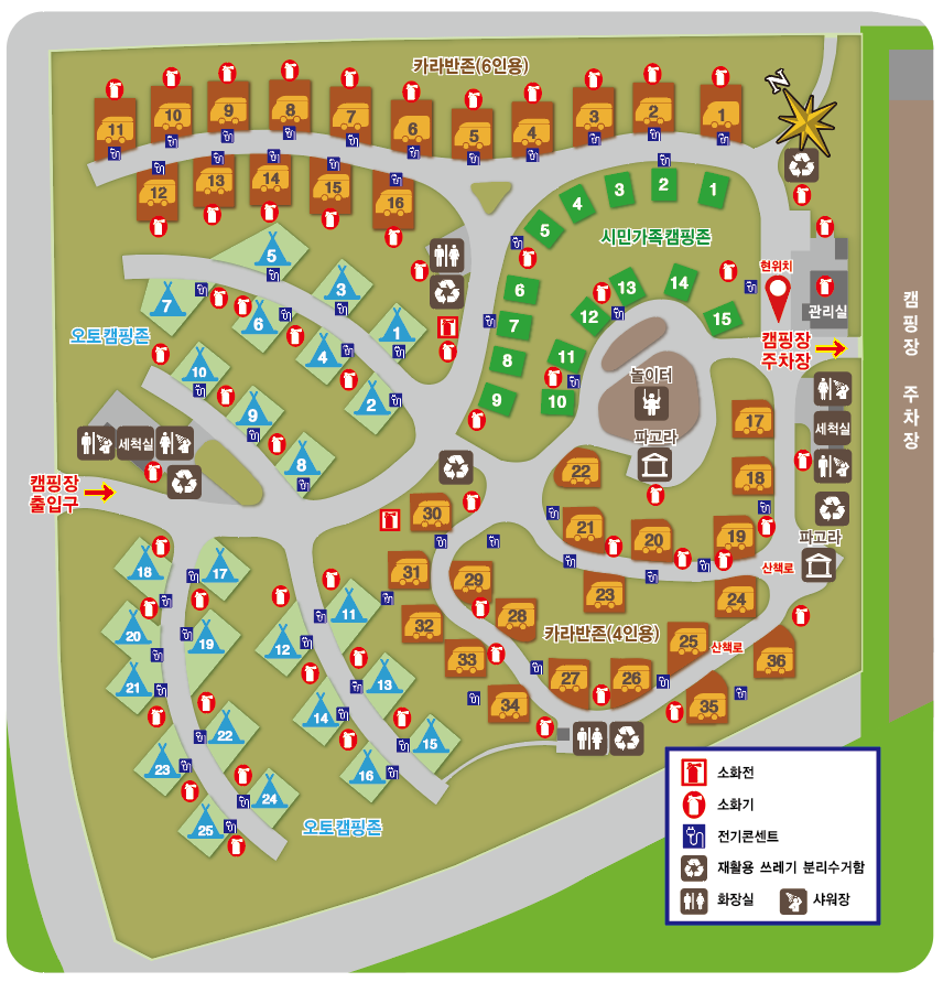 - 카라반존은 6인용 구역에는 차량을 옆에 주차가 가능했고, 4인용은 캠핑장 주차장에 주차 후 이용해야 합니다.