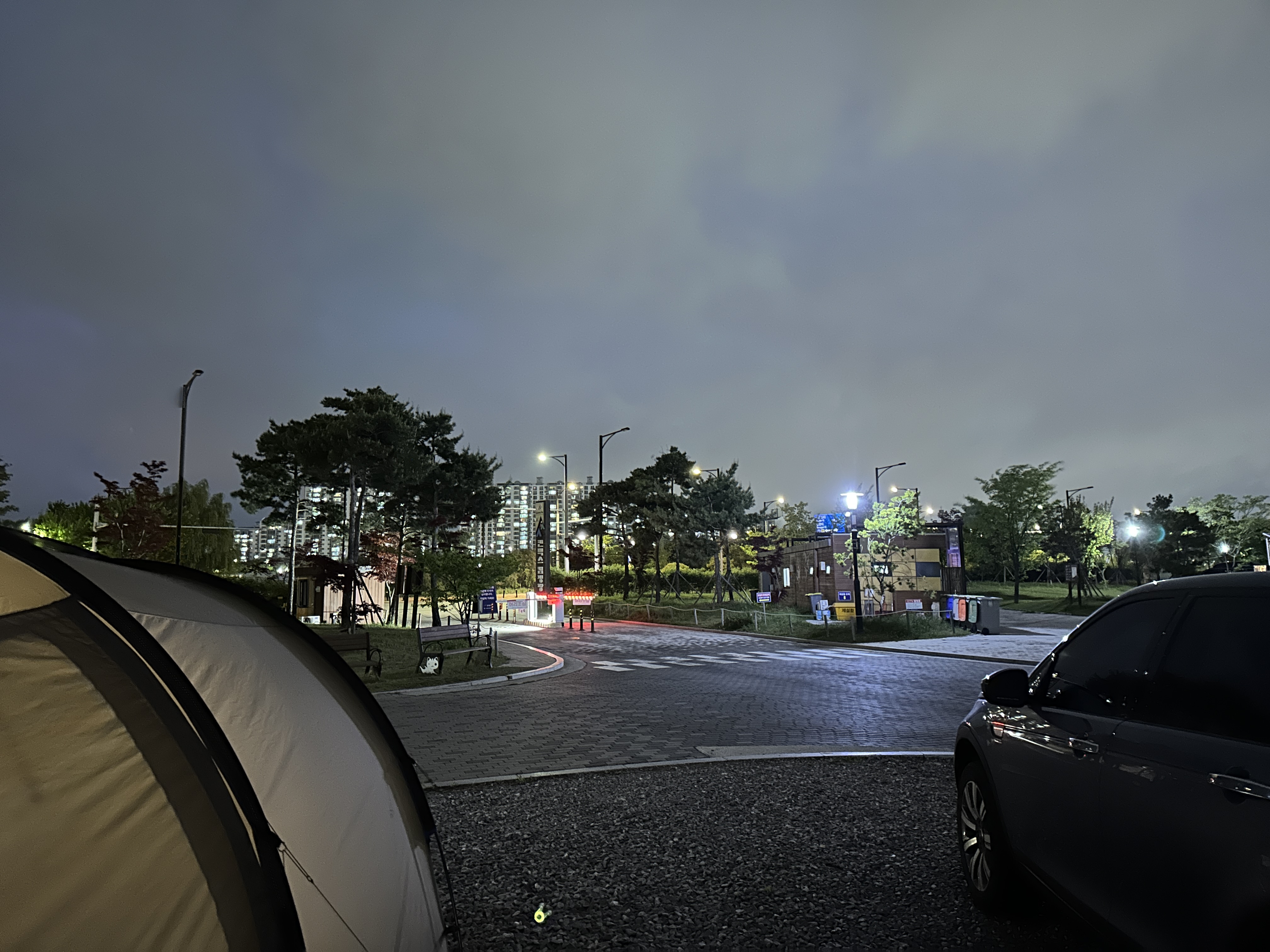 밤에 설치 후, 입구쪽을 바라본 모습입니다. 사이트가 아무래도 입구 바로 앞이고, 세척장을 가는 오토캠핑장 이용객들은 이 앞 길을 이용해야 하니, 차량 및 사람 이동하는 소리가 들릴 수 있습니다. ㅎㅎ