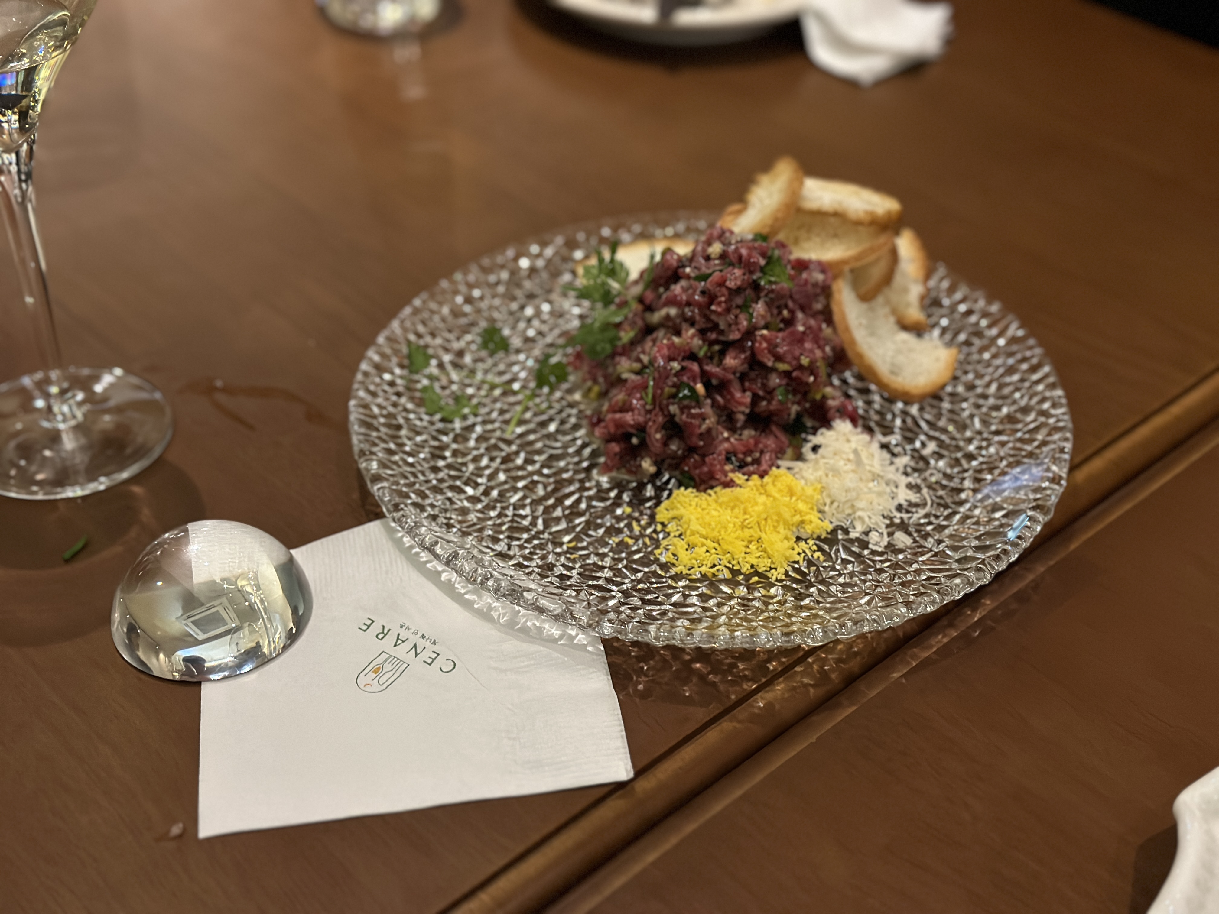 이탈리안 레스토랑 체나레 인 서촌(CENARE IN 서촌)의 Beef Tartare(육회)입니다. 바게뜨빵에 치즈를 얹고 고기를 얹어서 먹는데, 너무 맛이 좋았습니다. 감칠맛도 좋았고, 짜지 않은 식감도 마음에 들었답니다. 만족스러웠어요.
