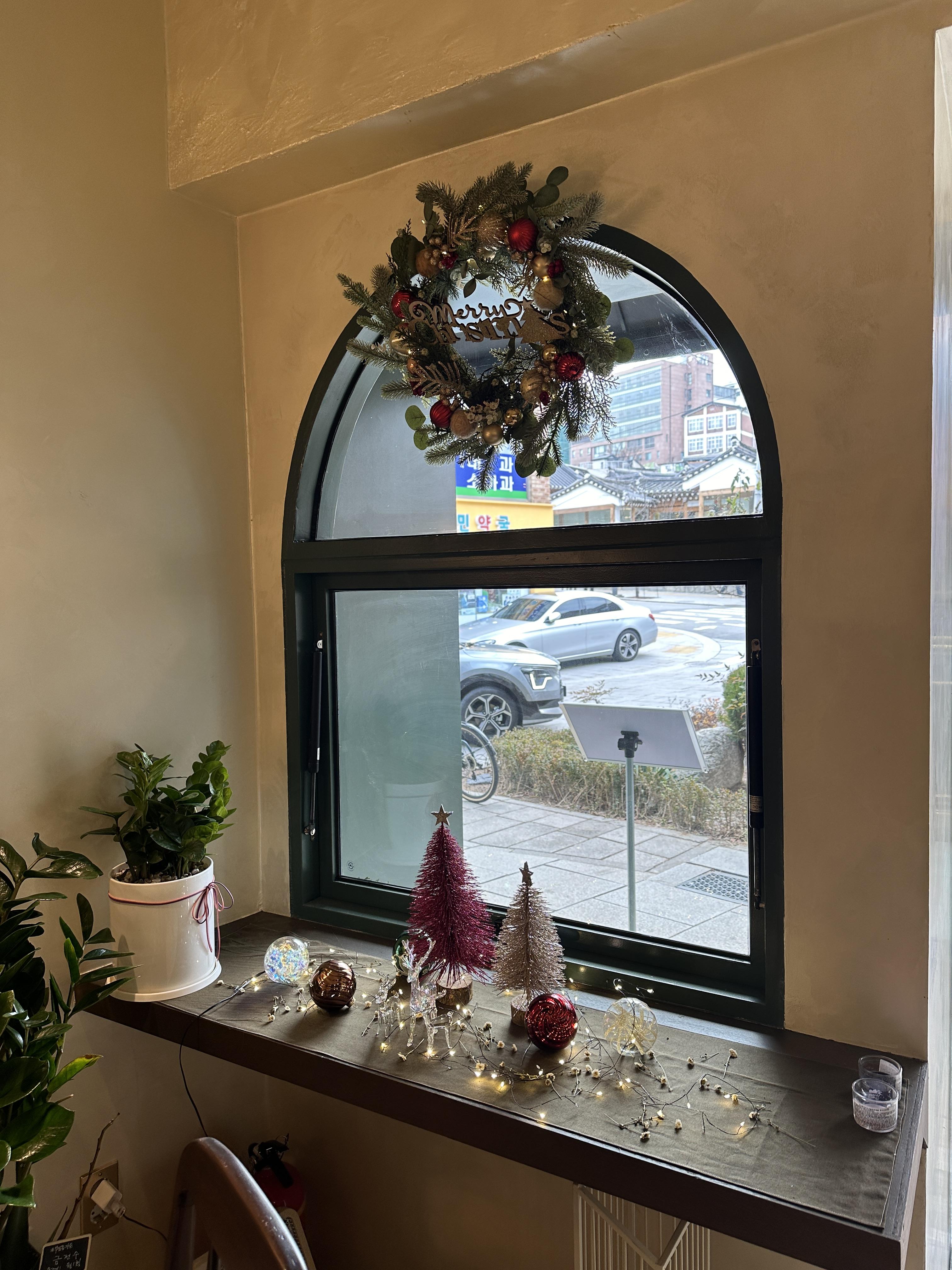 이탈리안 레스토랑 체나레 인 서촌(CENARE IN 서촌)의 인테리어입니다. 입구에서 바로 옆 창가 난간에 크리스마스 시즌임이 한 눈에 보이는 데코들이 예쁘게 자리하고 있습니다. 귀여운 트리도 하나 보이구요.