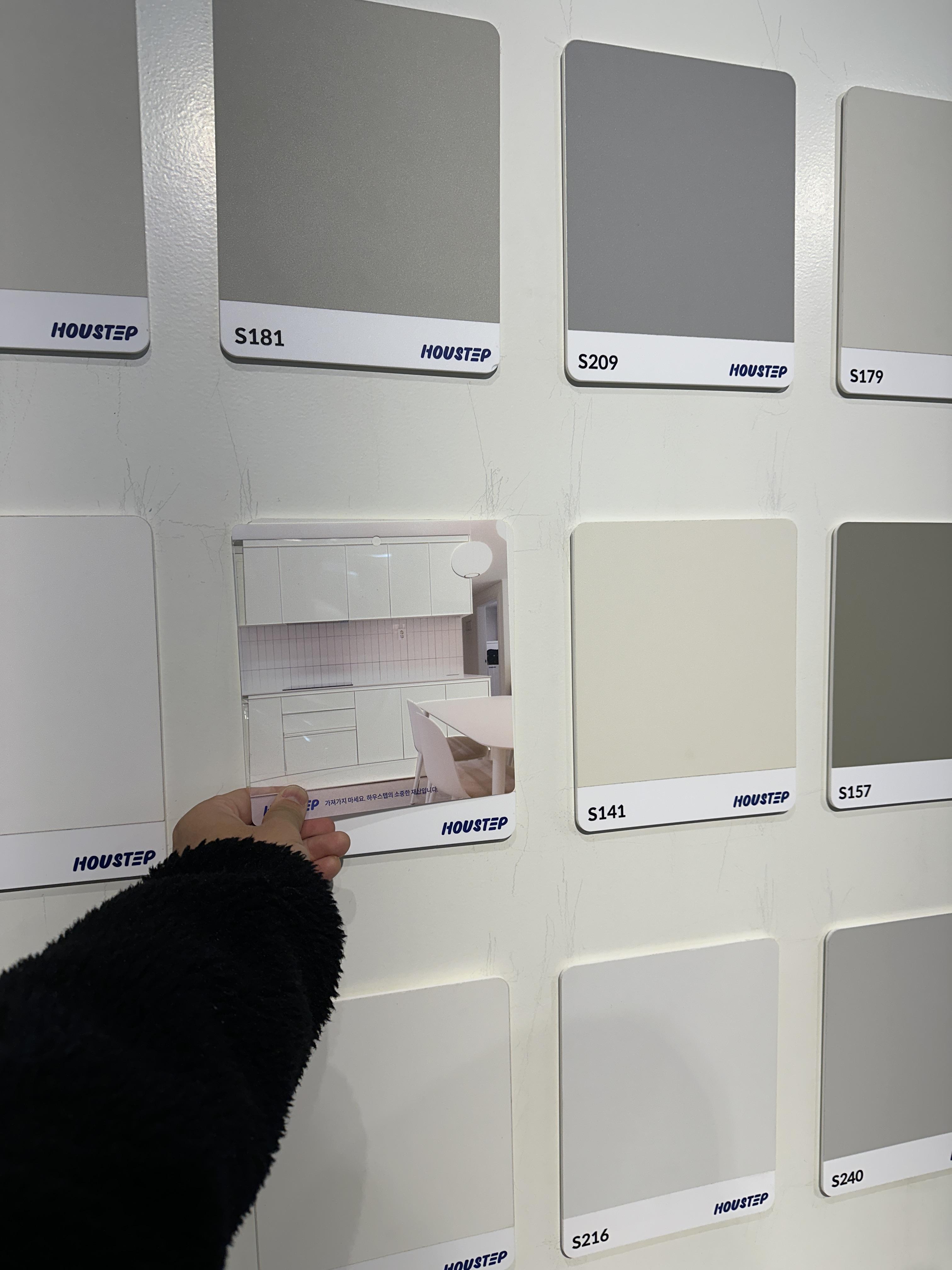 하우스텝을 재미있게 즐기는 방법 중 하나인 자재 체크 방법입니다. 해당 자재에 주방/거실 등의 투명 필름을 대서 확인을 해볼 수 있었습니다. 전체적인 느낌, 분위기를 편하게 볼 수 있었습니다.