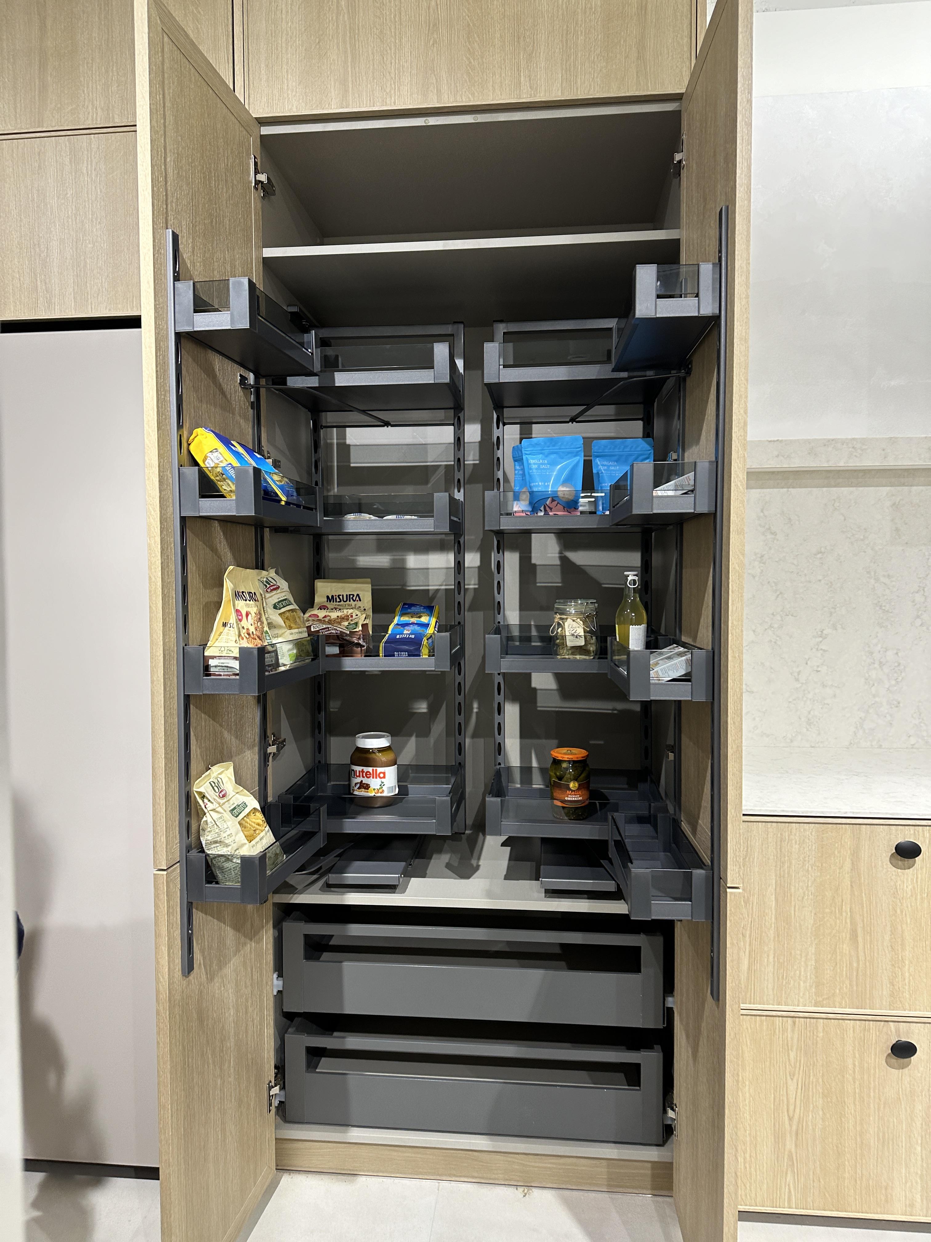 음. 이건 처음에 보고, 코너 공간을 잘 쓰겠다!! 하고 신기해서 보았어요. 주루룩 끌려나오는게 신기하기도 하고요. 그런데 오히려 가만히 보니 공간 활용이 더 어렵겠다는 생각이 살짝 들었습니다. 어느정도의 규모있는 주방이 아니라면 고민을 많이 해야 할 것 같아요.