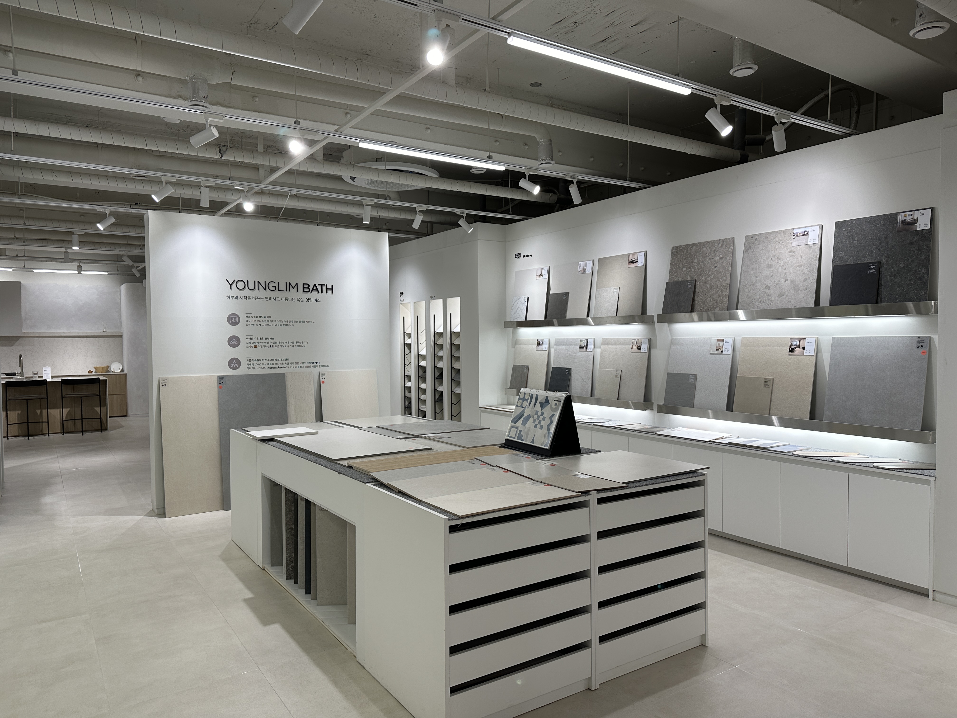 바스에 들어가는 타일 자재들이 6층 한켠에 자리하고 있습니다. 다양한 타일 자재로 원하는 느낌을 구현해 볼 수 있겠습니다. 물론 이것만 봐서는 뭐가 좋을지 잘 모르겠어요...ㅋㅋ