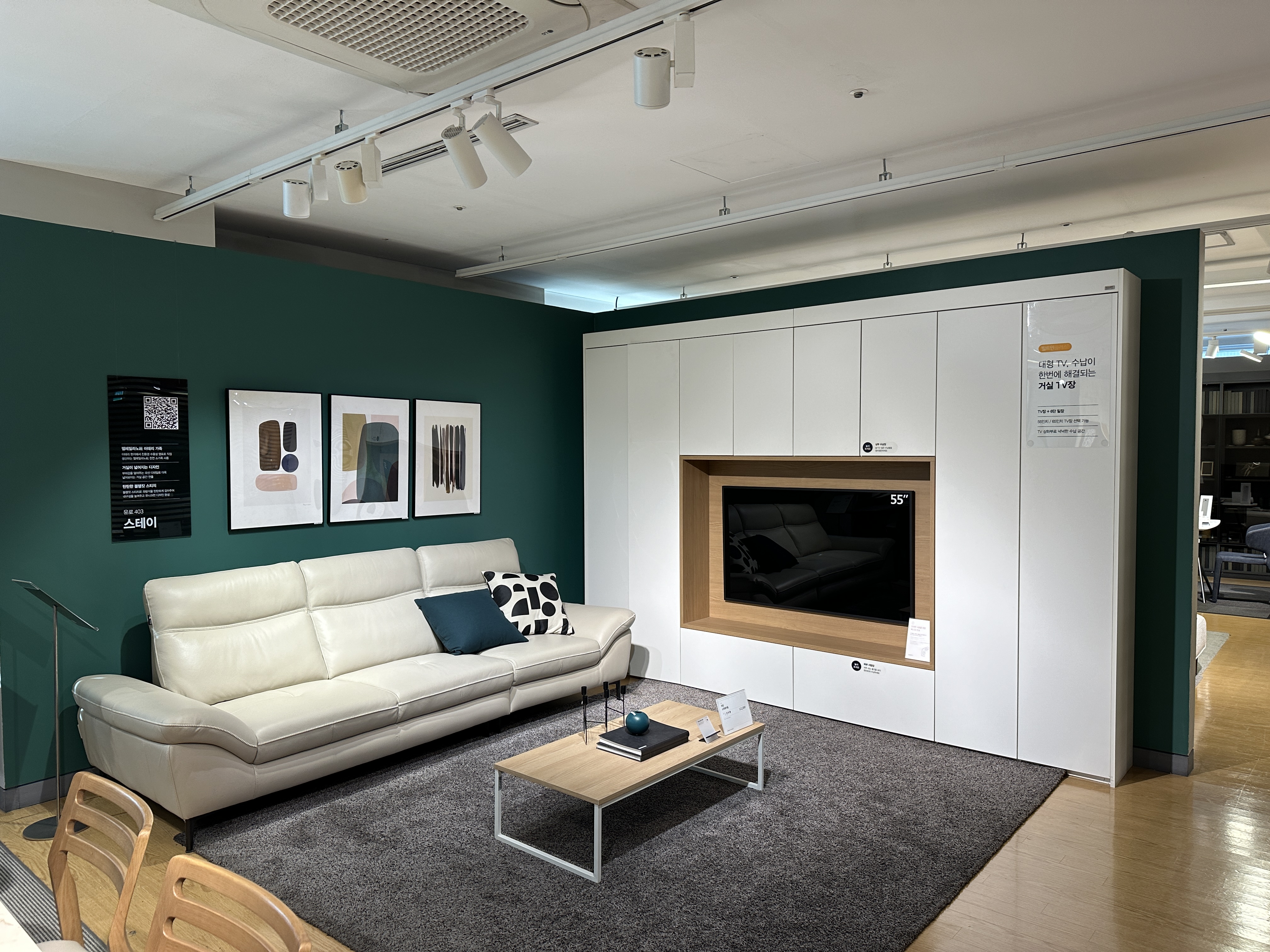 한샘디자인파크 논현점의 2층에 들어오시면 이렇게 바로 여러 컨셉의 거실을 마주할 수 있습니다. 소파+테이블+TV 등으로 구성해 놓은 모습입니다. 물론 다양한 컨셉인 것은 좋지만, 저는 개인적으로 이런 정형화된 방의 모습이 썩 좋지 않습니다. TV도 없앨거거든요.