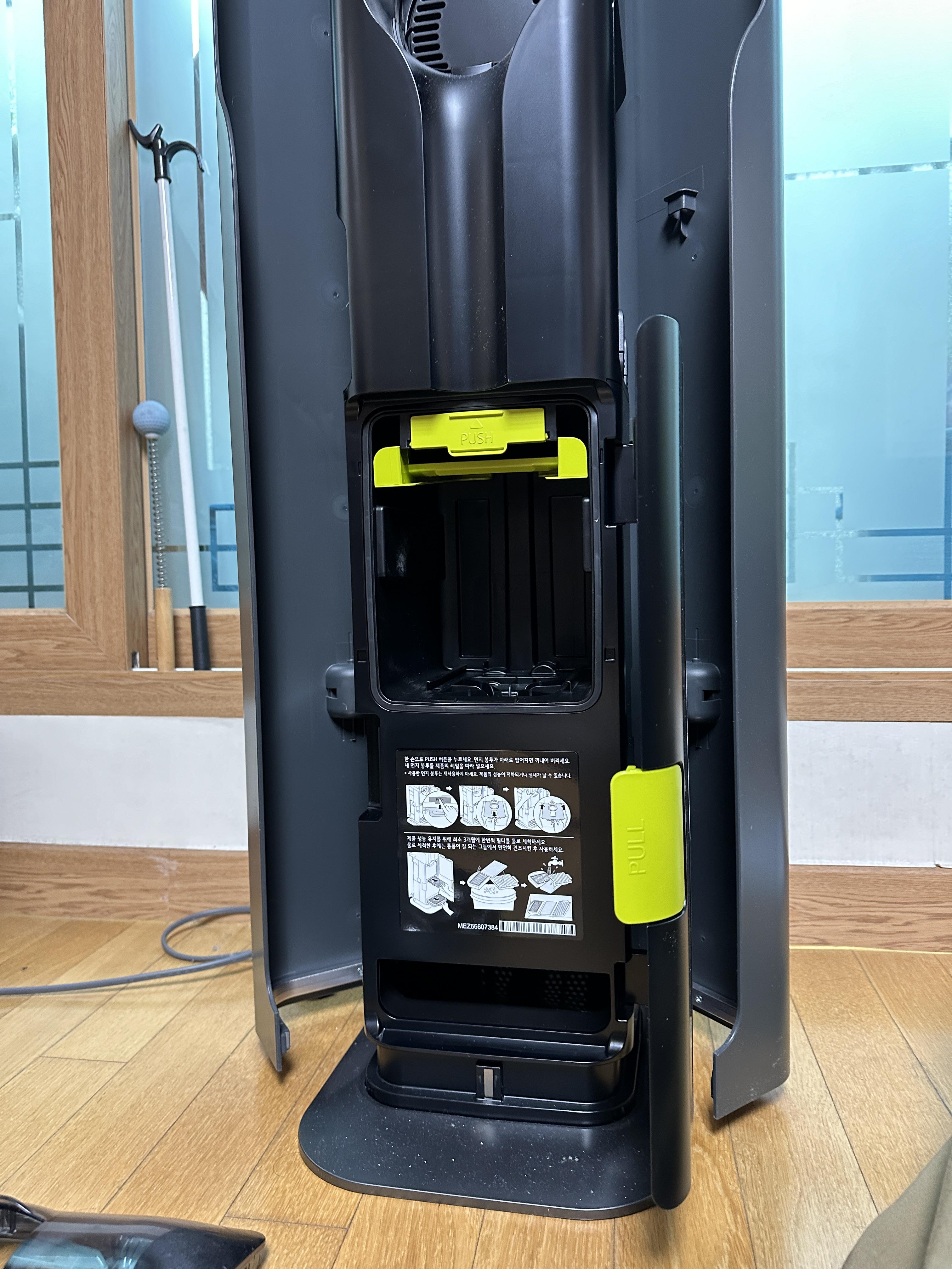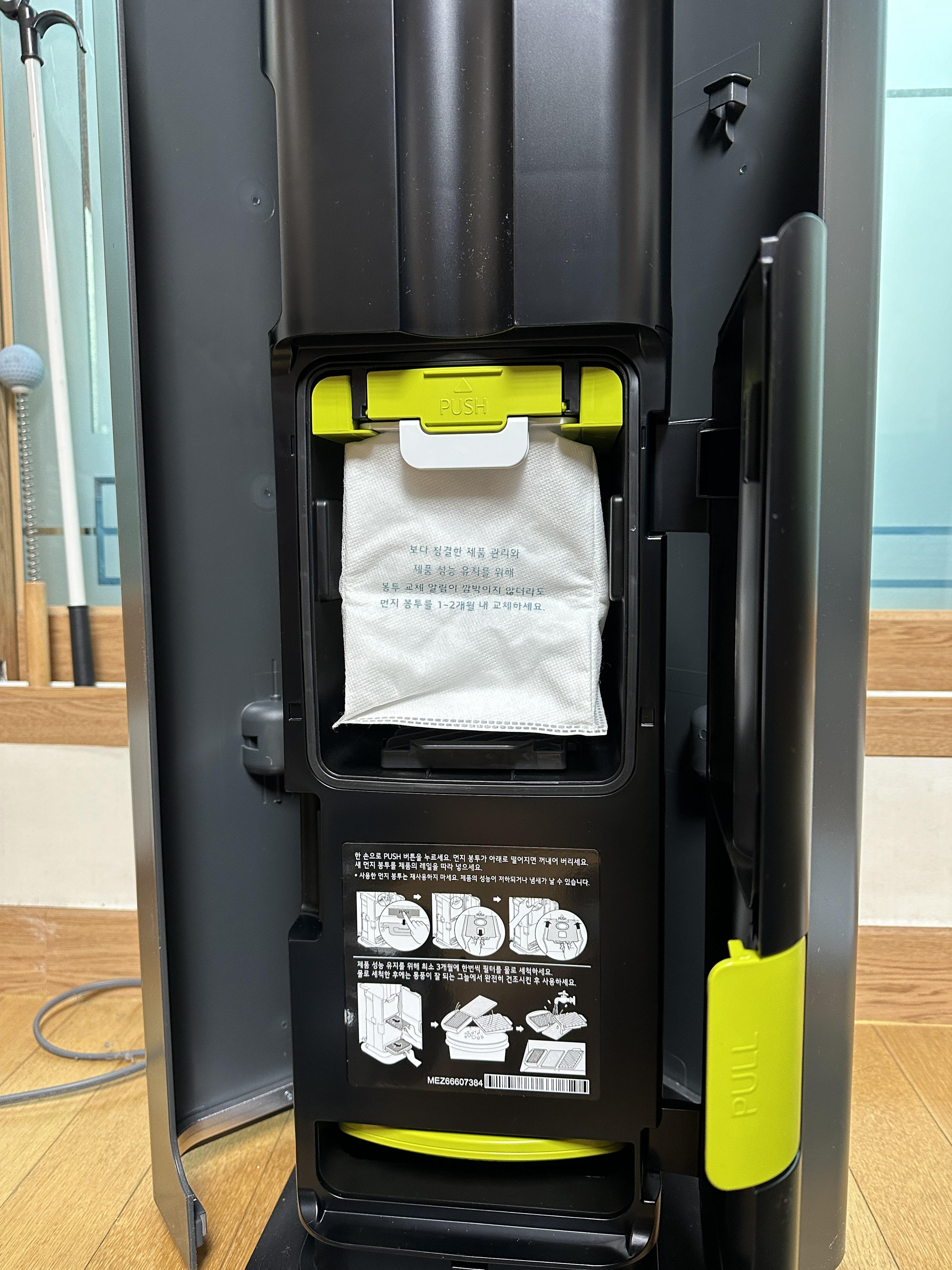 위의 녹색 PUSH버튼을 누르면 더스트백이 아래로 내려옵니다. 당겨서 빼시고 제거 후 버리시면 되는 간단한 구조예요. 그 반대로 넣어서 끼우시면 되구요.