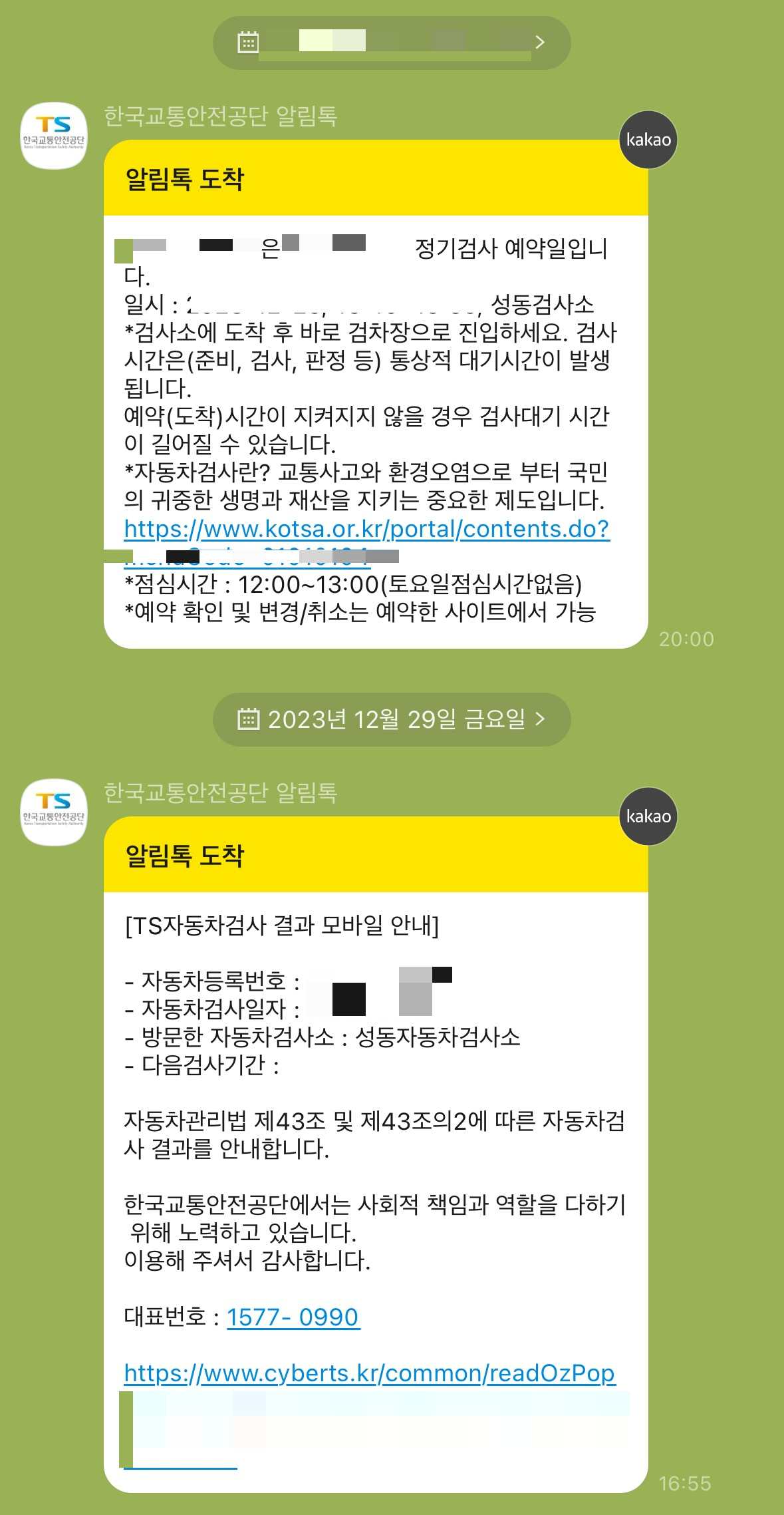 성동 자동차검사소 뿐 아니라 자동차 검사를 예약하시거나 마치실 때는 이렇게 알림톡이 오더라구요. 예전에는 안왔던 것 같은데 많이 편해졌죠. ㅋㅋ