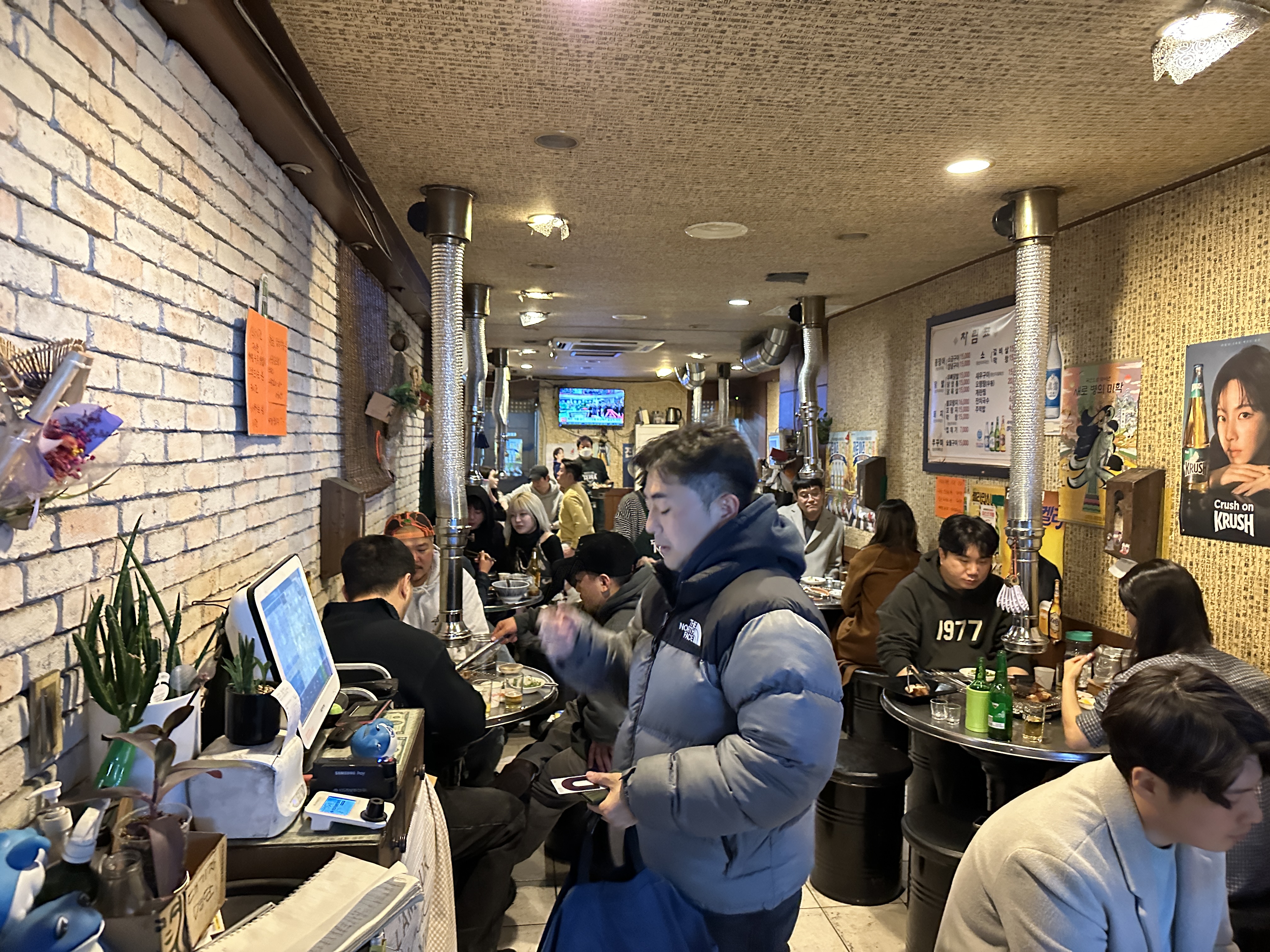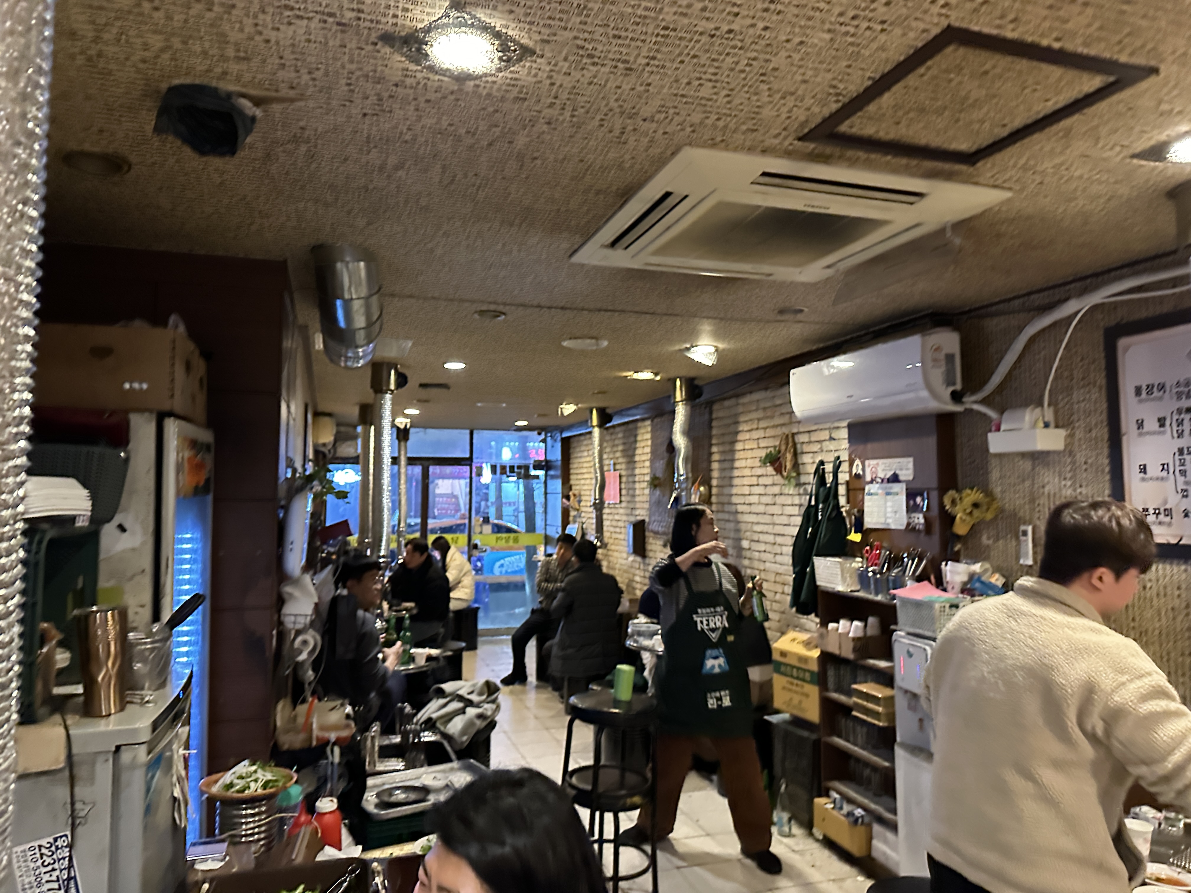 한남동 돼지꼬리 맛집 털보네꼼장어닭발의 내부 인테리어와 테이블 배치 입니다. 특별한 것은 없고, 숯불로 굽다보니 위에 환풍기가 달려있는 점이 특징이겠네요. 오래된 건물의 느낌 그대로입니다