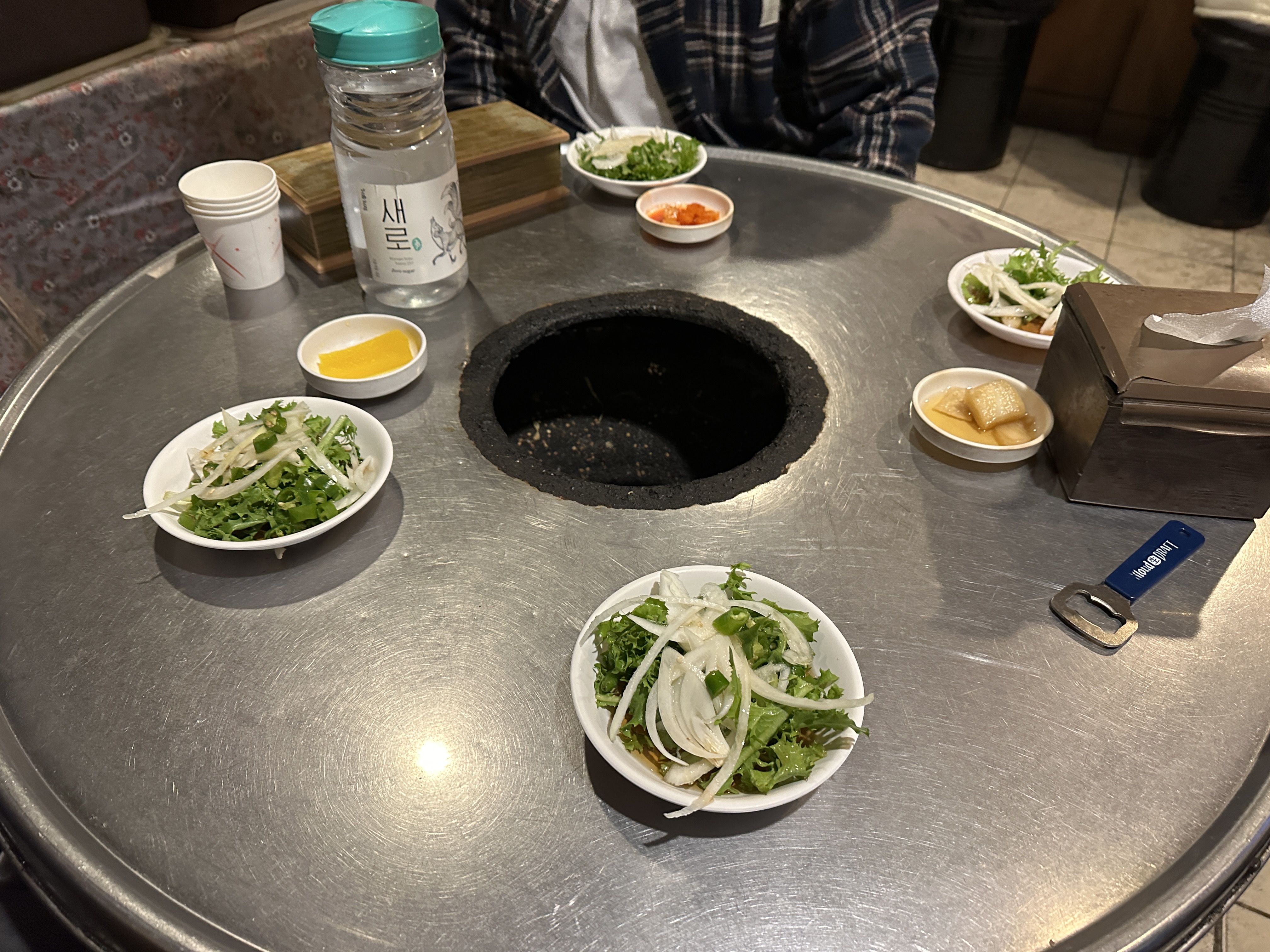 한남동 돼지꼬리 맛집 털보네꼼장어닭발의 테이블 세팅입니다. 일단 좌석에 앉으면 사장님께서 주문 받고 이렇게 세팅을 해주십니다. 단촐하고 심플한 느낌이 완전 마음에 들어요.