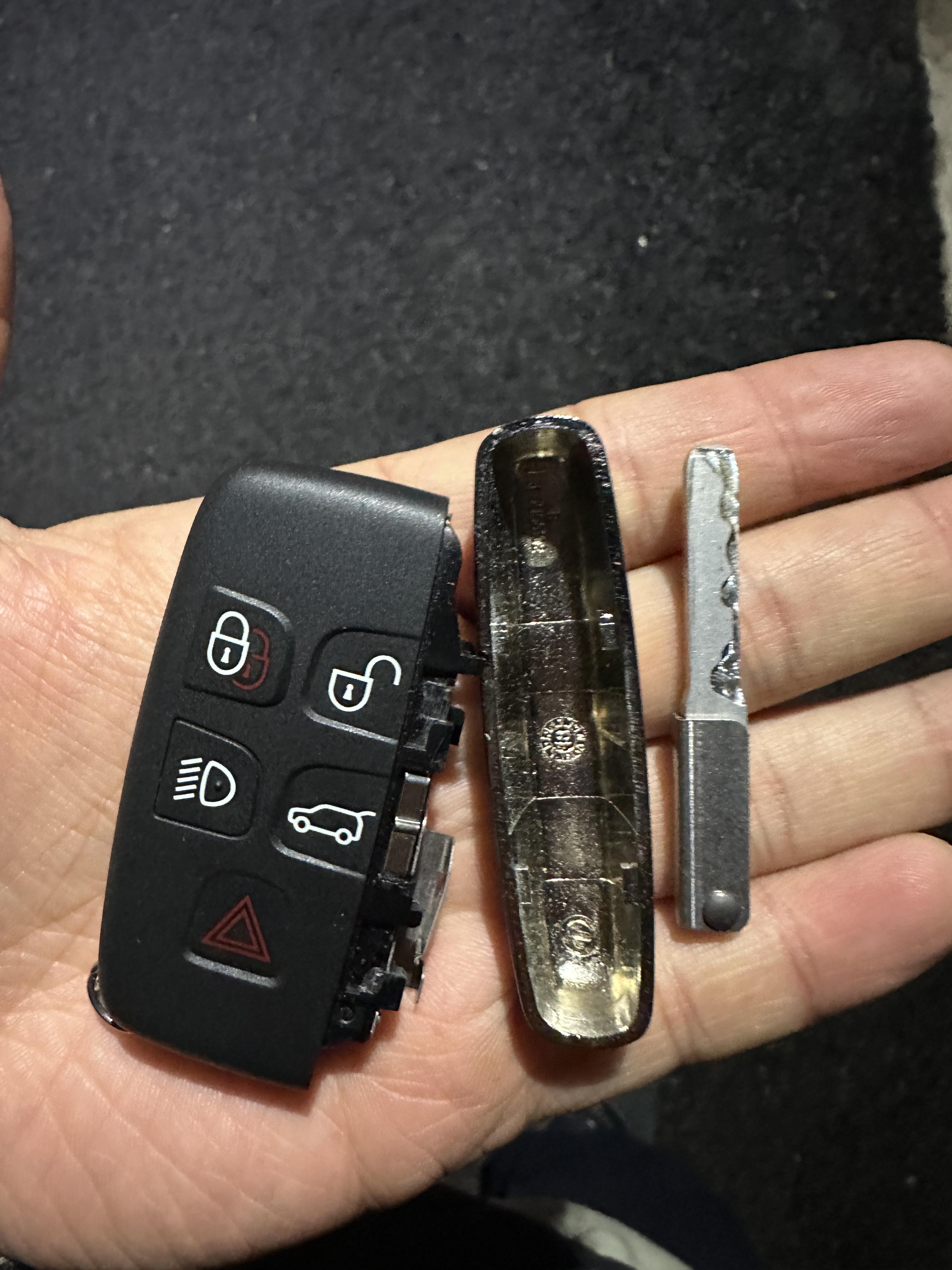 랜드로버 디스커버리스포츠의 스마트키의 모습입니다. 옆의 크롬으로 된 부분을 위로 밀어올리면 분해가 되는데요, 이 분해된 곳에 위치한 열쇠를 찾으실 수 있습니다.