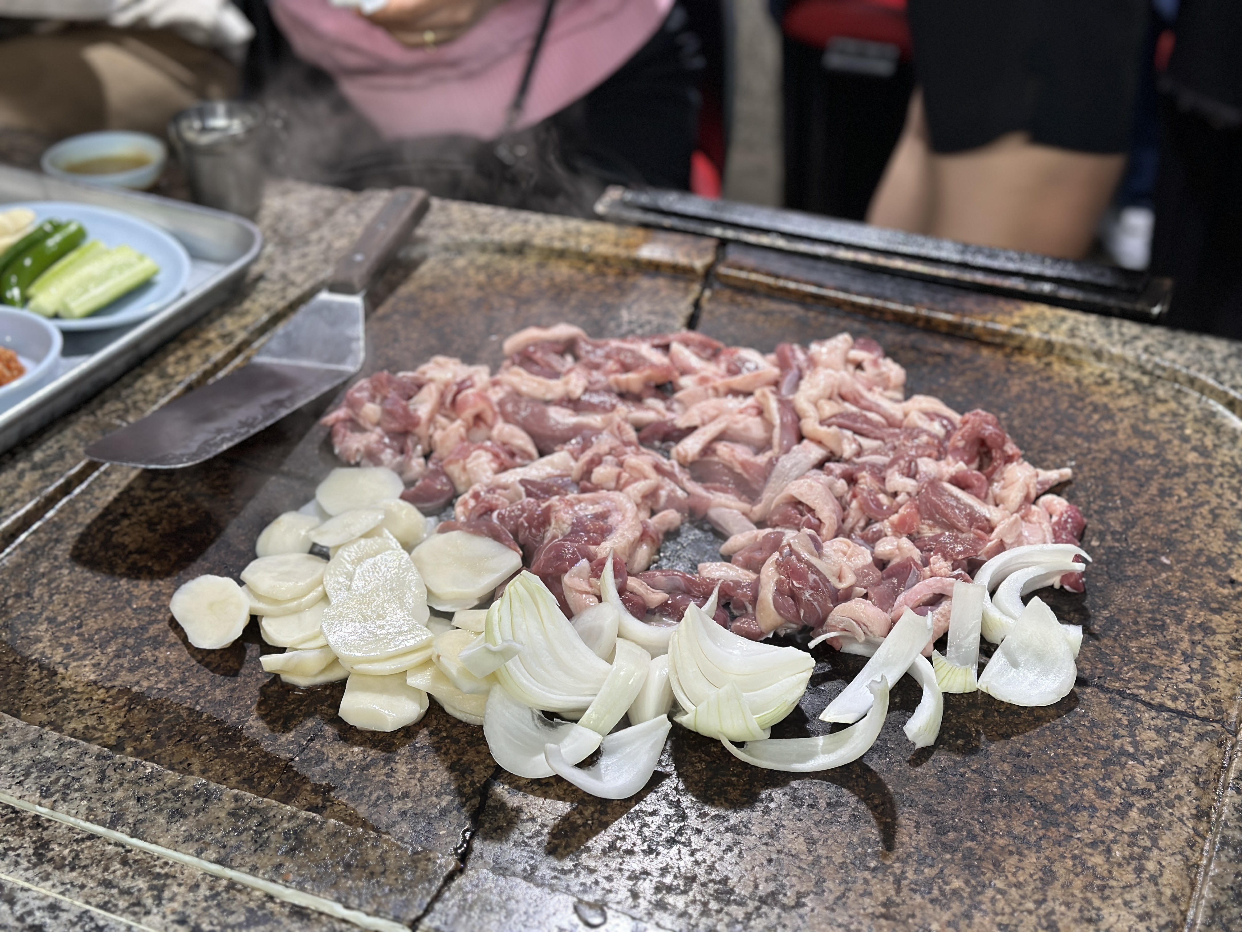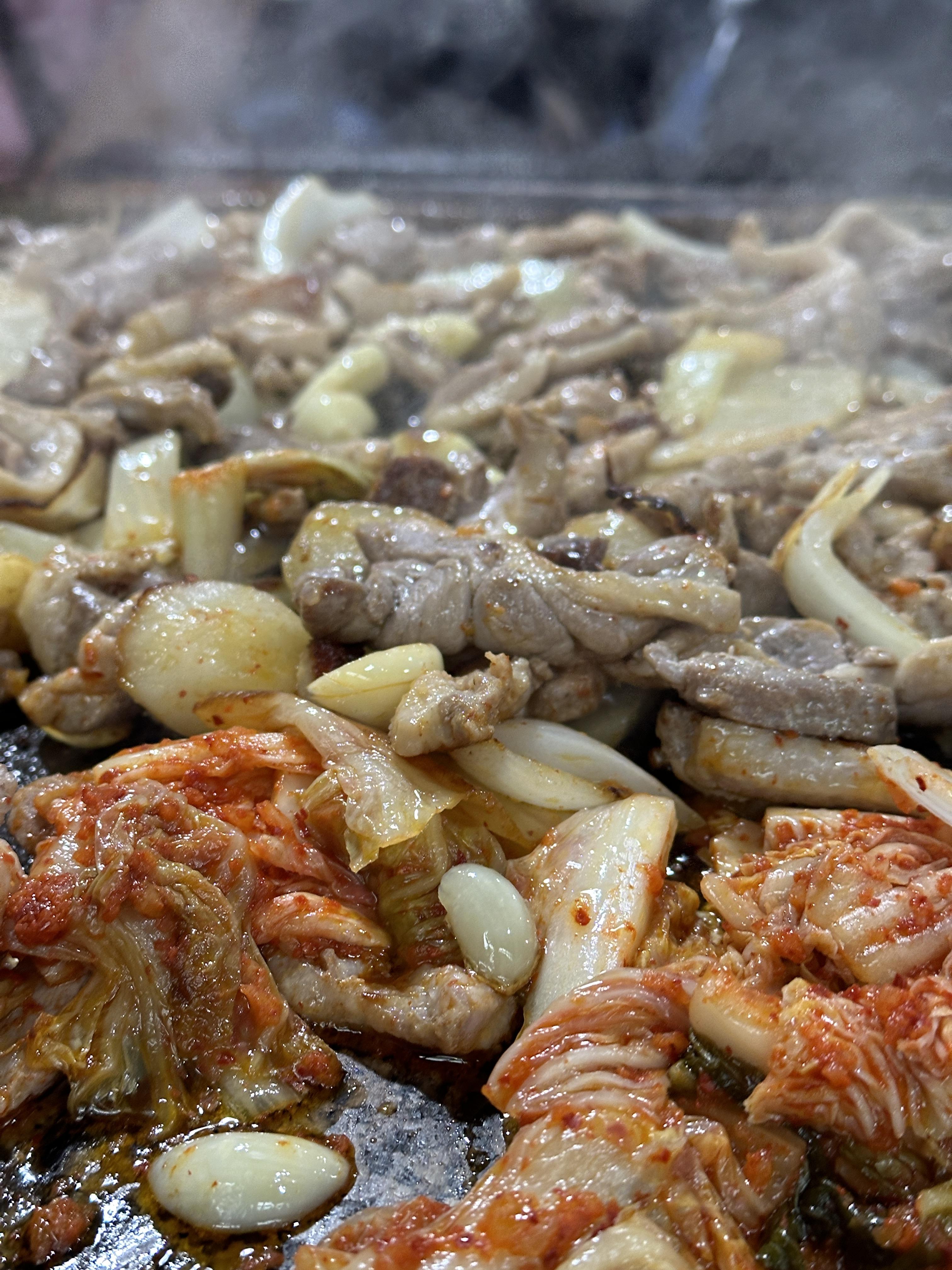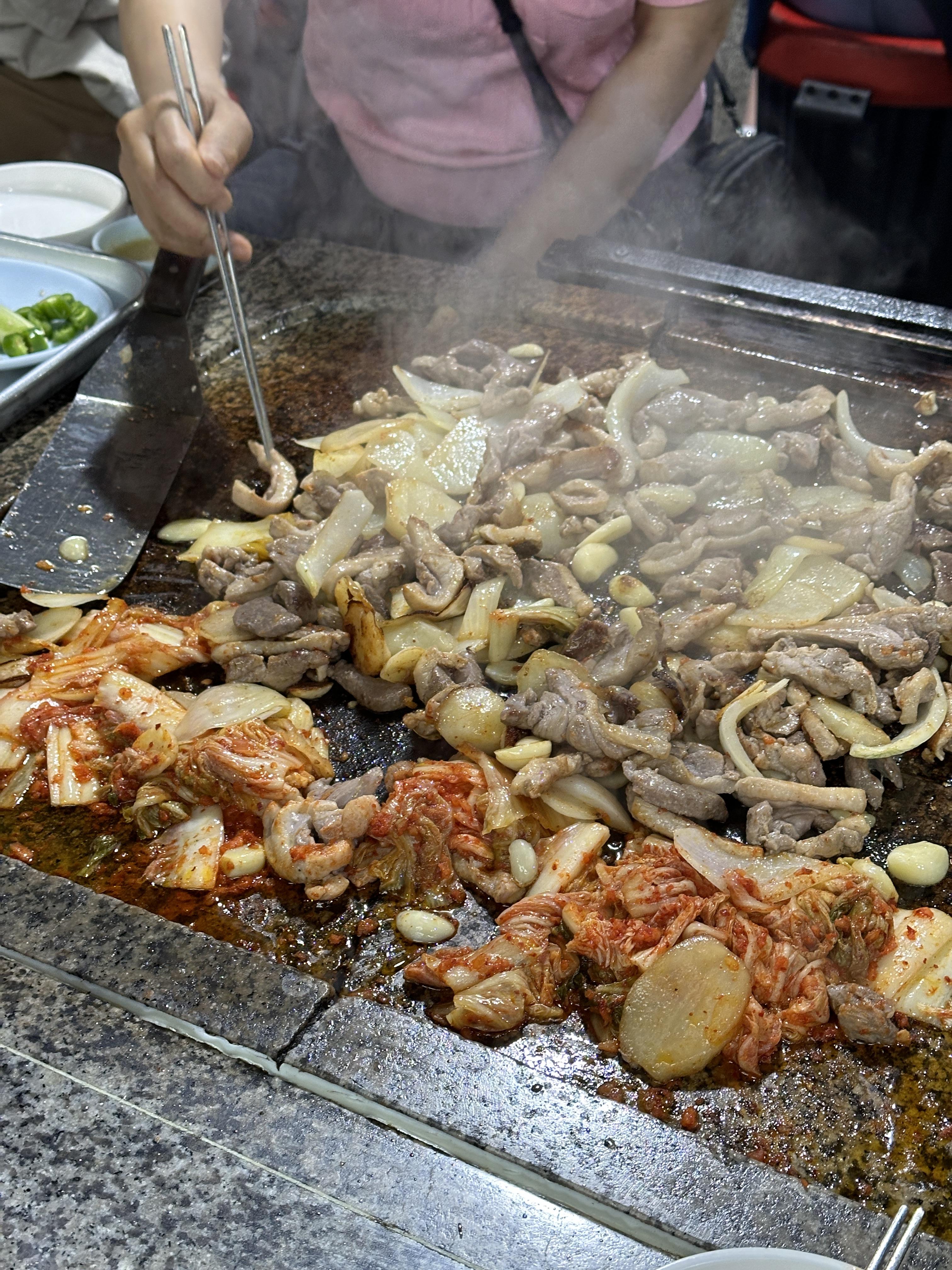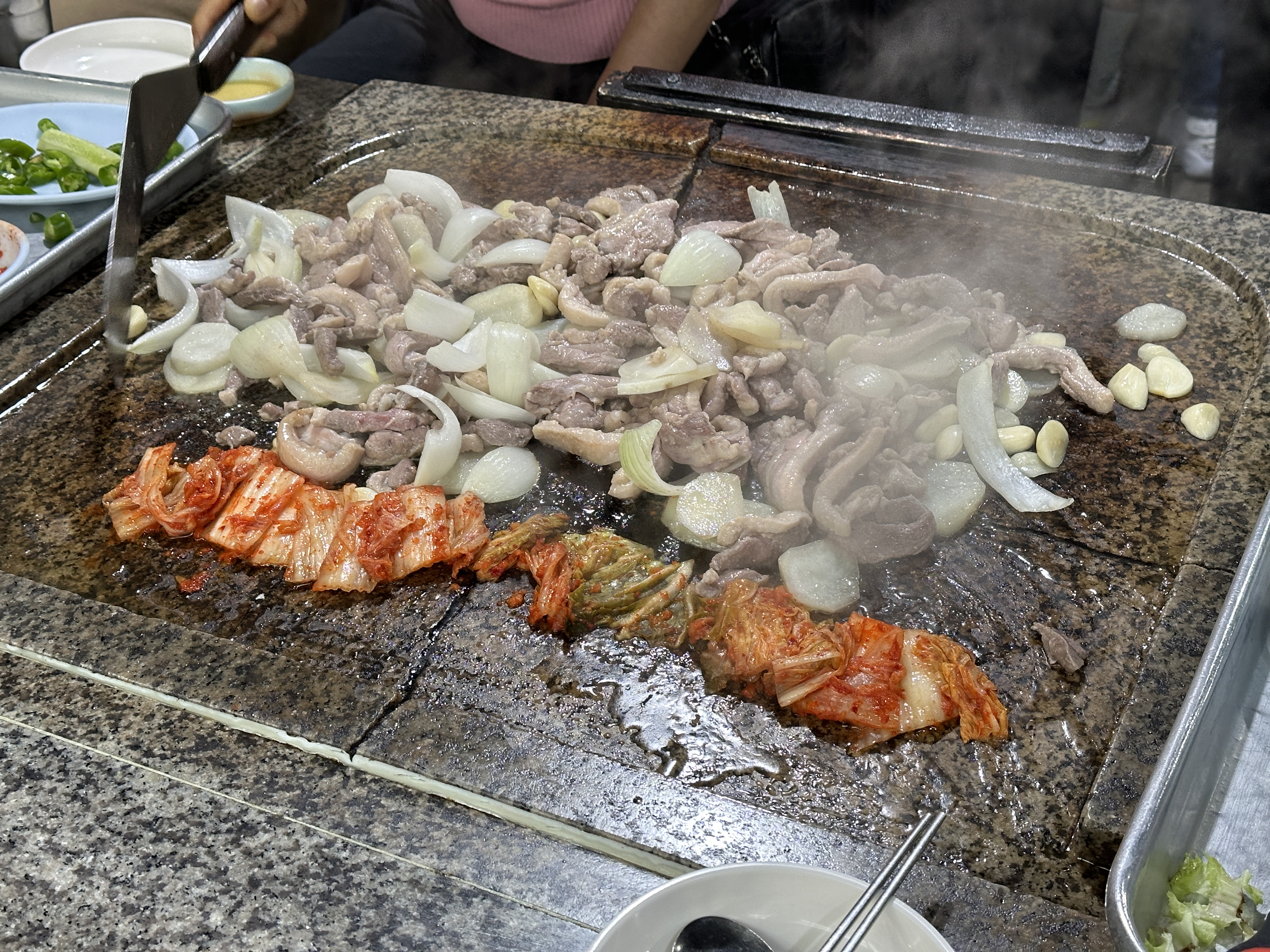 돌판때문에 맛있다고 하는 진 모르겠지만, 개인적으로는 갈라진 맥반석돌판을 보면서 많은 생각을 했습니다. 맛이 특별해 지는 것도 잘 모르겠는데(죄송합니다 사장님ㅠㅠ) 굳이 이렇게 다 깨진 돌을....ㅠㅠ 다른 테이블 정리 및 청소하시는 것도 다 봤는데 틈새까지 정리하시는 건 물리적으로도 무리가 있어 보였어요. 사실 요새 좀 이런 부분들에 예민해 져서 그런게 보였을 지도 모르겠지만 좀 신경이 쓰였습니다.