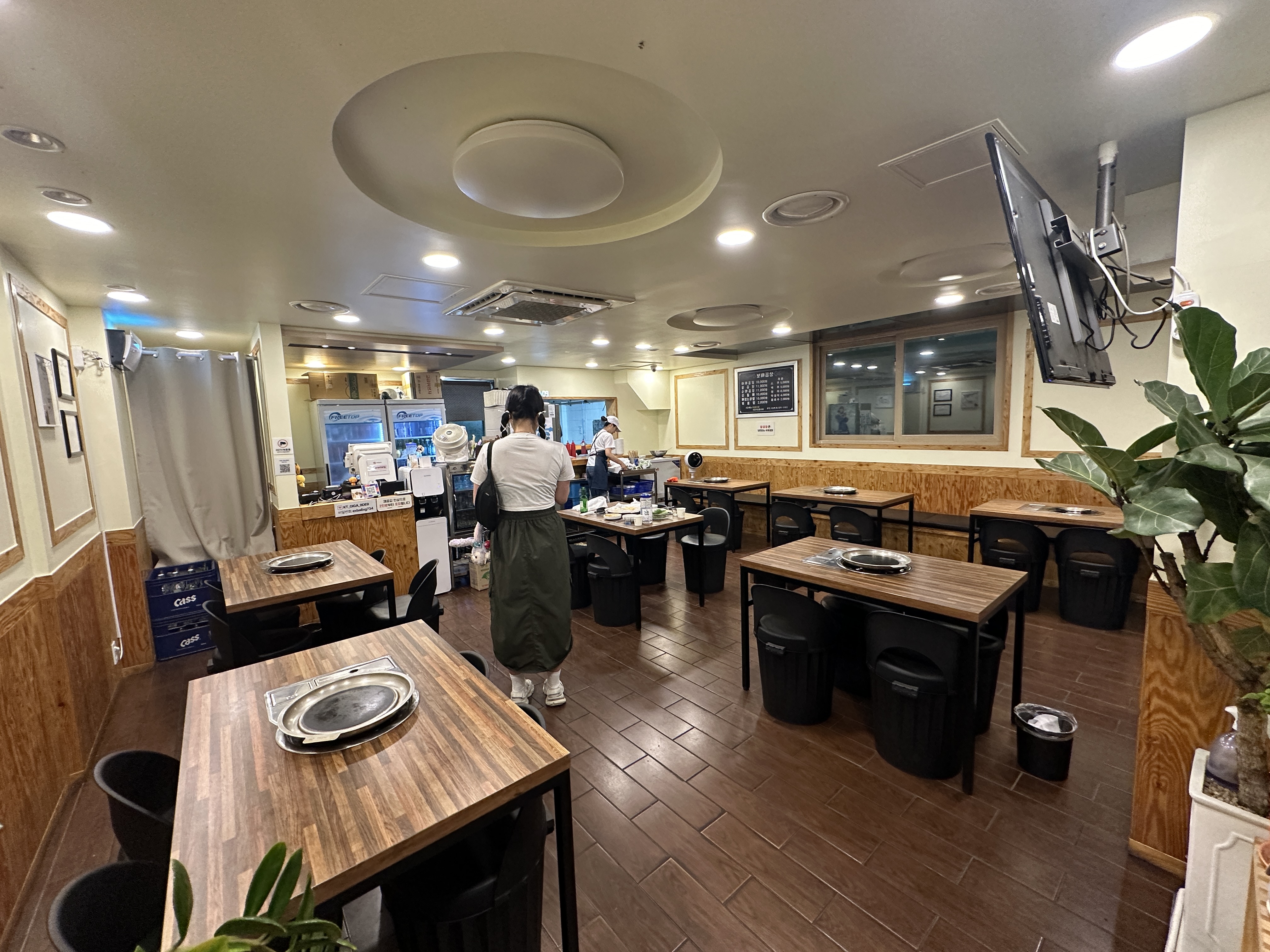 종암동 소문난 보배곱창의 내부입니다. 깔끔한 테이블과 좌석들, 매립등까지 있네요. 바닥까지 깔끔합니다. ^^