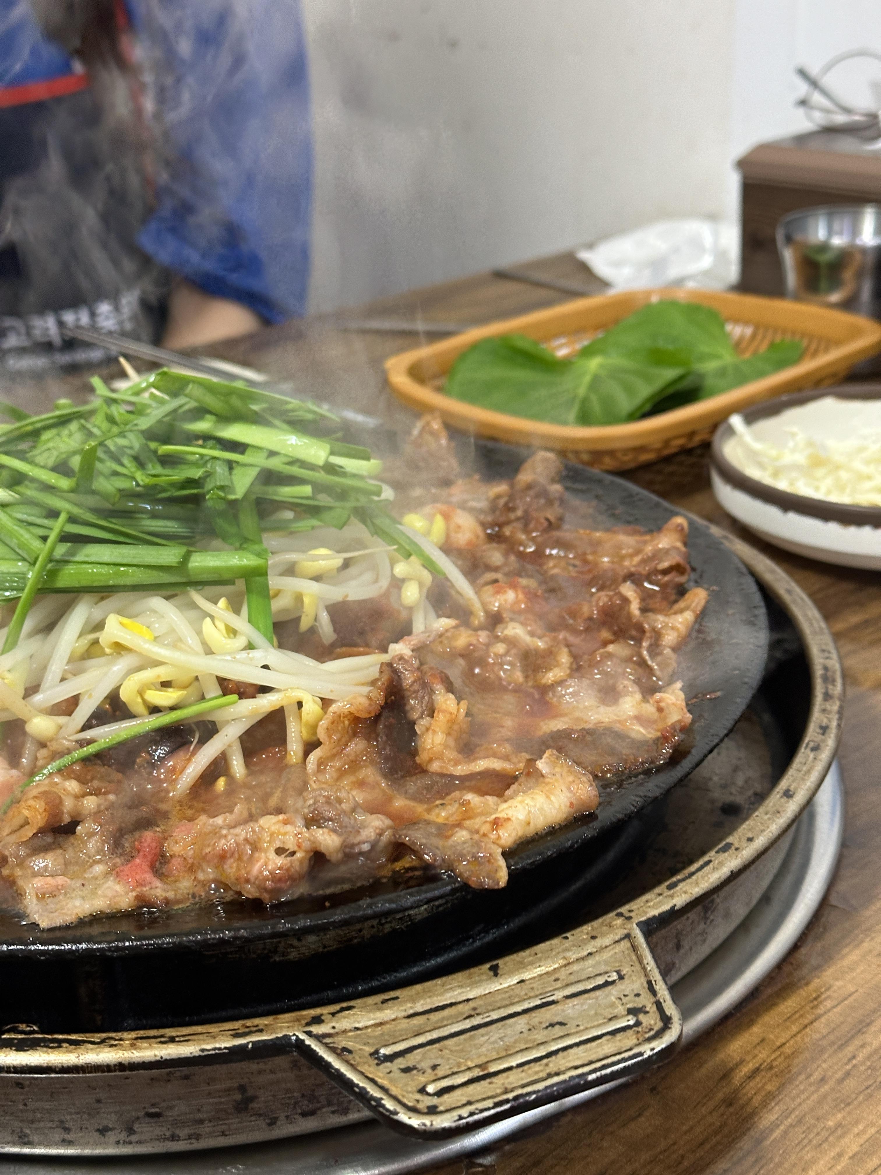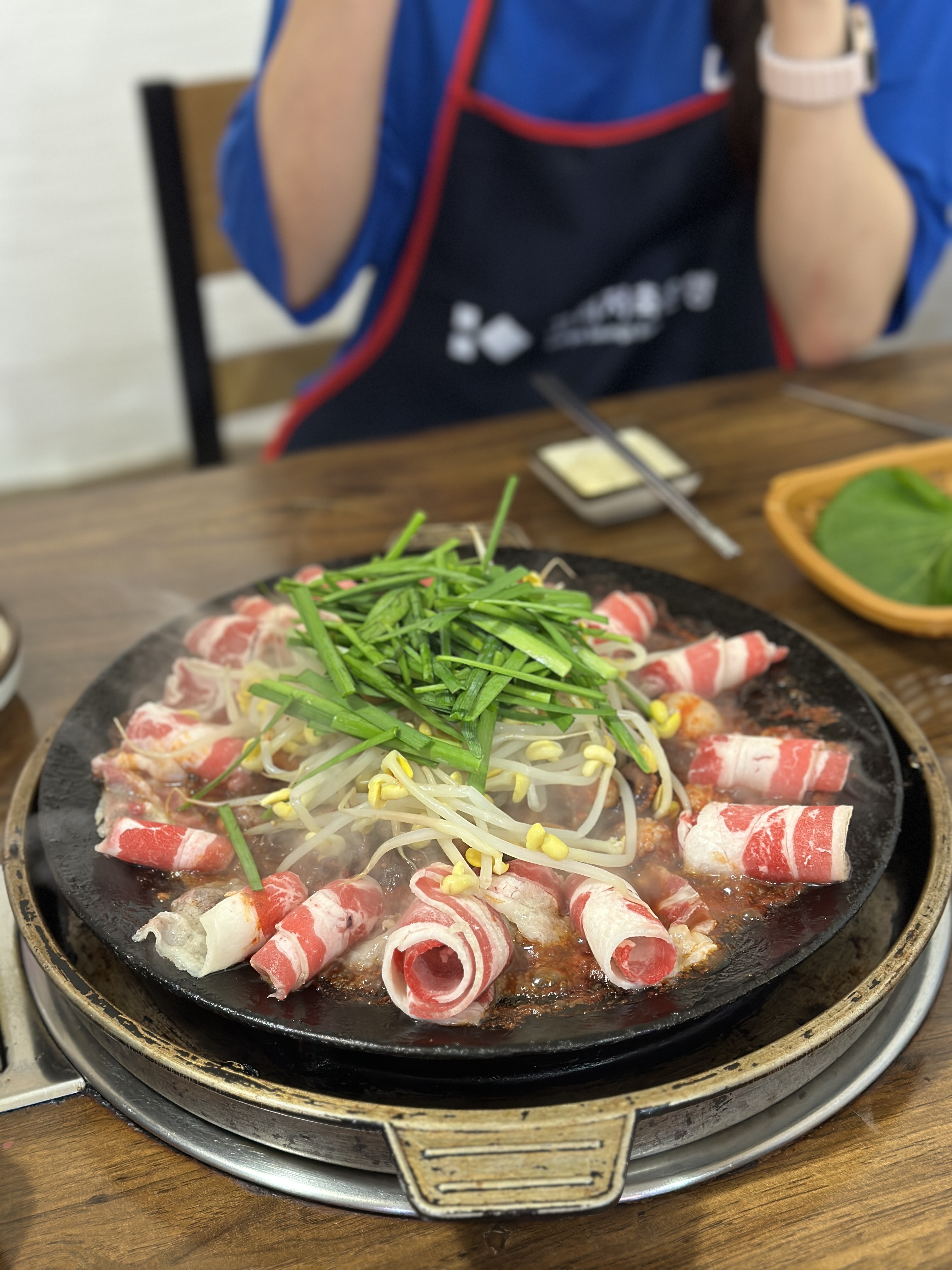 12분이 되고, 사장님께서 직접 오셔서 우삼겹들을 쭉 펼쳐 깔아주십니다. 콩나물도 얹고, 부추도 얹으니 비주얼이 너무 좋아요.