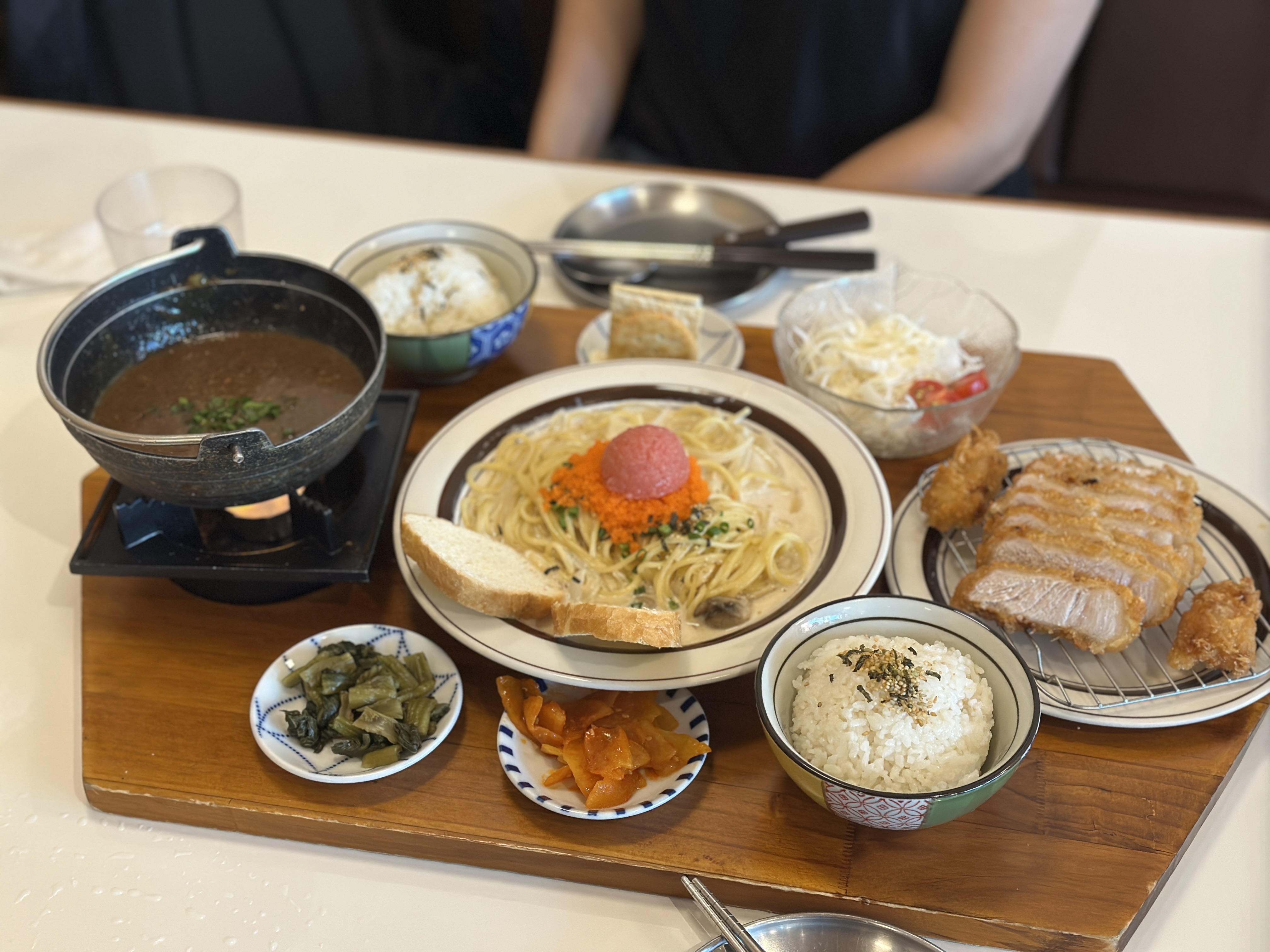 Here’s the seating area with cups, cutlery, and the menu. We ordered the Tokkijung Set, which includes Tokkijung Curry, Mentaiko Cream Pasta, and Pork Loin Katsu.