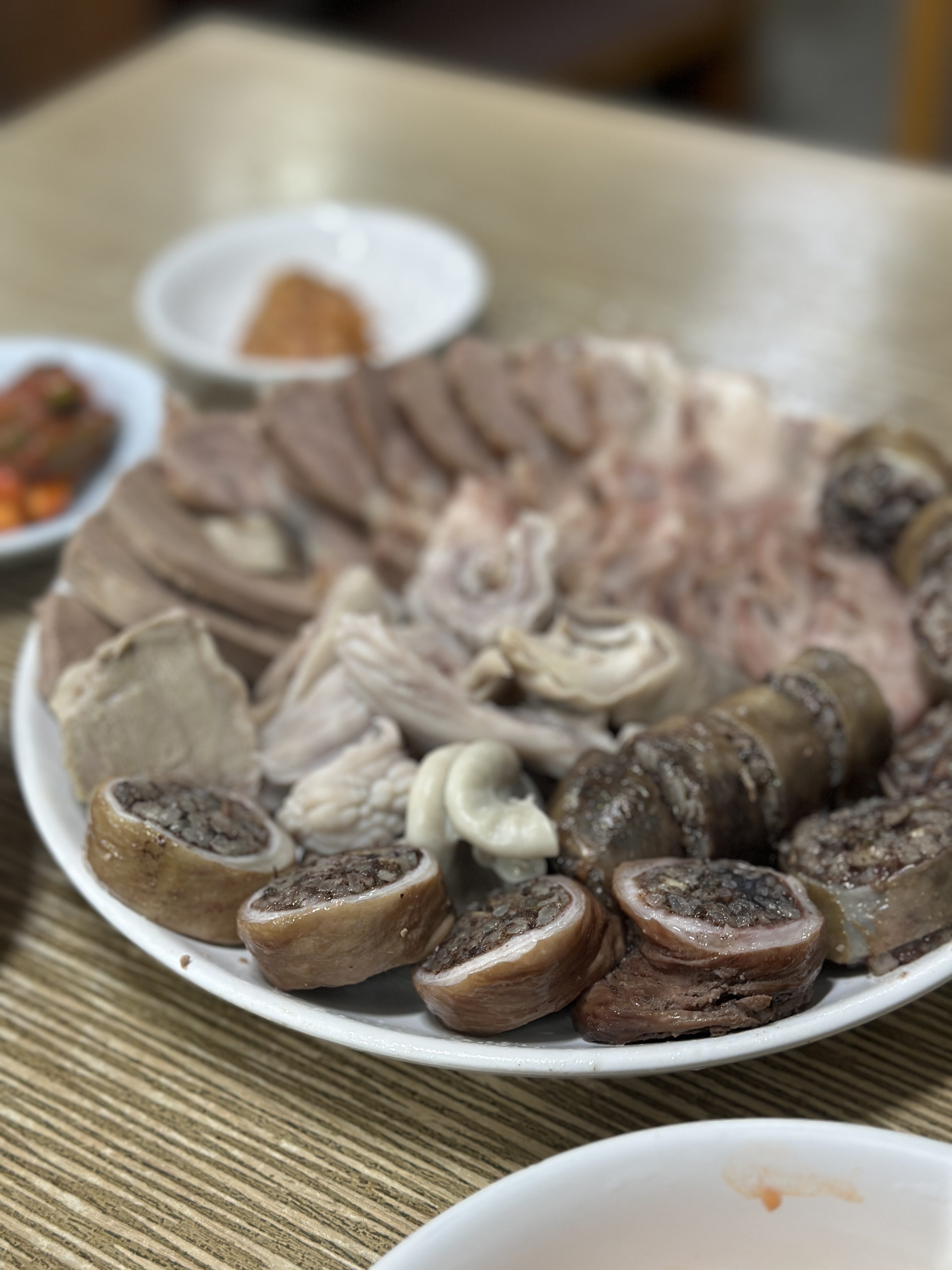 을지로 전통의 순대 맛집, 산수갑산의 대표메뉴인 모듬고기입니다. 2인이 먹기에 적당하고, 약간 포만감을 느낄 정도입니다. 돼지 부속고기라고도 불리는 다양한 부위들을 맛있게 삶아서 순대와 함께 나옵니다. 산수갑산의 유명세 원천인 다양한 순대 역시 여전합니다.