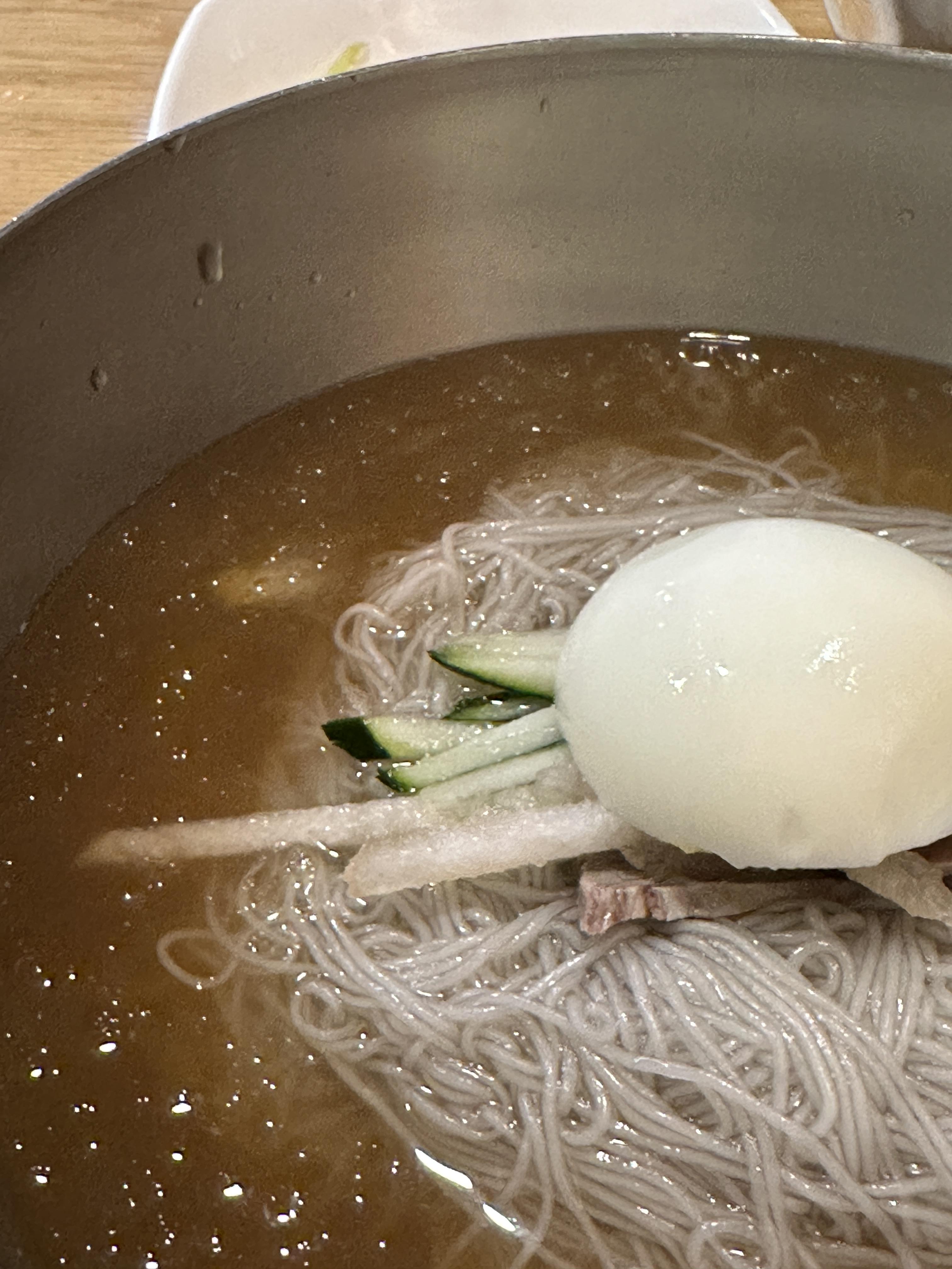 And then the hot broth appears! This is a good indicator of the quality of the naengmyeon. Take a sip! But be careful—it’s hot... ㅋㅋㅋ