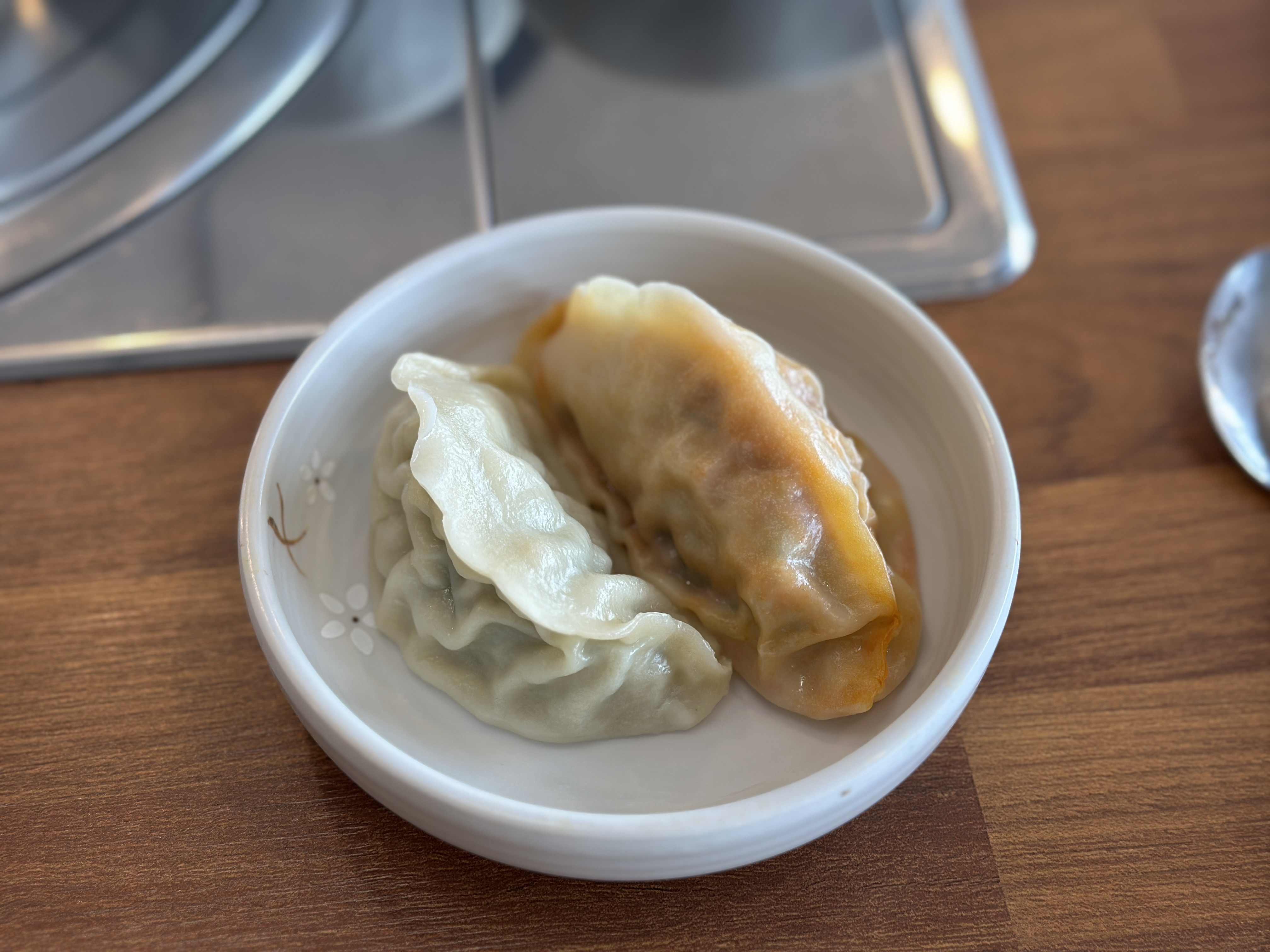 The half-and-half dumplings arrived quickly and exceeded my expectations. They were incredibly delicious. I regretted not ordering two servings as my former girlfriend and I devoured them, haha.