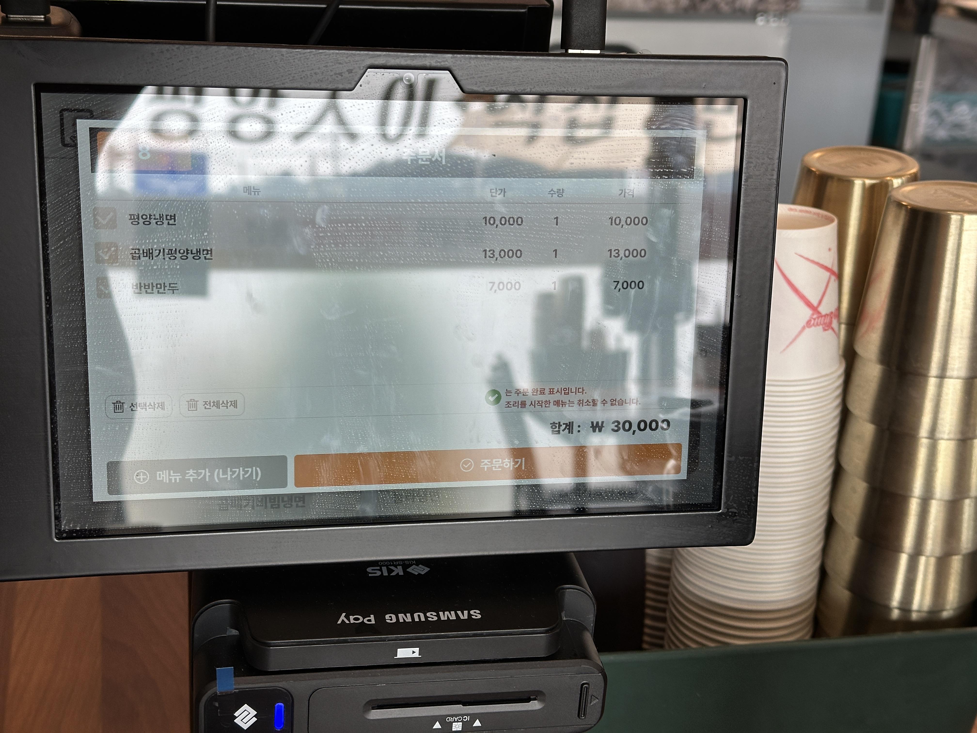 이천 평양냉면 전문점 능라면옥은 자리에서 키오스크로 결제까지 진행하는 방식입니다. 편하게 주문할 수 있어서 좋습니다. 능라냉면을 먹어볼 까 하다가 자연스레 평양냉면(곱배기)로 주문해봅니다. ㅋㅋㅋ