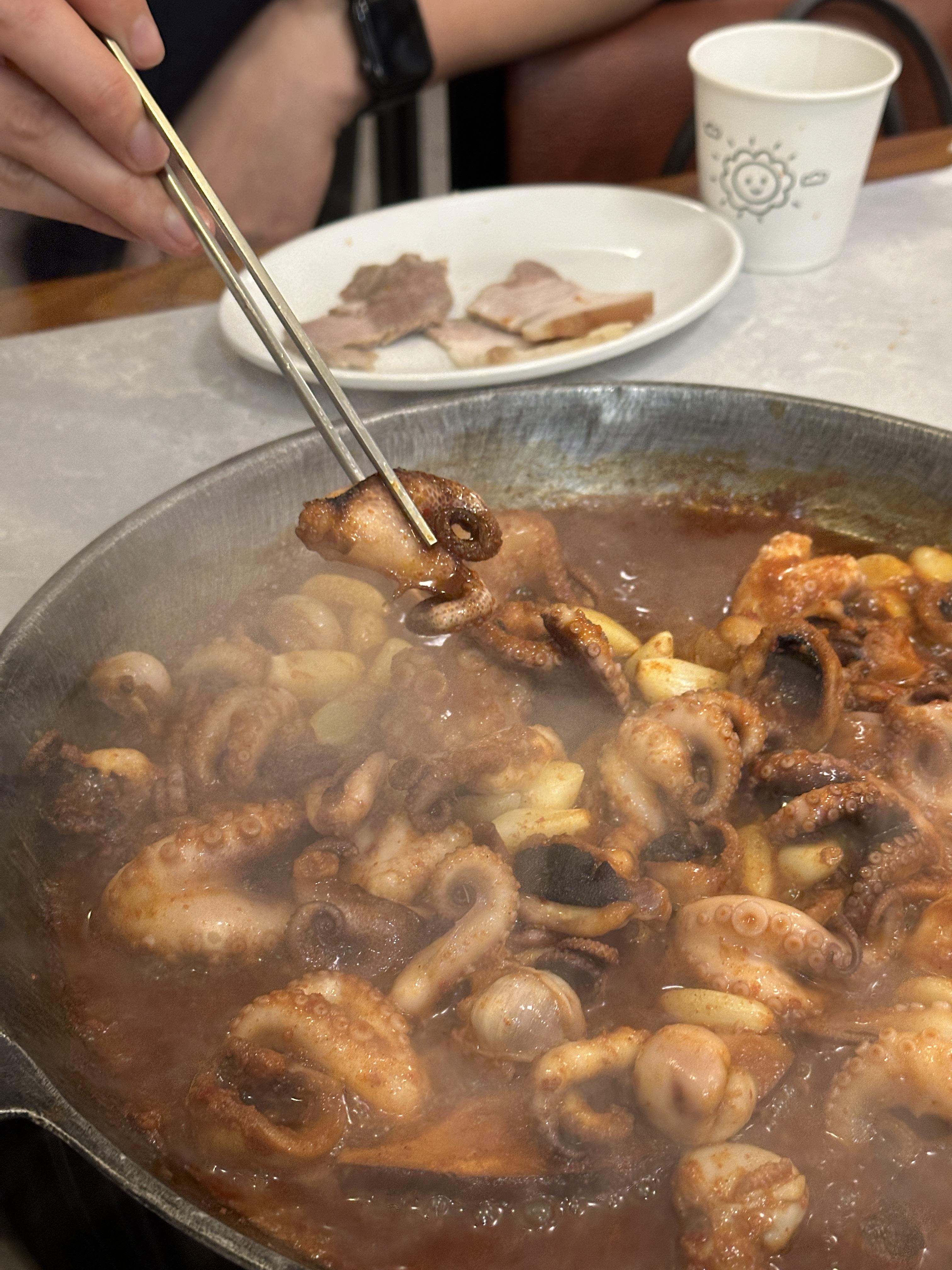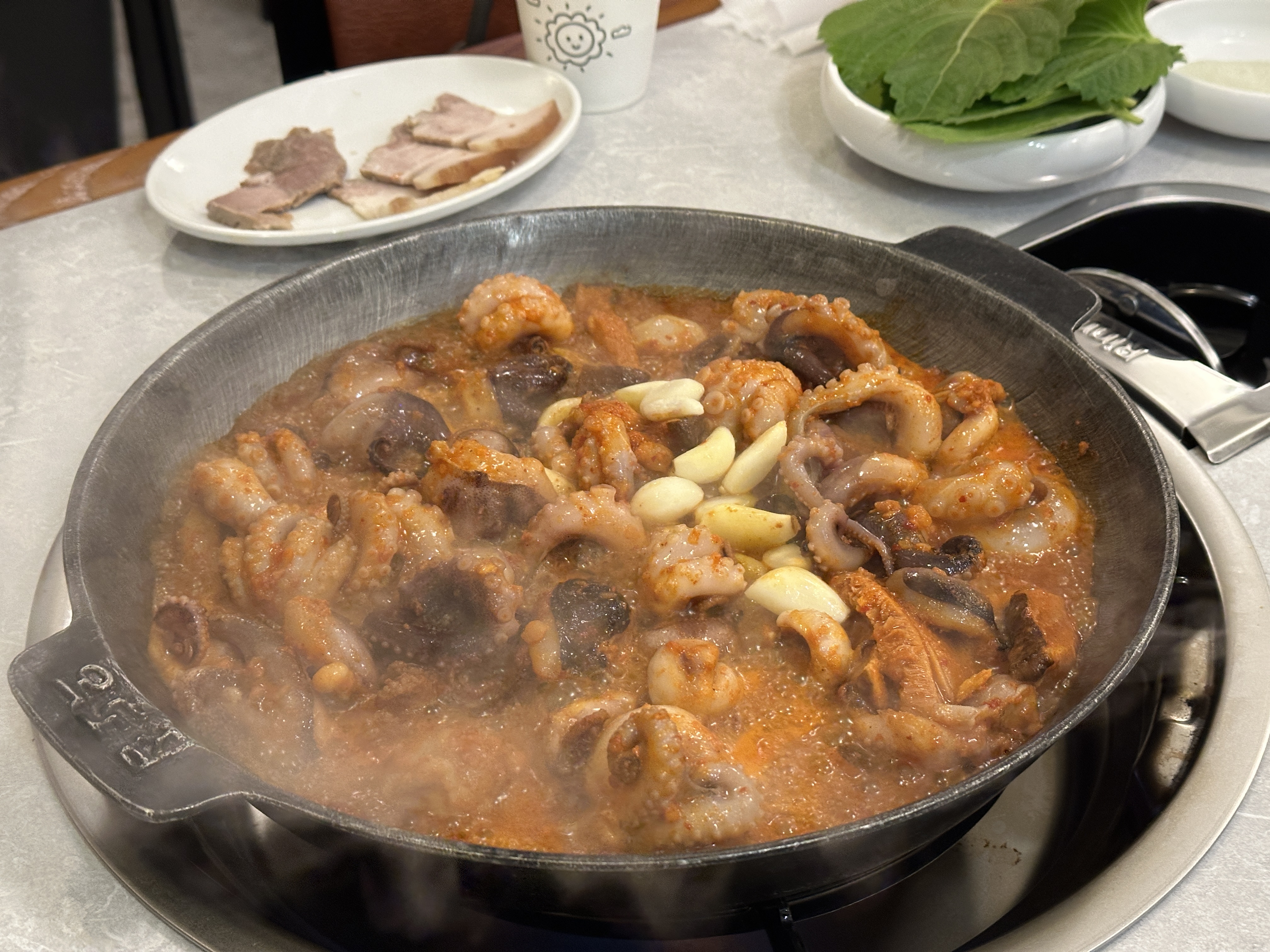 잠시 기다리니 쭈꾸미가 등장합니다. 색깔은 완전 내스타일이네요 ^^ 끓인지 얼마 되지 않았는데 자글자글 올라오는 국물이 코끝을 자극합니다.