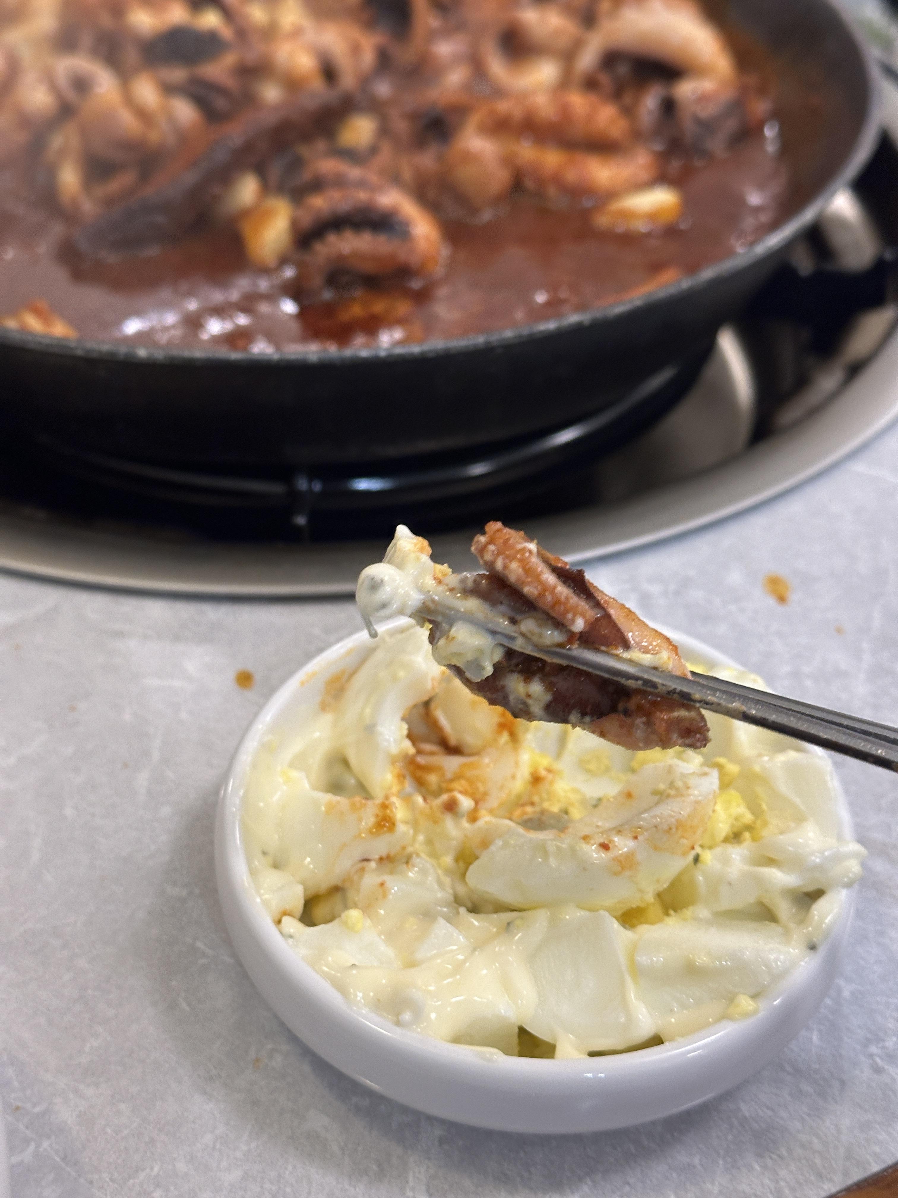 다 익고나서 아까 사장님께서 말씀하신 대로 계란+마요네즈에 찍어서 먹어봅니다. 생각보다 별미였네요. 마음에 듭니다.