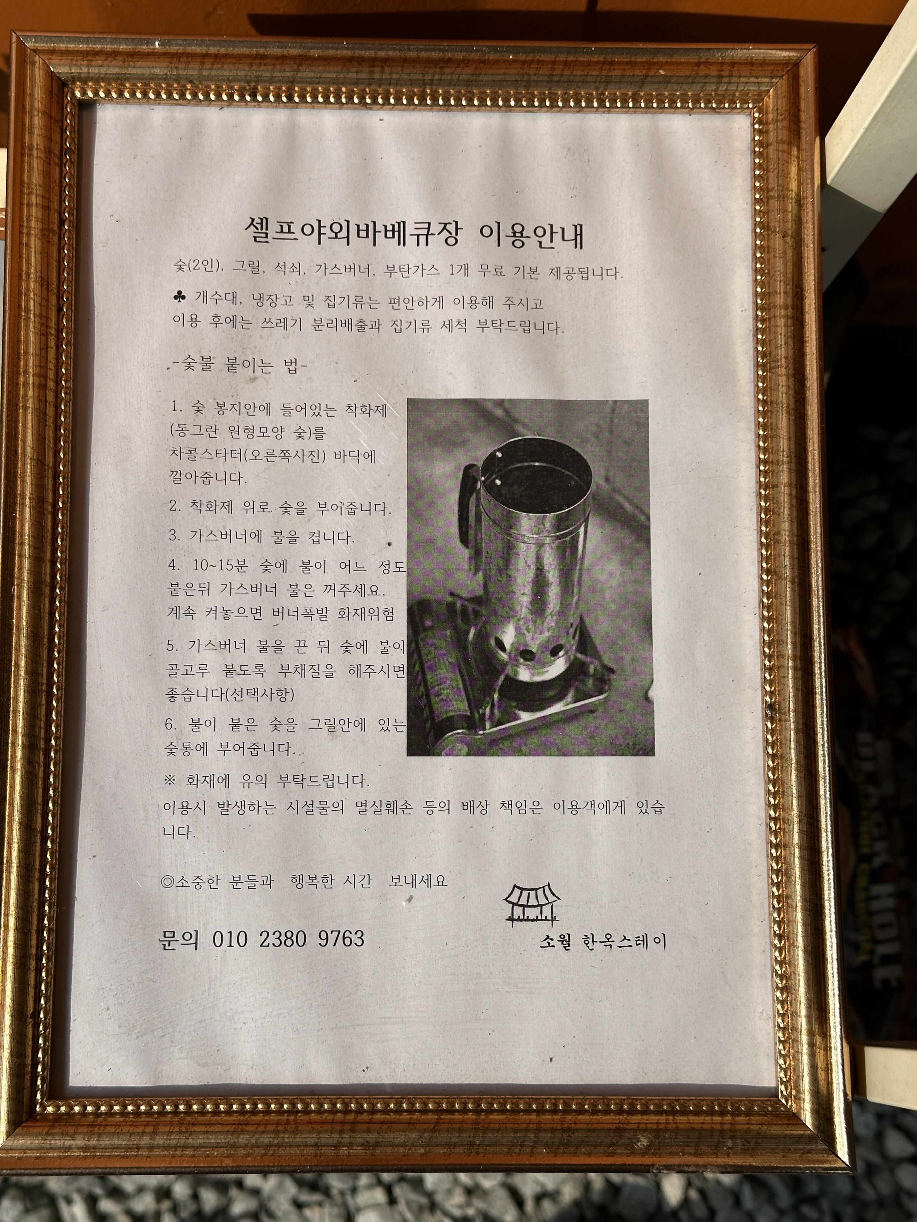 At So-wol, you can use the outdoor barbecue facilities. The barbecue equipment is well-prepared, and essential items such as charcoal, mosquito repellent, and butane gas are provided, so you can make use of them.