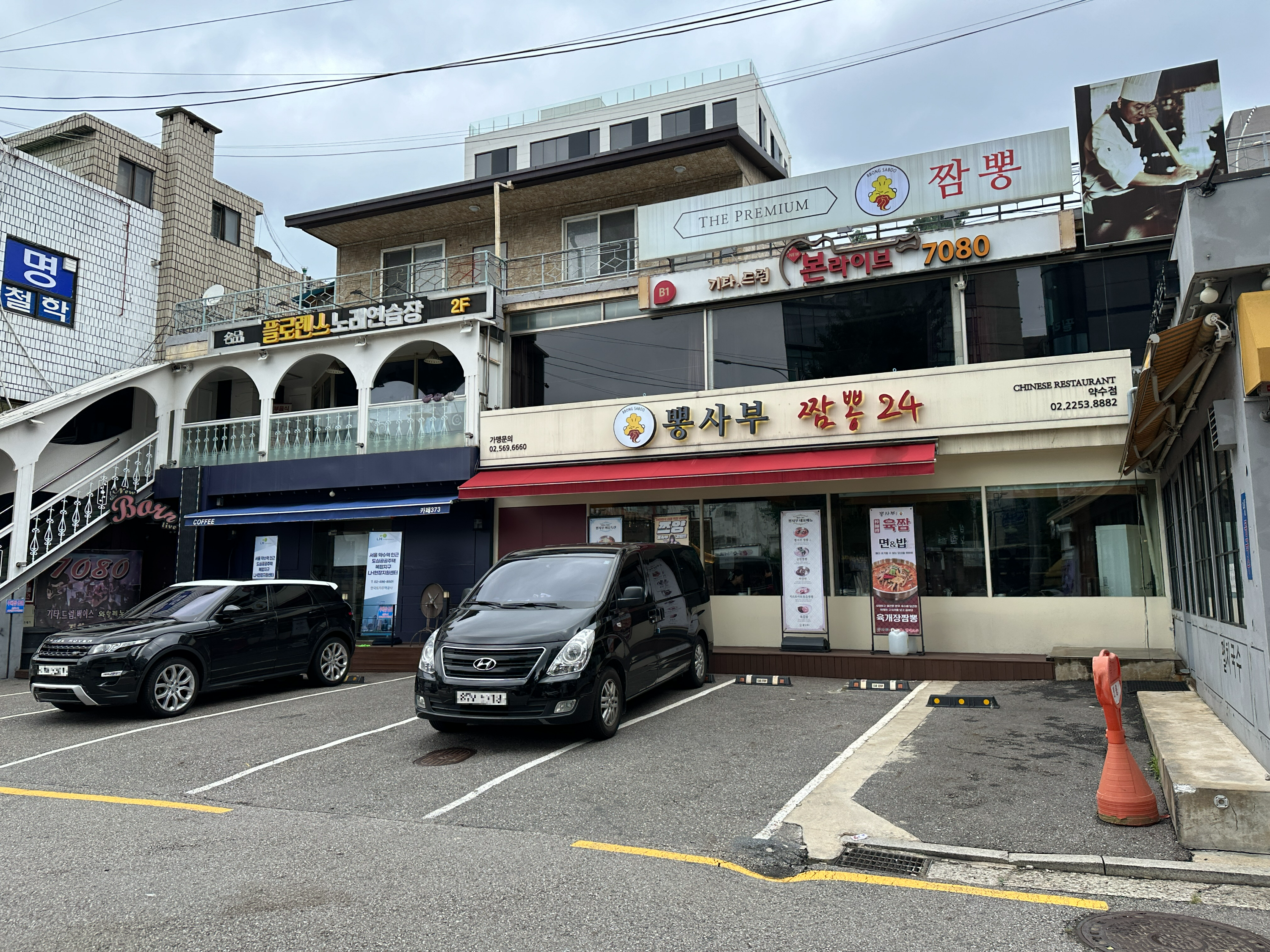 짬뽕 맛집 뽕사부 약수역점의 외관입니다. 사진처럼 주차장이 마련되어 있음을 확인하실 수 있습니다. 교외에 있는 주차장들과 비교할 정도는 아니지만, 그래도 주차장이 있는 게 어딥니까?