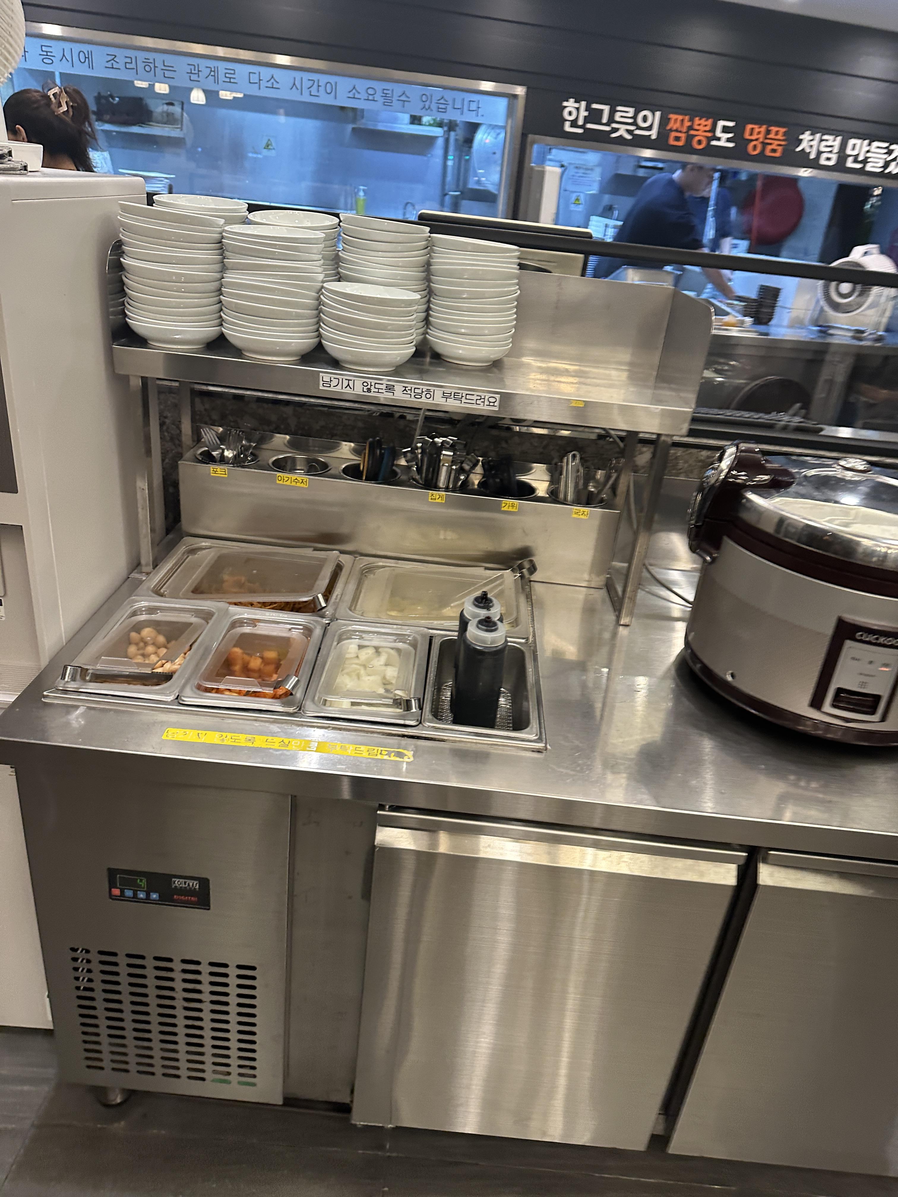 내부 사진입니다. 테이블 간격도 괜찮고, 내부 면적 자체도 넓은 편입니다. 한 켠에는 셀프바가 자리하고 있어요. 짬뽕지존 아차산역점은 양이 부족하신 분들을 위해 이렇게 쌀밥을 무한으로 제공해 주십니다. +_+