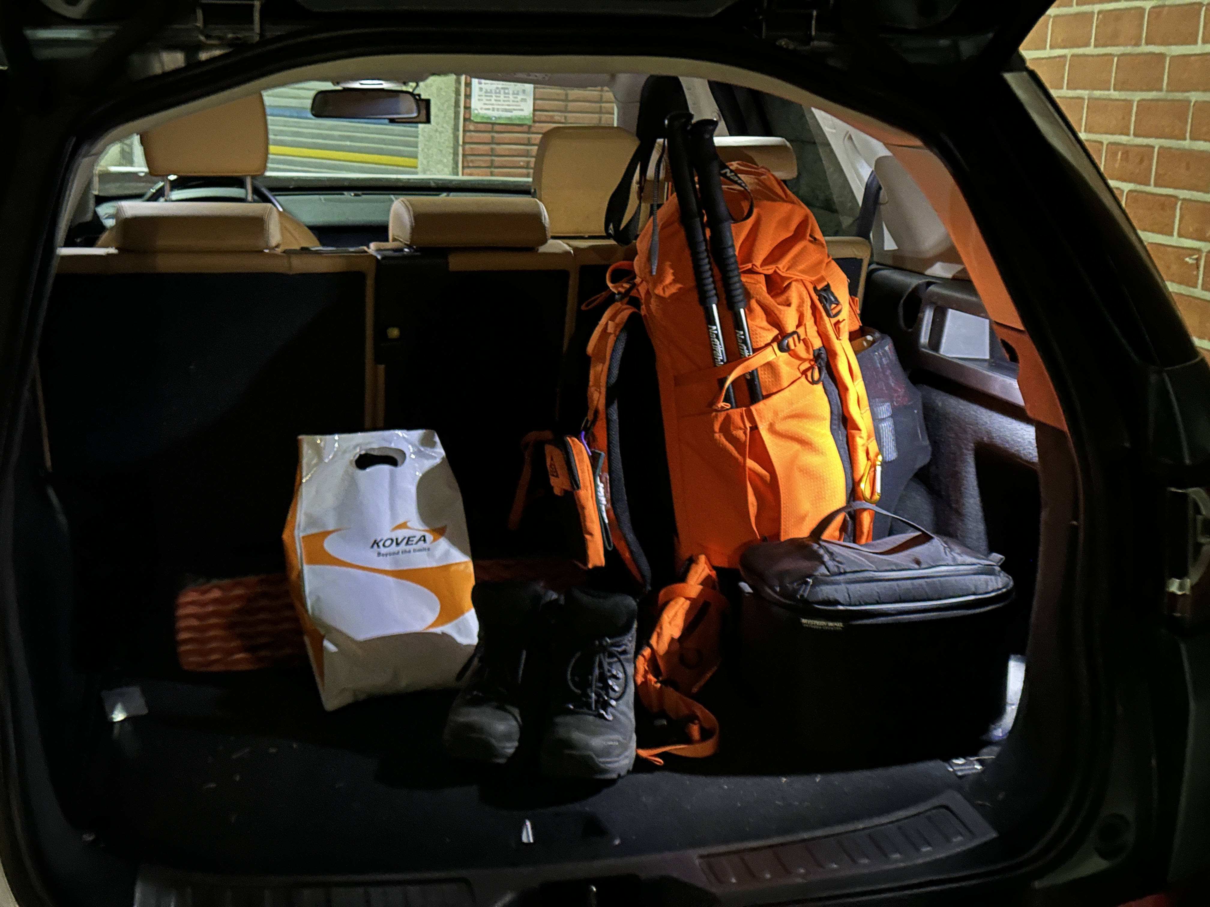 일단 계획한 기상시간은 4시 이전 이었습니다. 지금까지의 배여행의 기억들을 되새겨봤을 때, 승선은 30분 전에 시작하고, 10분 전에는 승선 마감을 했었거든요. 그런데 7시30분 배다? 그럼 최소 3시간 전에는 출발해야 7시에 도착하겠구나 생각했습니다. 과속은 무서우니까요...ㅠ 근데 눈뜬게 4시15분... ㅎㄷㄷ 짐상태 보시면 알겠지만, 완전히 패킹도 다 안한 상태였답니다. 백패킹 컨셉으로 가는 거라 짐이 다 가방에 안들어가면 의미가 없었는데 말이죠 ㅋㅋㅋ 이건 정말 반성해야 됩니다... ㅋㅋㅋㅋ 결국 시간이 없어서 그대로 들고 차 트렁크에 싣습니다.