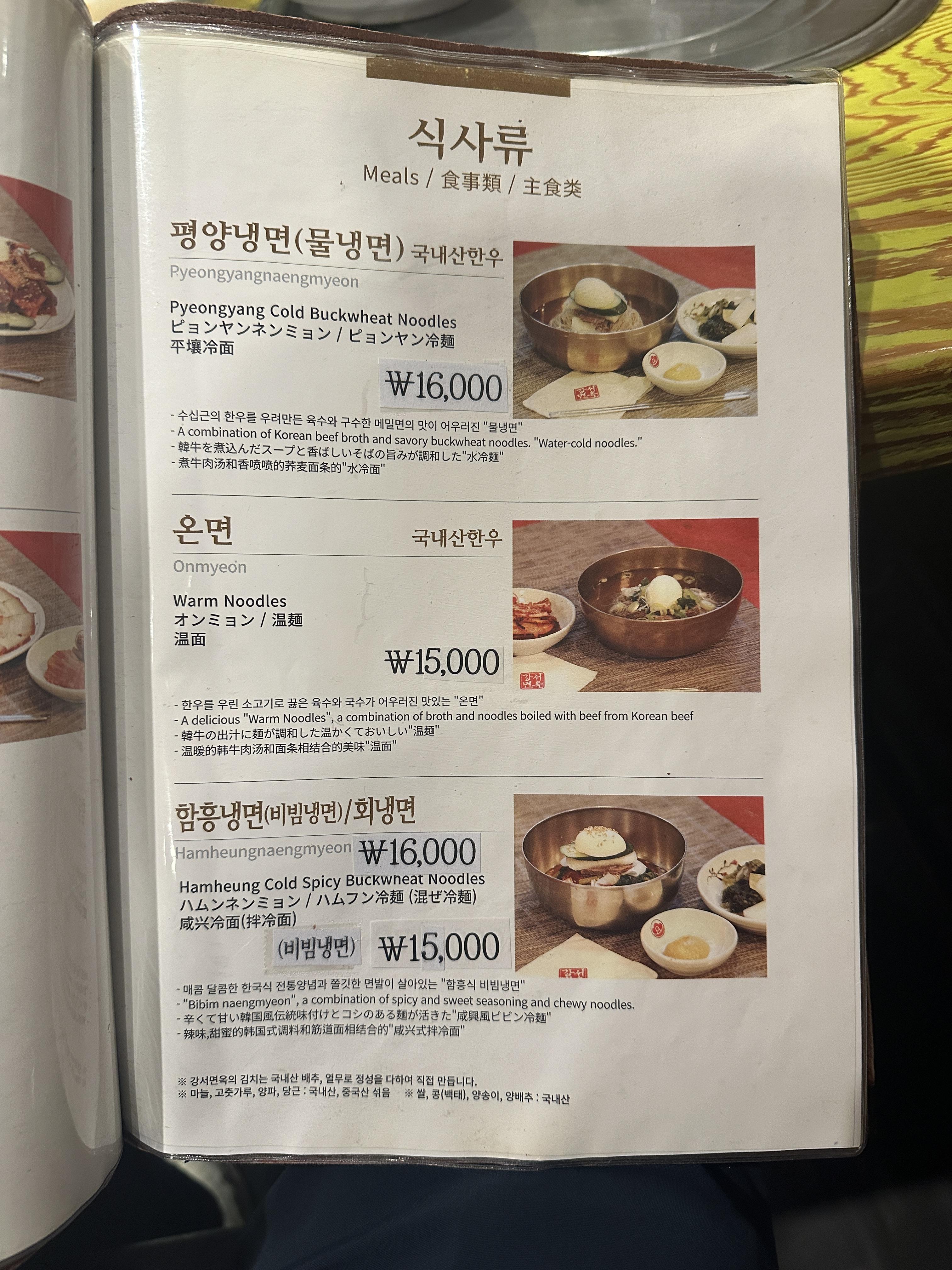 앞쪽의 고기메뉴는 패스합니다. 혼자 갔으니 냉면이나 찬찬히 둘러봅니다. 물론 주문은 긴 고민이 필요없죠. 바로 평양냉면 주문합니다. 주문하고 나니 왕만두가 눈에 들어와서 하나 시켜봅니다. 크면 지까짓게 얼마나 크겠어 하고 말이죠... 그리고 놀라버렸어요.