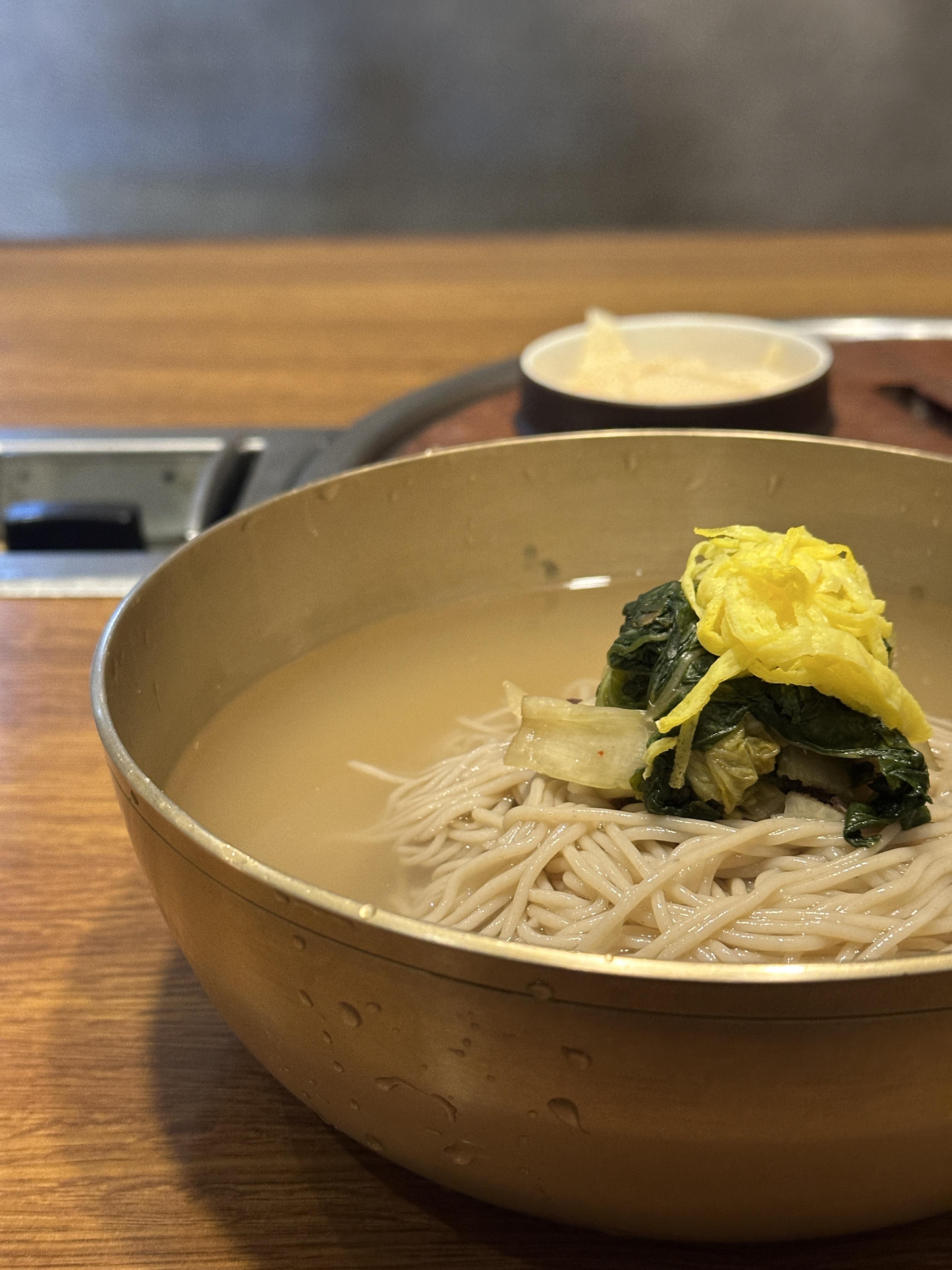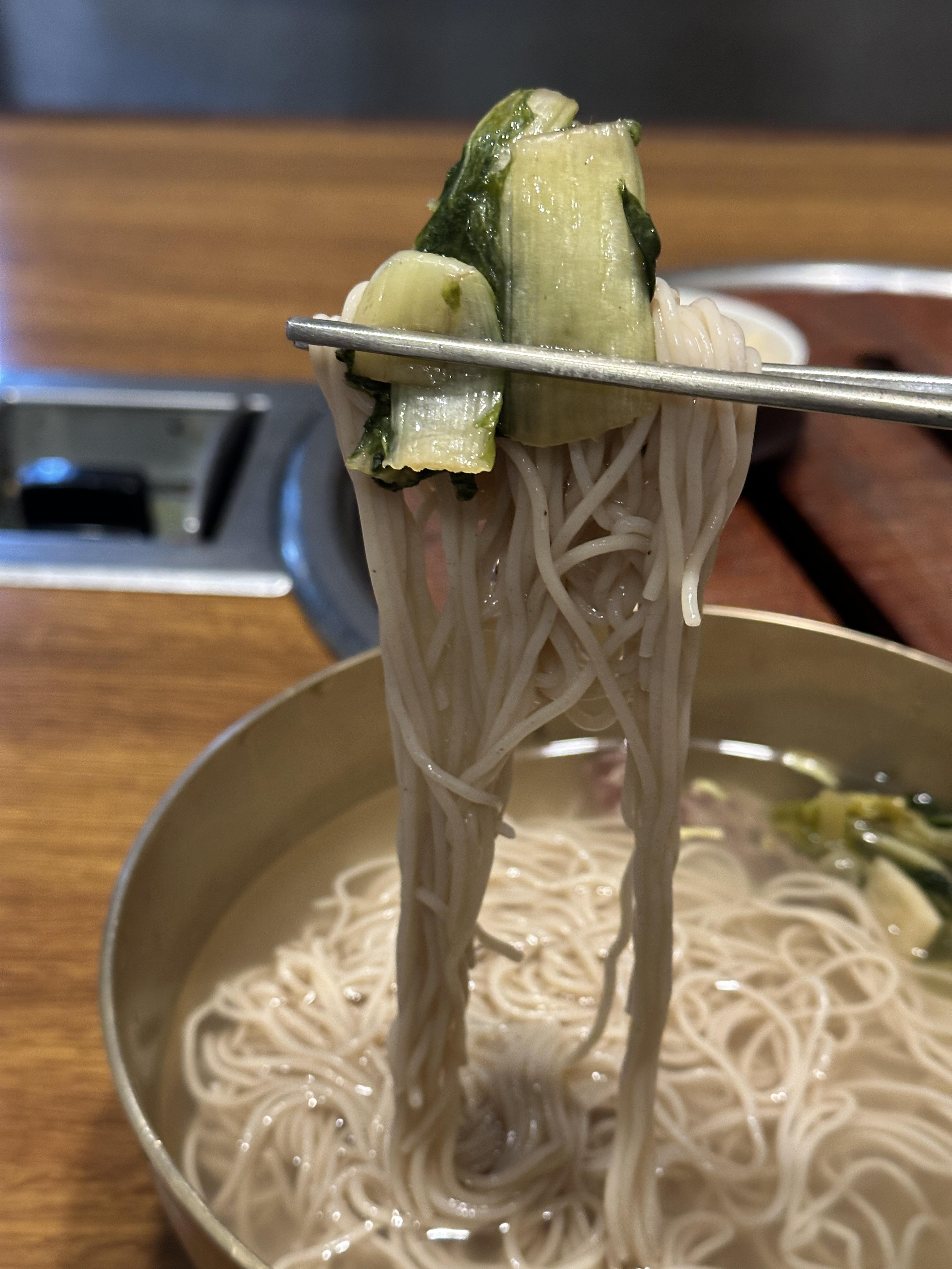 봉피양 평양냉면 특징은 계란이 없고, 육수가 조금 깊은 색감을 띈다는 것입니다. 표현만 하자면 탁한 느낌이에요. 하지만, 메밀로 만들어진 면은 제가 평양냉면을 좋아하는 이유를 대변하기도 하네요. 순식간에 삼켜넘깁니다.