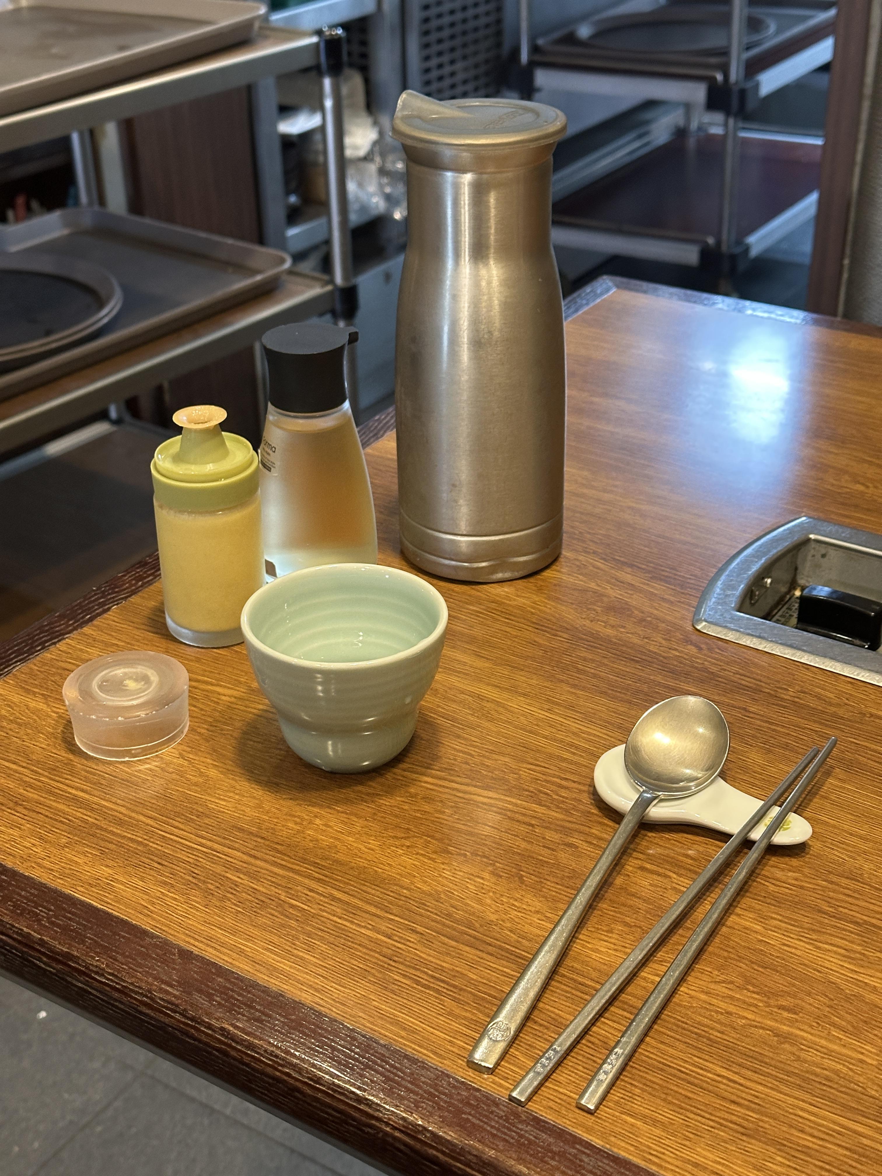 봉피양 경복궁점에 들어가시면, 이렇게 물과 수저 등을 세팅해 주십니다. 특별한 건 없습니다. 테이블에 버너가 있다는 점 빼고 말이죠 ㅋㅋㅋ