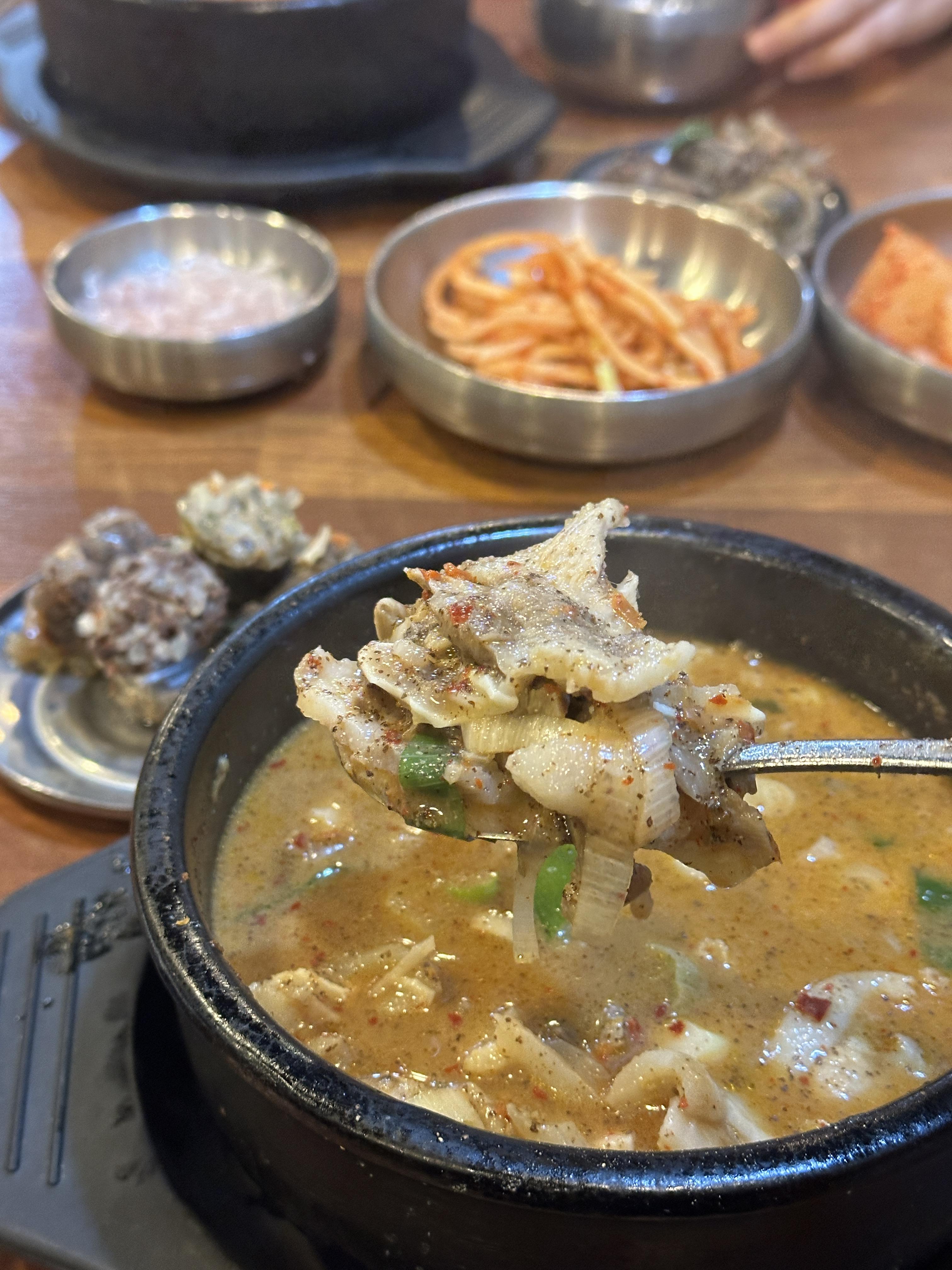팔팔 끓는 하얀 국물을 호호 불어서 한입 살짝 맛봅니다.