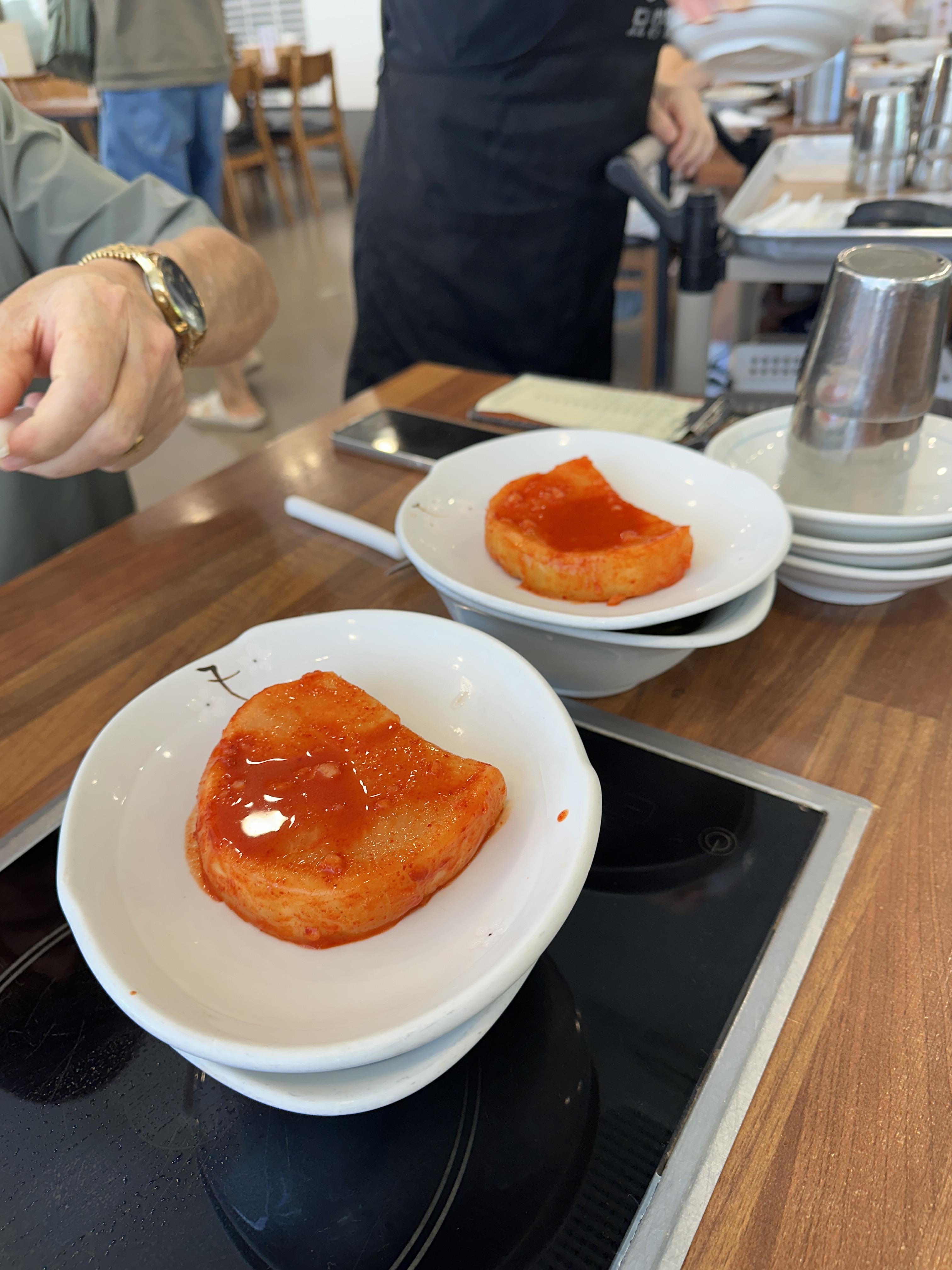 저는 부모님을 모시고 갔기에 만두국 2개와 녹두빈대떡을 시킵니다. 1그릇을 온전히 드시기에 부담스러워 하시니 그렇게 주문했어요. 기본찬으로는 동치미와 깍두기가 나와요. 깍두기 김치가 진짜 맛있습니다. 동치미 국물도 그냥 여기다 소면 넣으면 동치미국수가 되겠죠? ㅋㅋㅋ 맛있겠다...