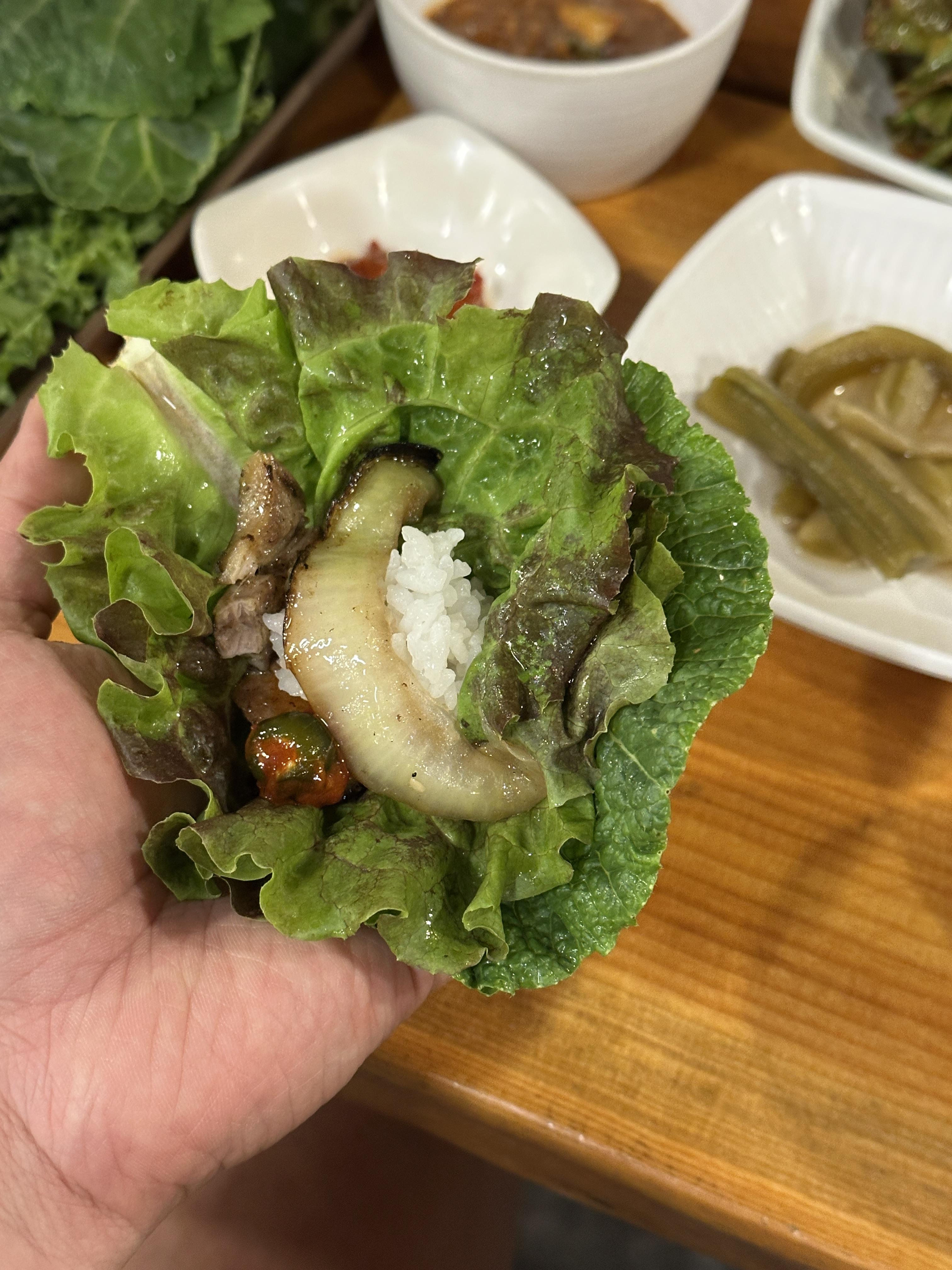 일단 양념이 고추장같은 매운 게 아니라 달짝지근오묘한 느낌의 소스라 먹기가 부담없고 너무 좋습니다. 쌈에 한가득 싸서 한 입 먹으면 그야말로 행복감이 충만해집니다. ㅋㅋㅋ