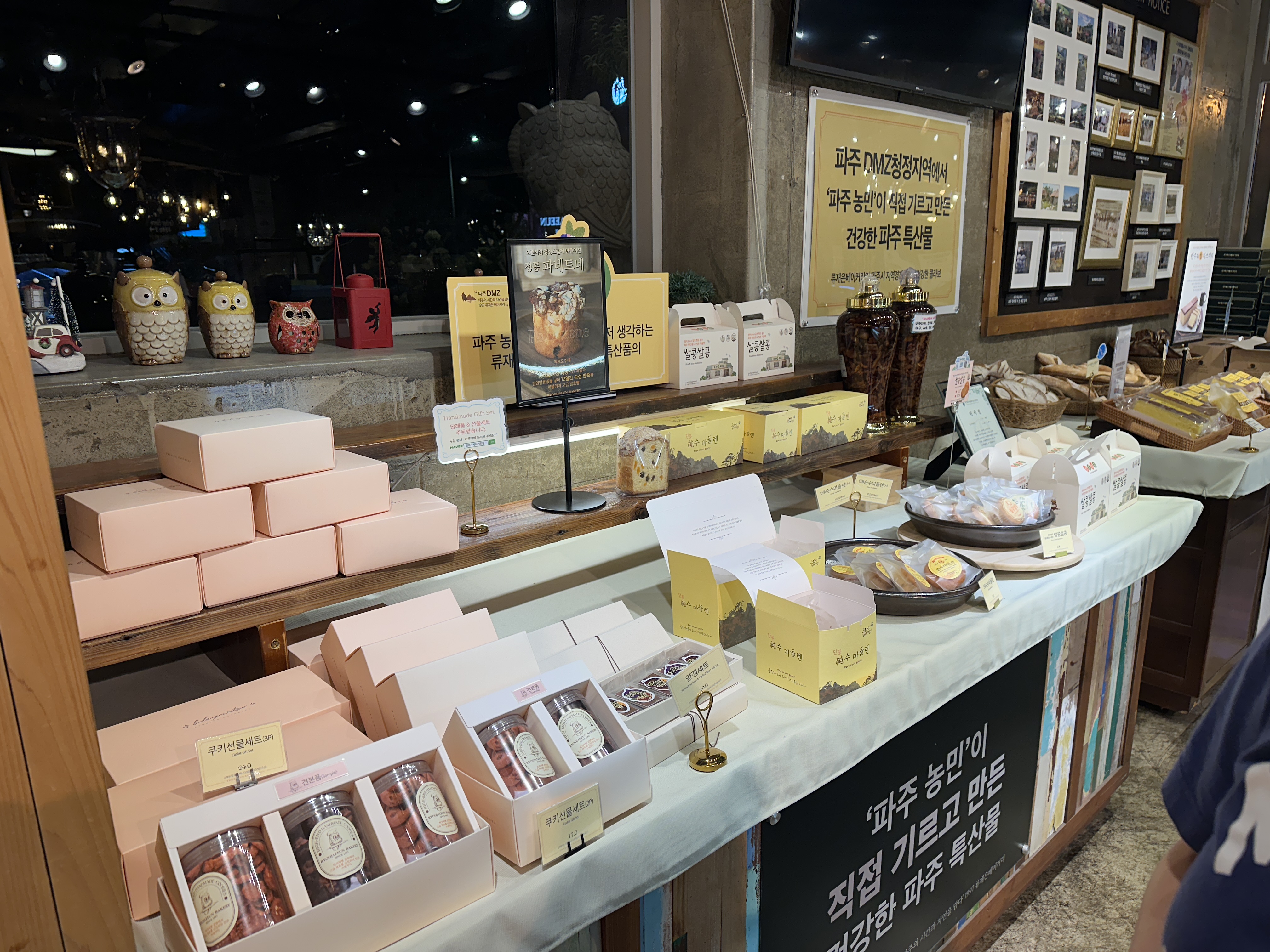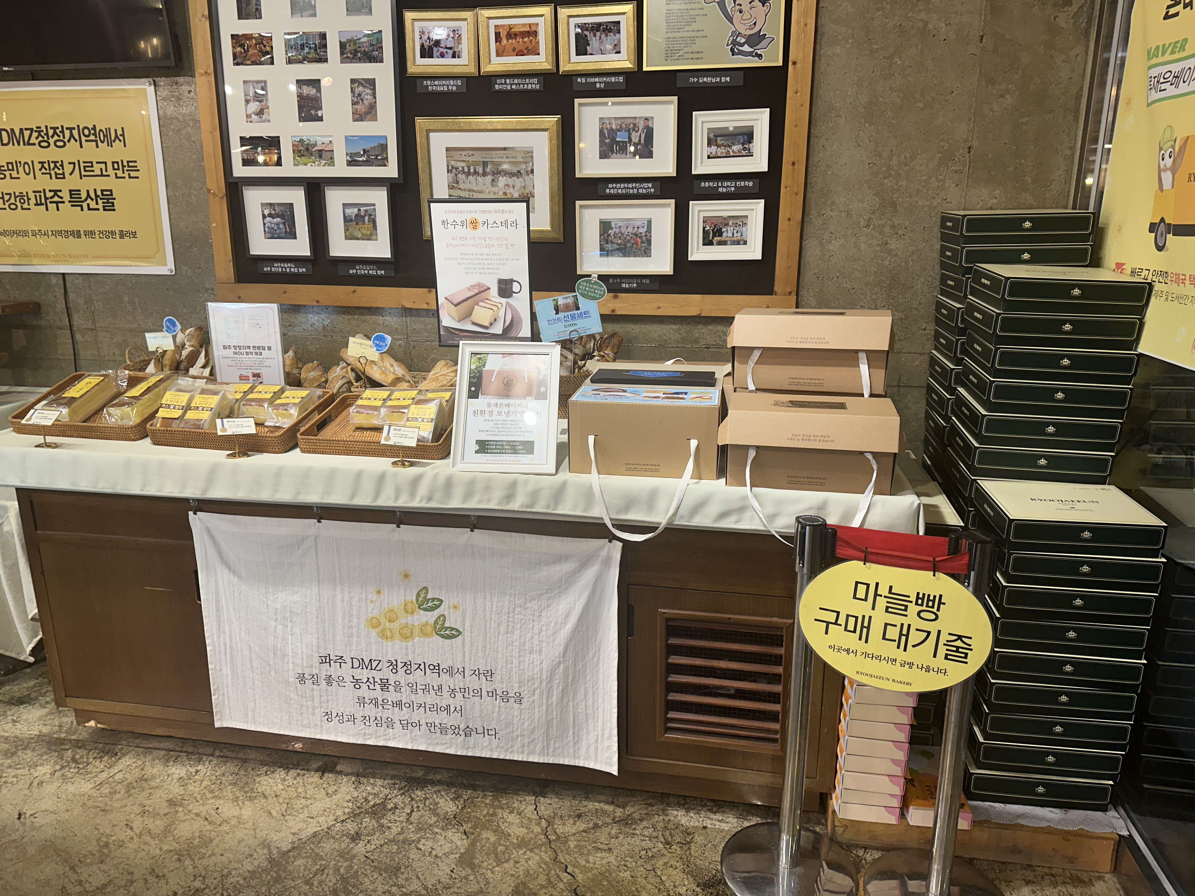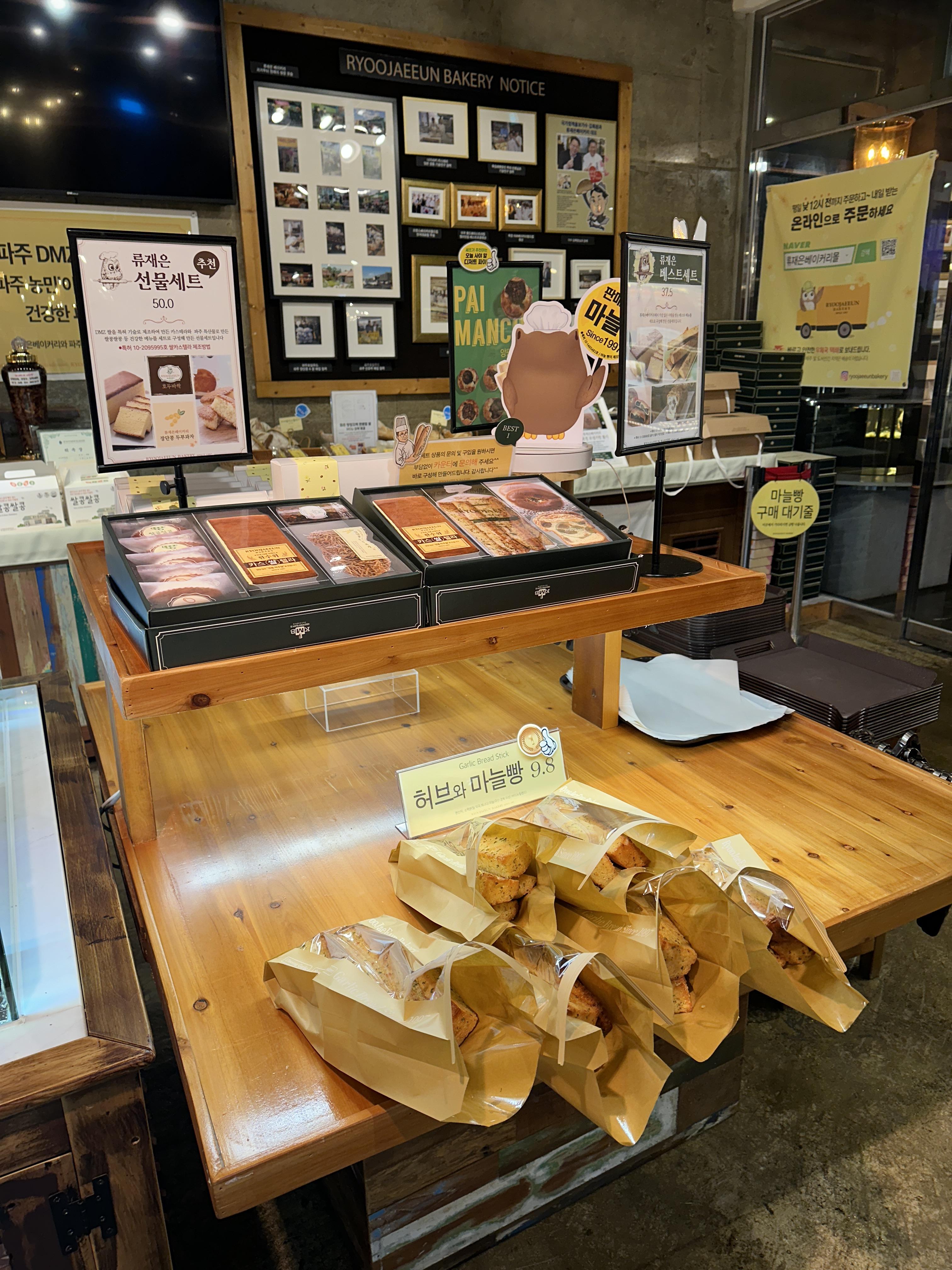 파주 헤이리마을, 마늘빵의 원조 류재은 베이커리 카페는 마늘빵만 있는게 아니고 선물용으로도 좋아보이는 다양한 제품들이 미치되어 있습니다. 심지어 마늘빵은 구매 대기줄까지 있네요. 빵 나오는 시간에 줄을 서야 하나봐요.