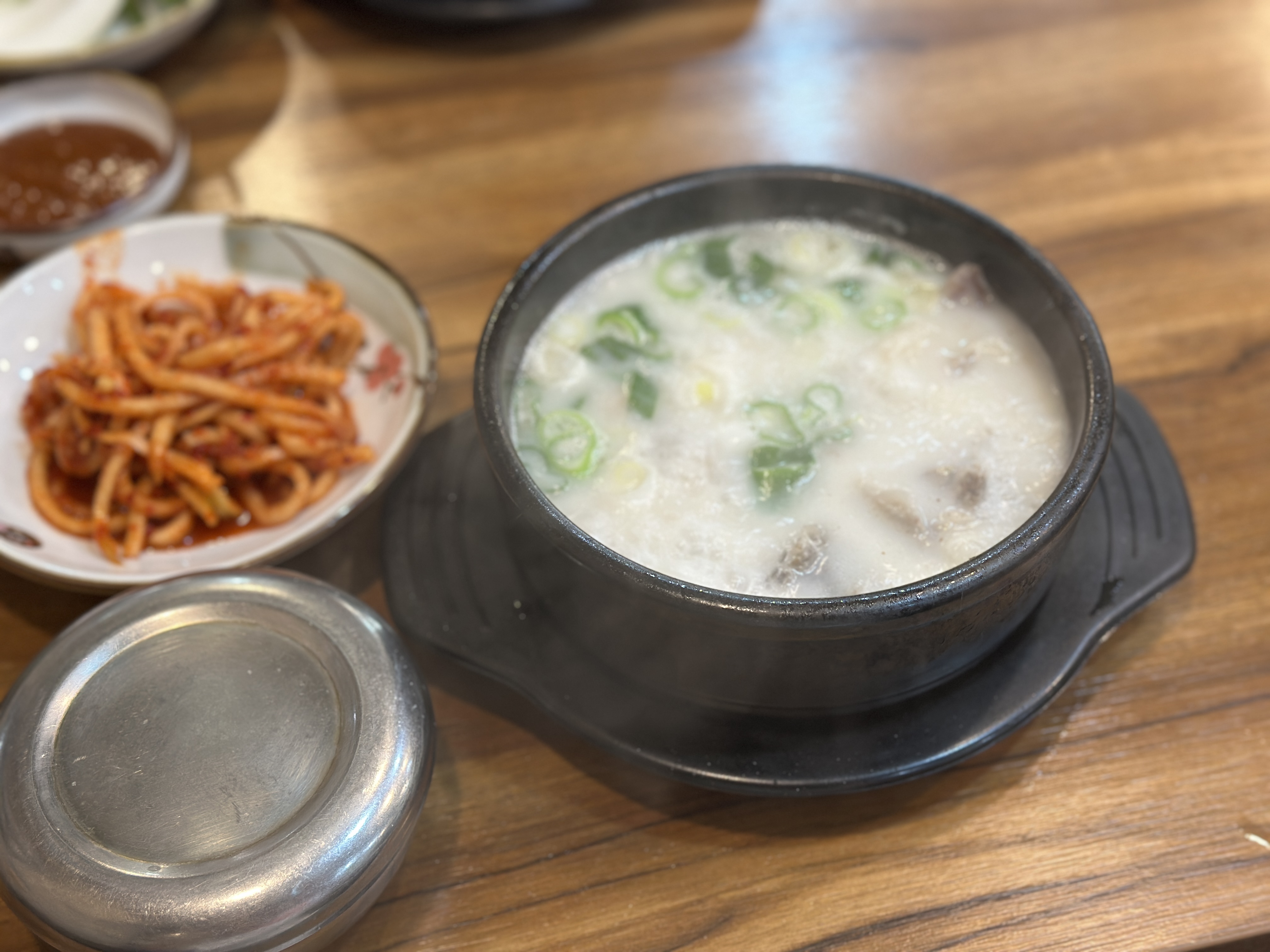 자리에 앉아 주문을 하면 이렇게 밑반찬들이 나옵니다. 테이블에는 새우젓, 들깨가루, 후추 등 DIY를 위한 재료들이 충분하게 비치되어 있죠.