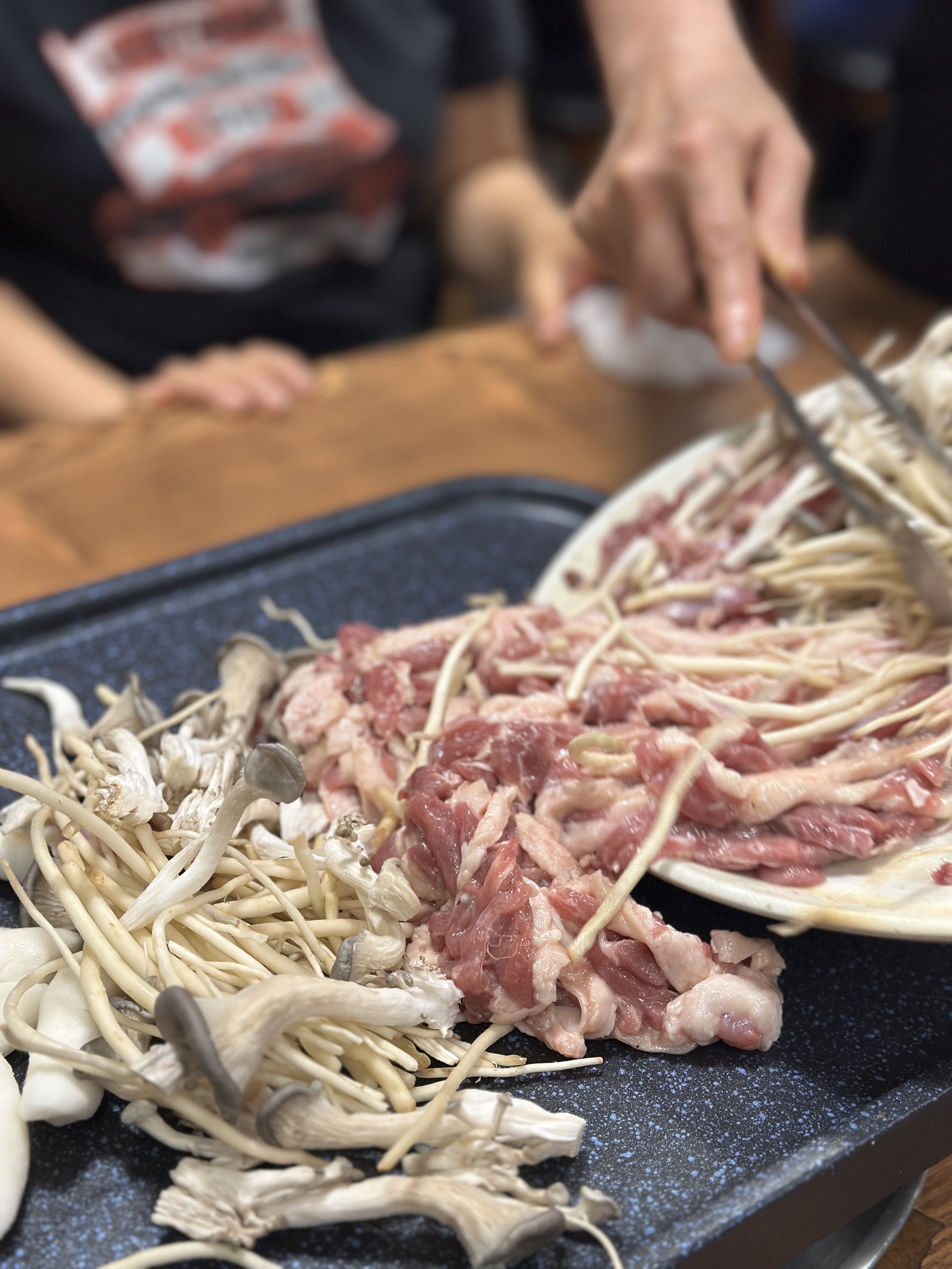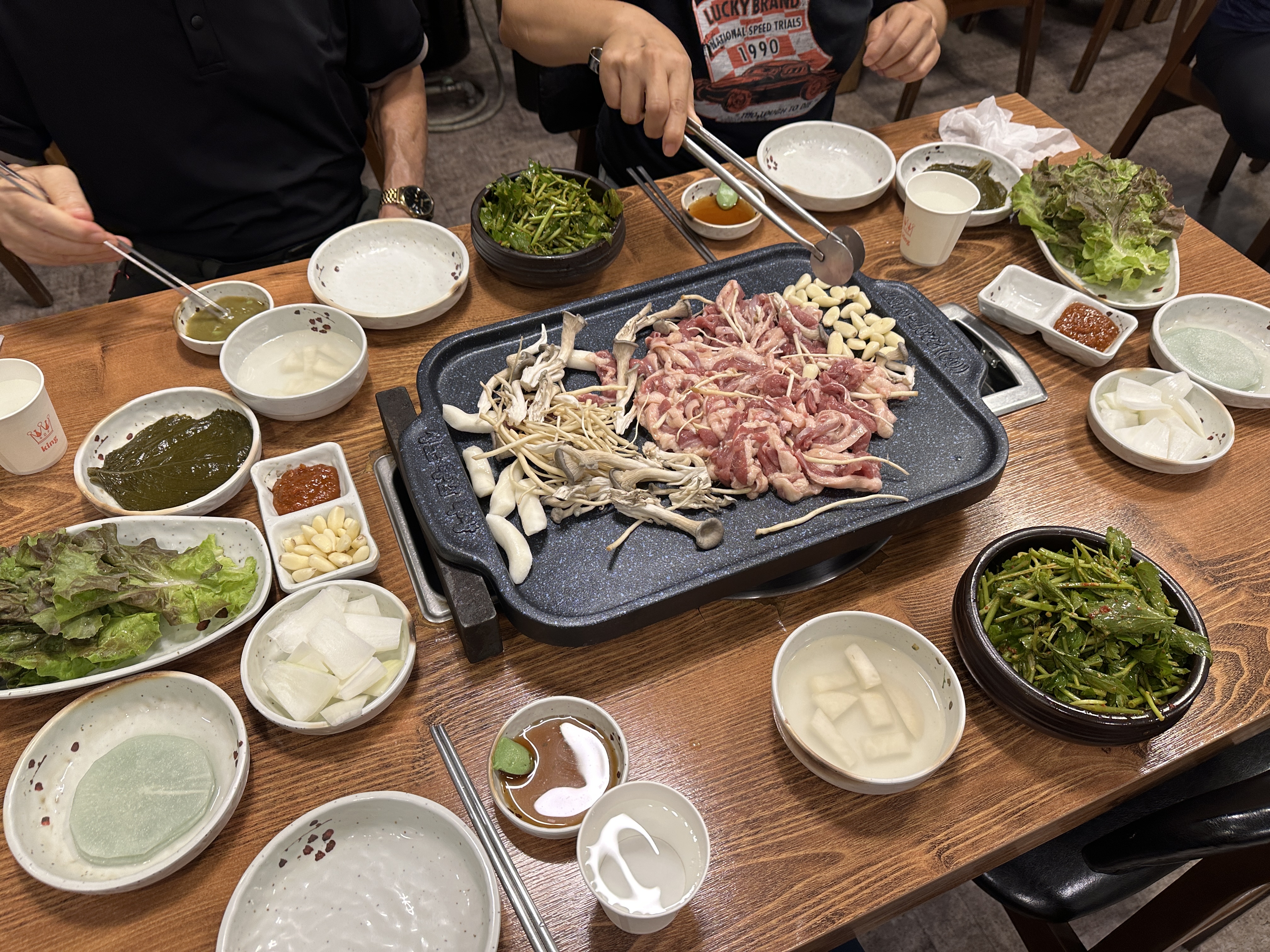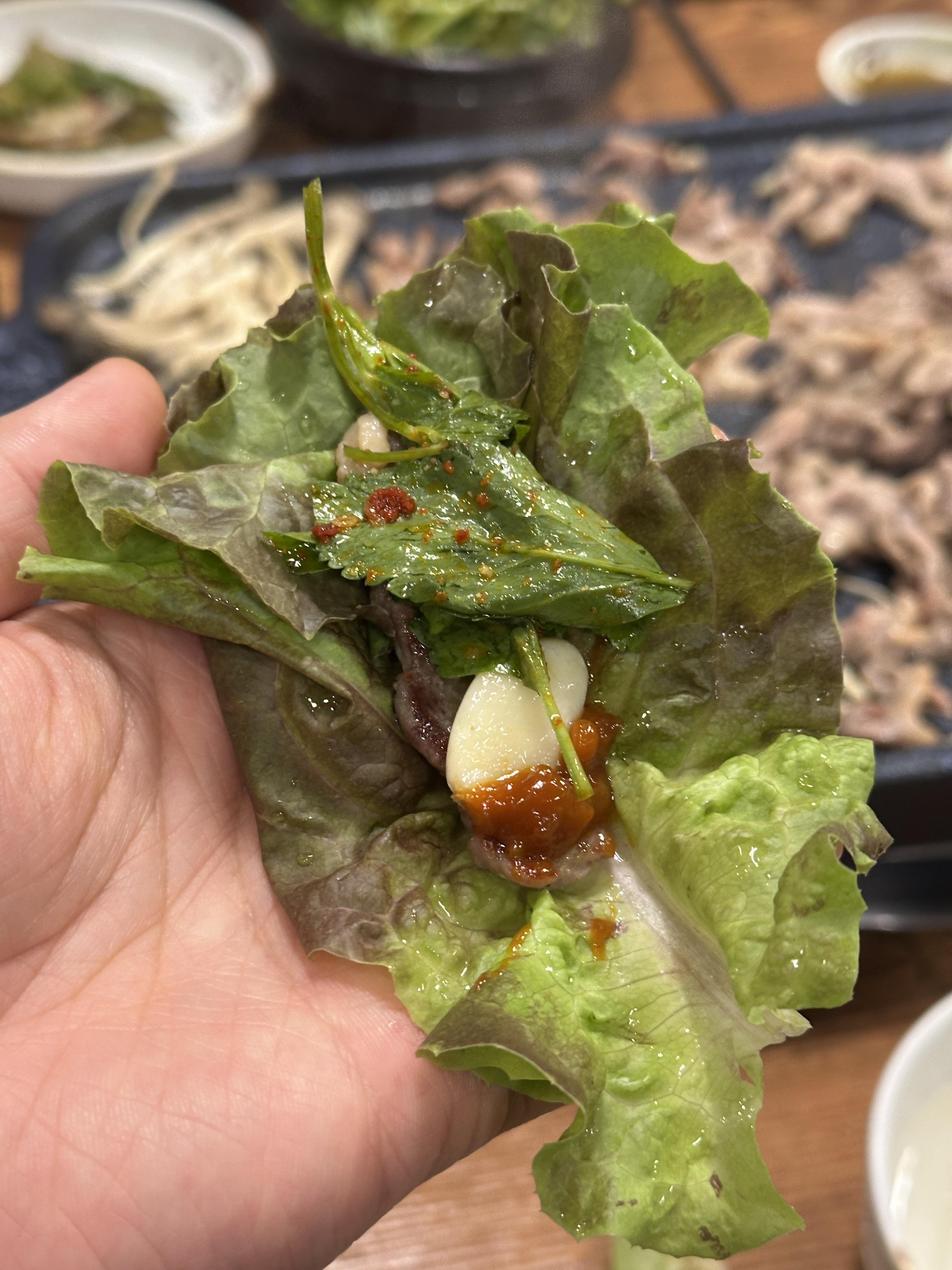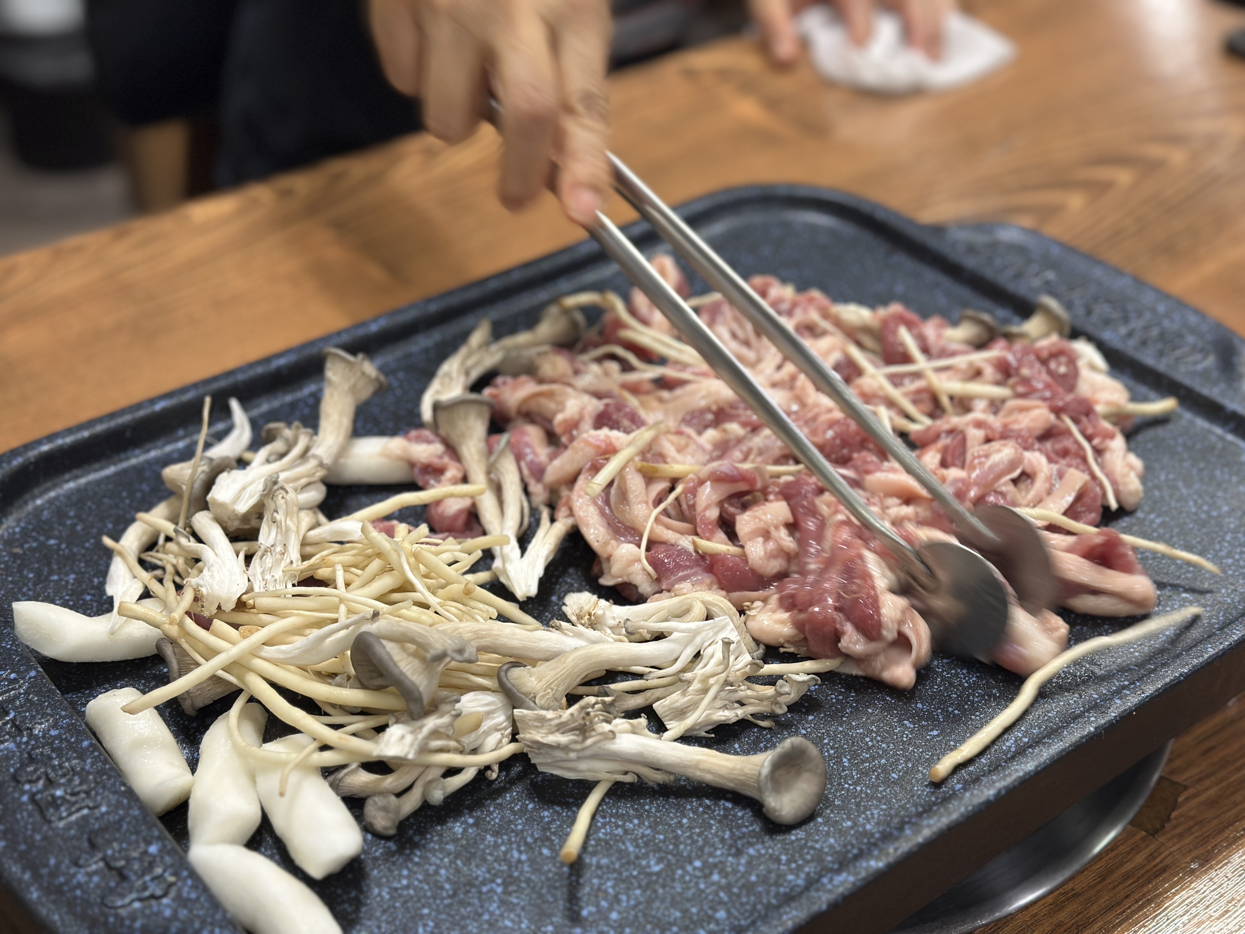 화력이 좋은 버너와 불판의 조화로 금세 익어갑니다. 맛이 좋아보이죠? 그래요. 맛은 표현이 어렵네요. ㅋㅋㅋ 삼채를 구워먹는게 의외로 별미입니다. ㅋㅋㅋ 그냥도 먹고, 쌈을 싸서도 먹고 즐기는 방법은 취향껏!