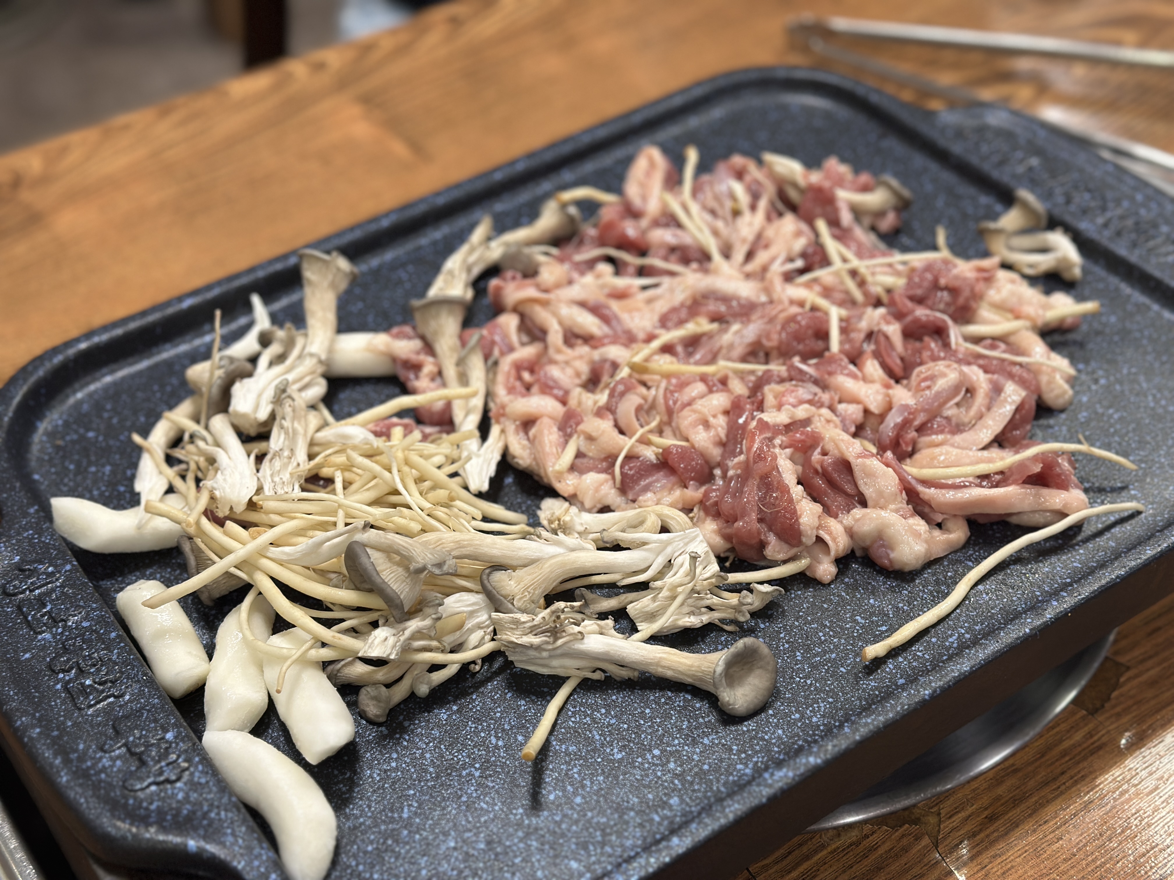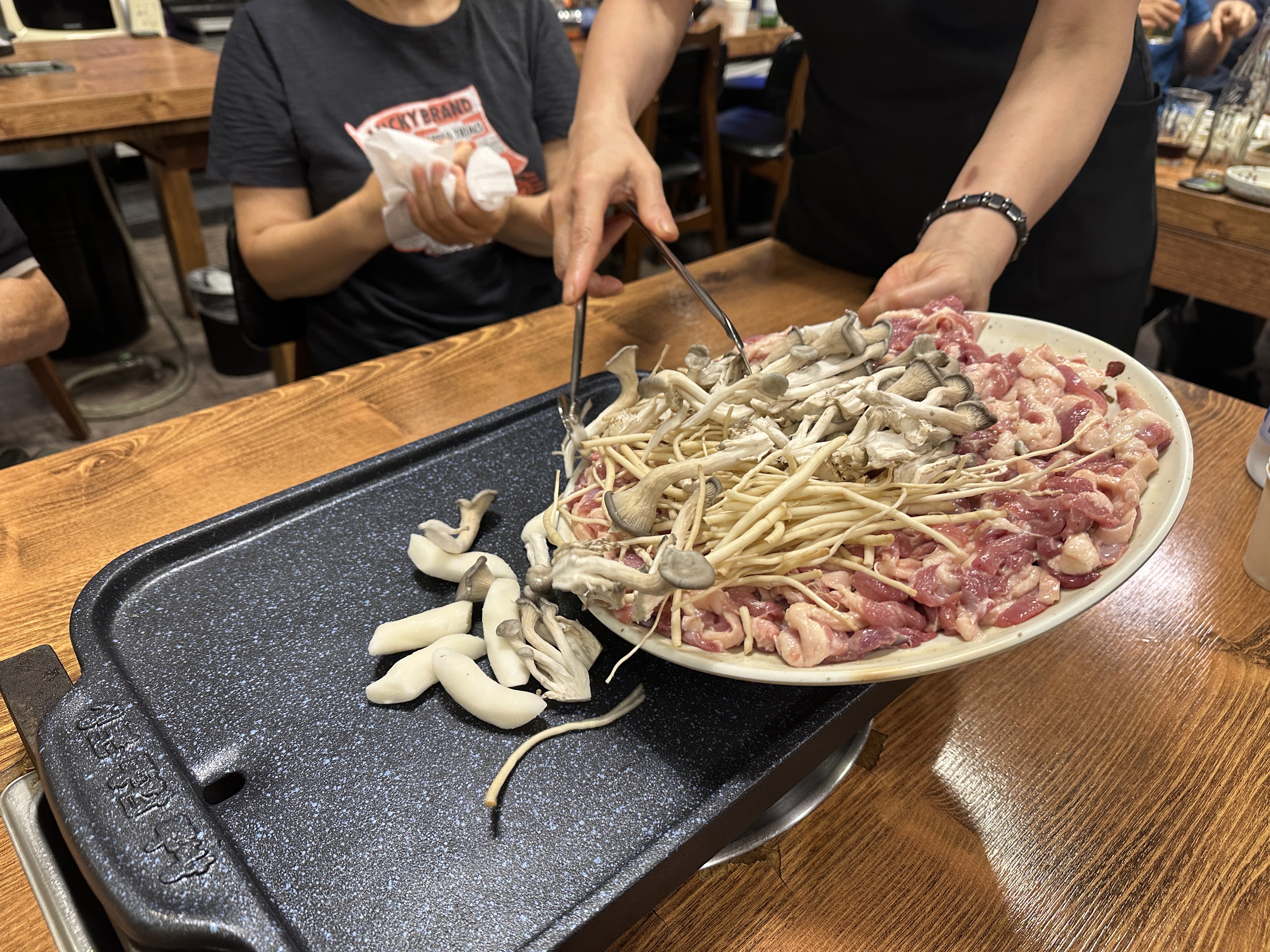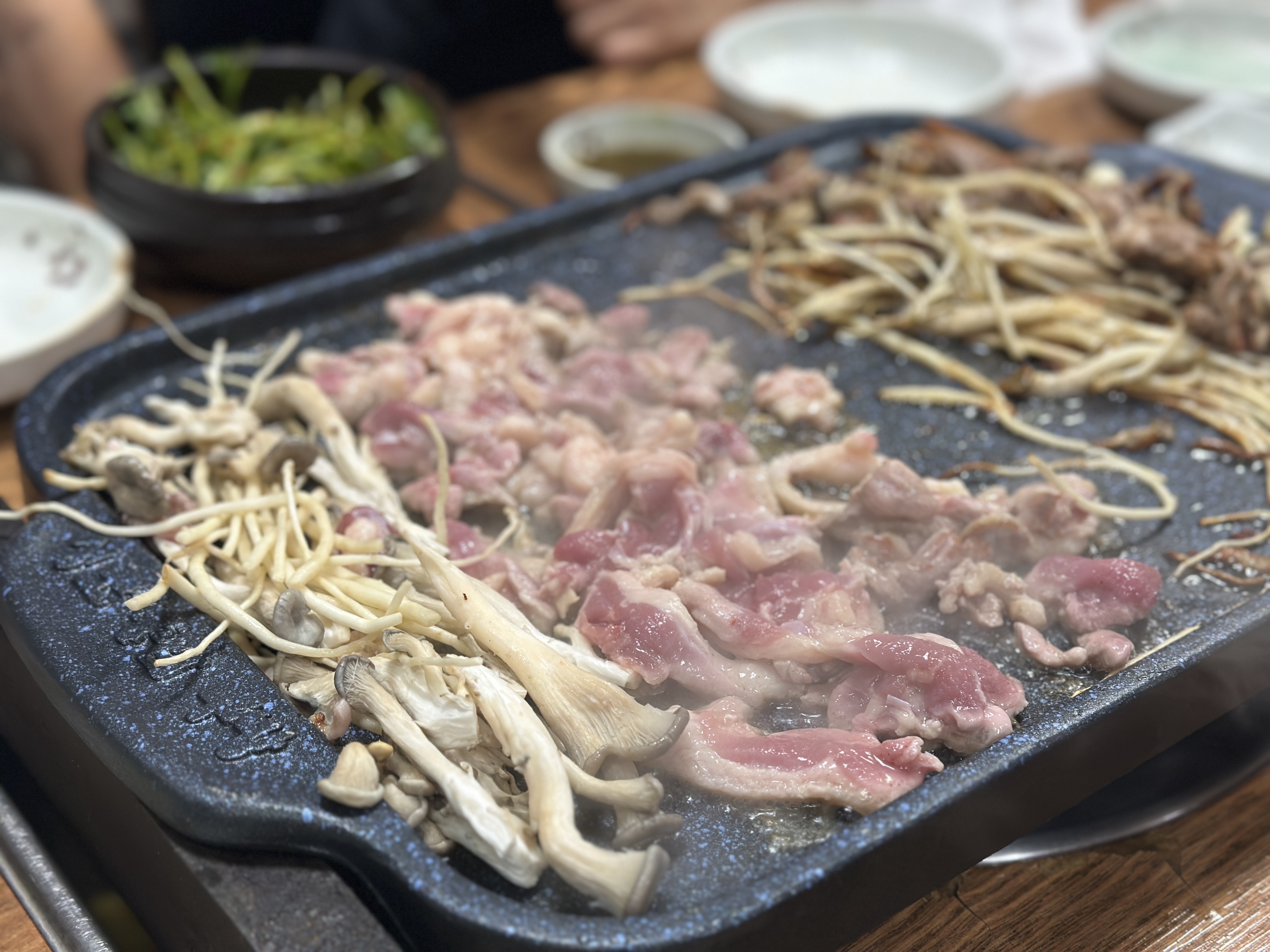 커~ 다란 접시에 오리 한마리와 삼채, 버섯, 그리고 떡이 등장합니다. 절반을 올려서 굽기 시작하죠. 츄르릅...