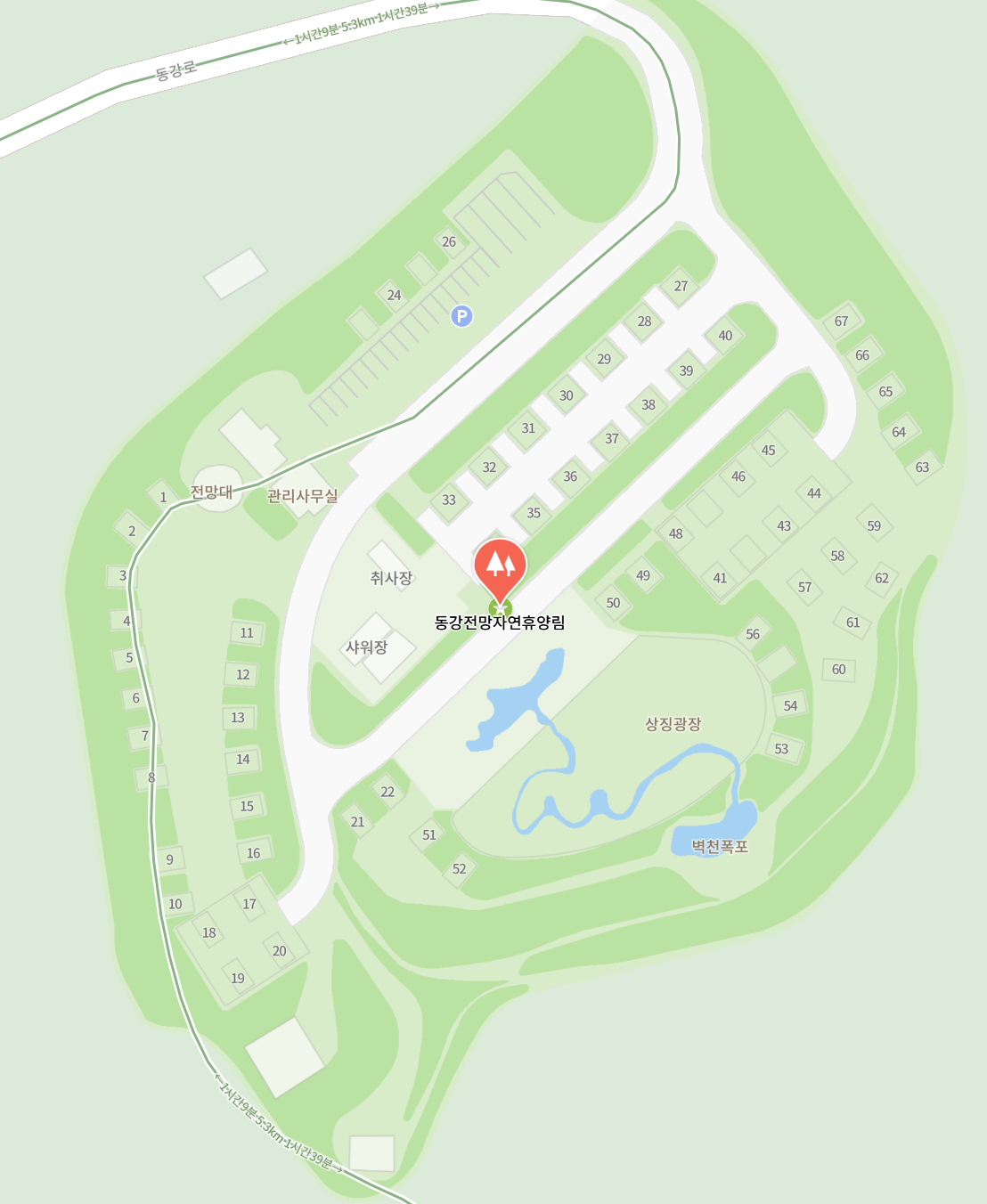--> 동강전망자연휴양림 시설배치도
