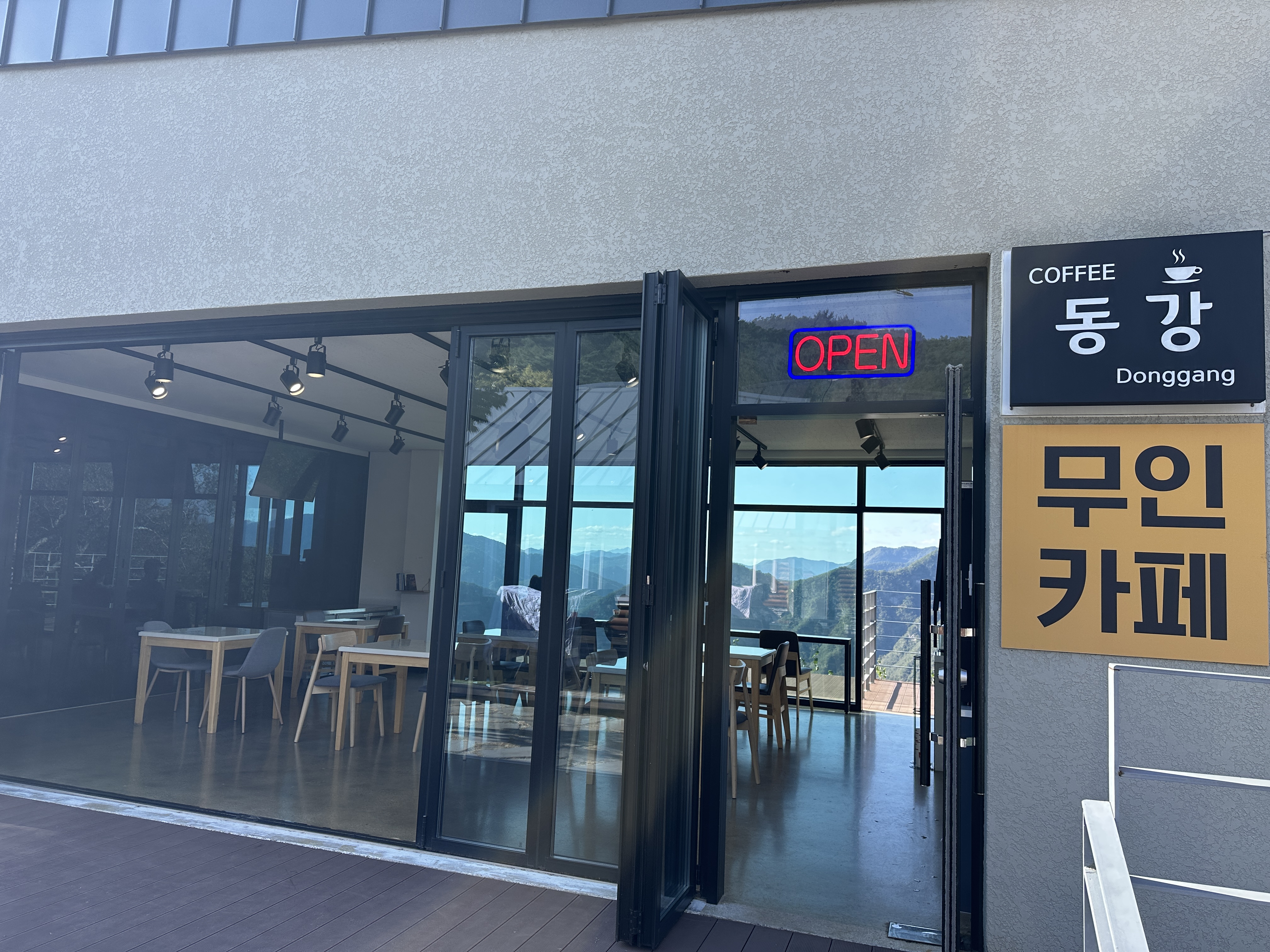 또 하나의 특징이, 무인카페가 하나 있다는 점입니다. 사실 무인카페가 아니었던 것 같은데 바뀌었나봐요 ㅎㅎ 동강 뷰로 앉아서 편하게 커피 한 잔 하는 여유를 즐기기에도 좋아요.