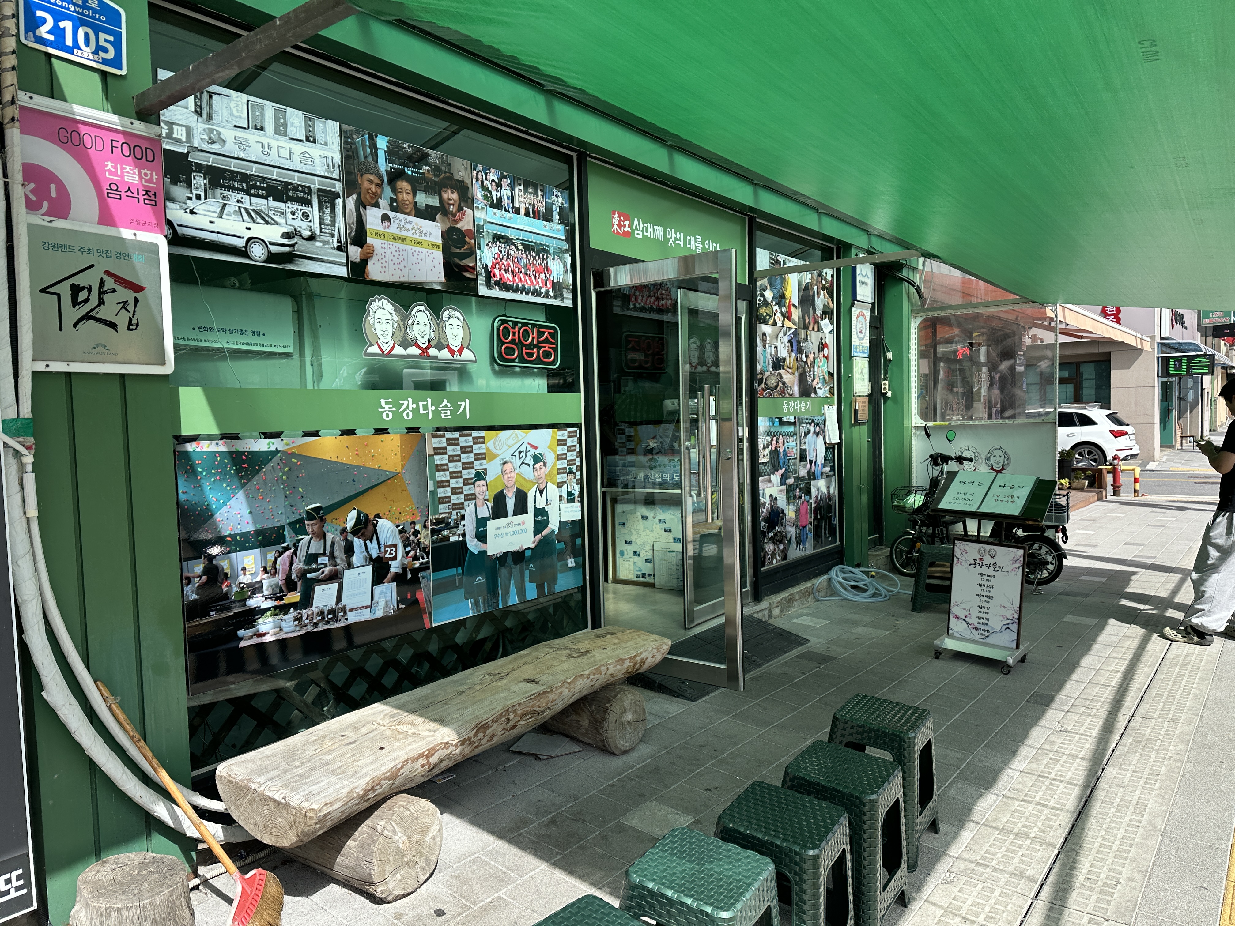 영월역 동강다슬기 외관입니다. 초록색 간판이 눈에 확 띄죠? 대기석도 외부에 친절하게 마련해 두신 센스 굿! 어닝으로 햇빛도 가려주시다니... 이런 식당 또 없습니다. ㅋㅋㅋ
