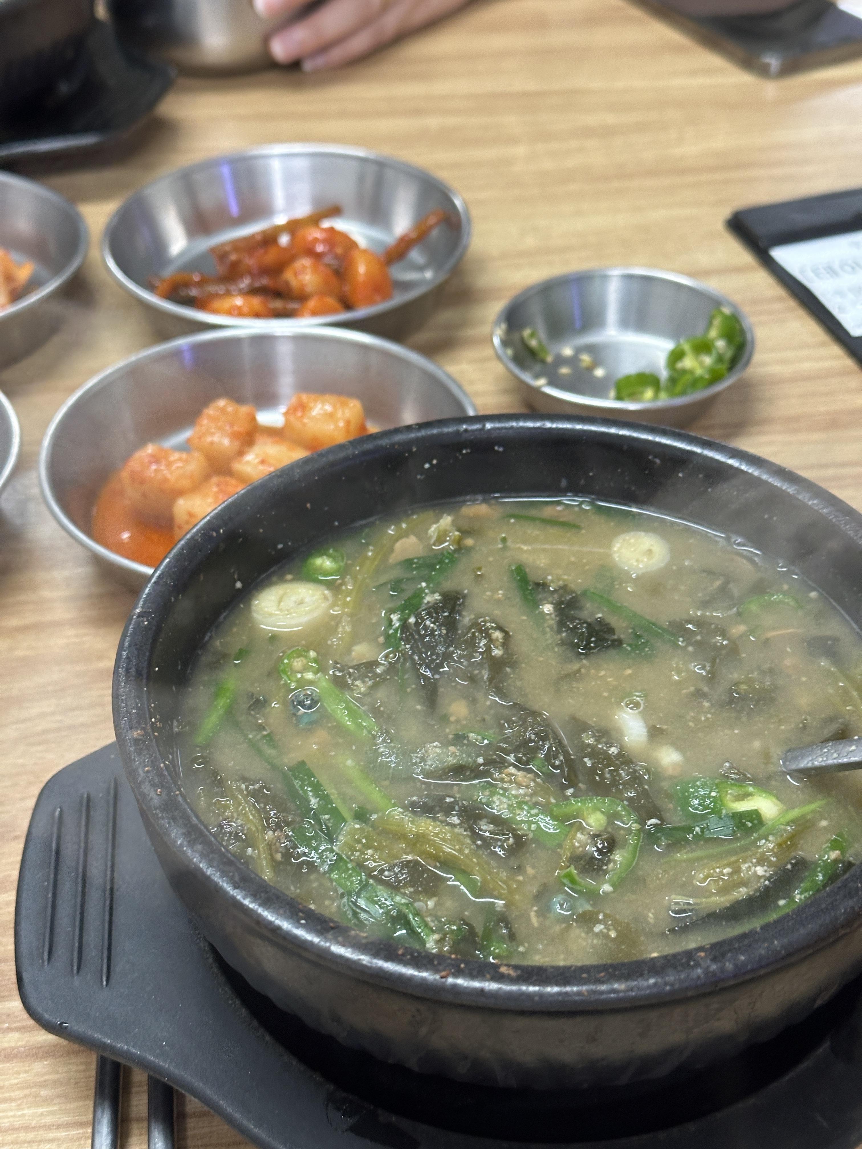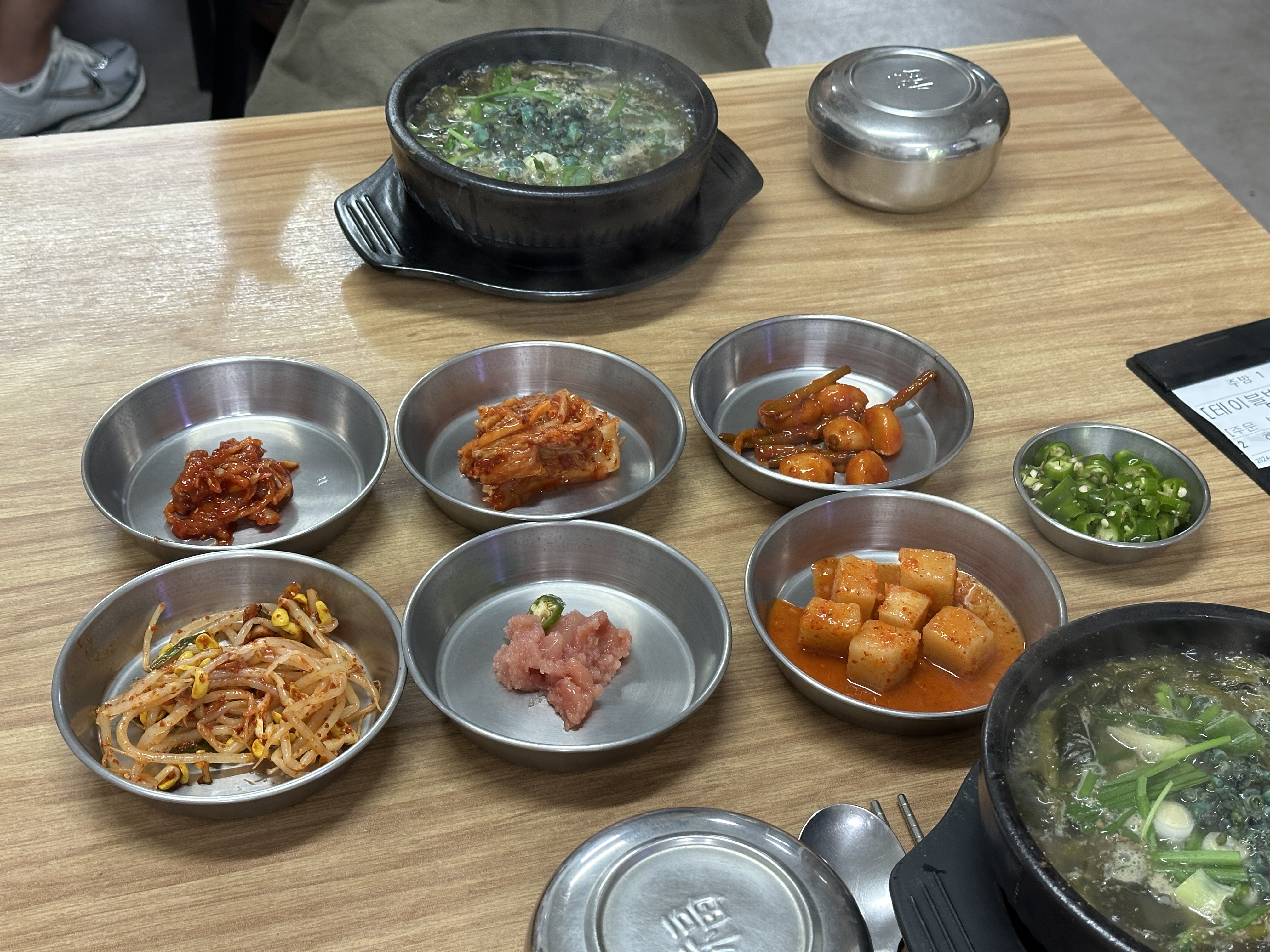 해장국으로 두개 시켜 봅니다. 전이나 무침도 땡기긴 했는데, 2명이서 먹기는 너무 불편해요.