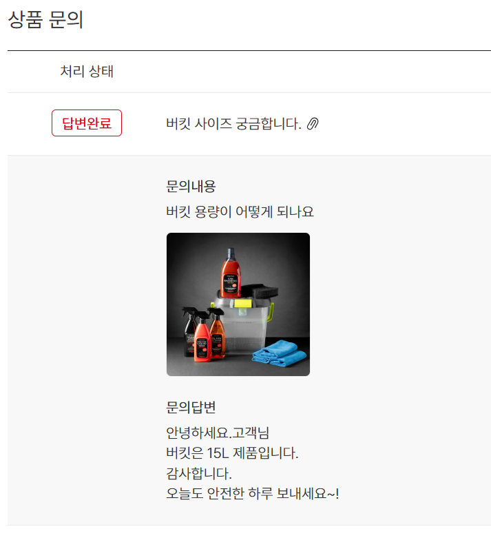 불스원 세차용품 세친자 13종 세트는 실내부터 외부 도장, 휠/타이어까지 완벽하게 관리가 가능한 구성입니다. 저같은 입문자에게는 더할나위 없는 상황이죠. 그리고 불스원 세차용품 세친자 13종 세트에 포함된 버킷은 15리터입니다. 상세페이지에 없어서 문의를 남겨버렸죠. ㅋㅋㅋ