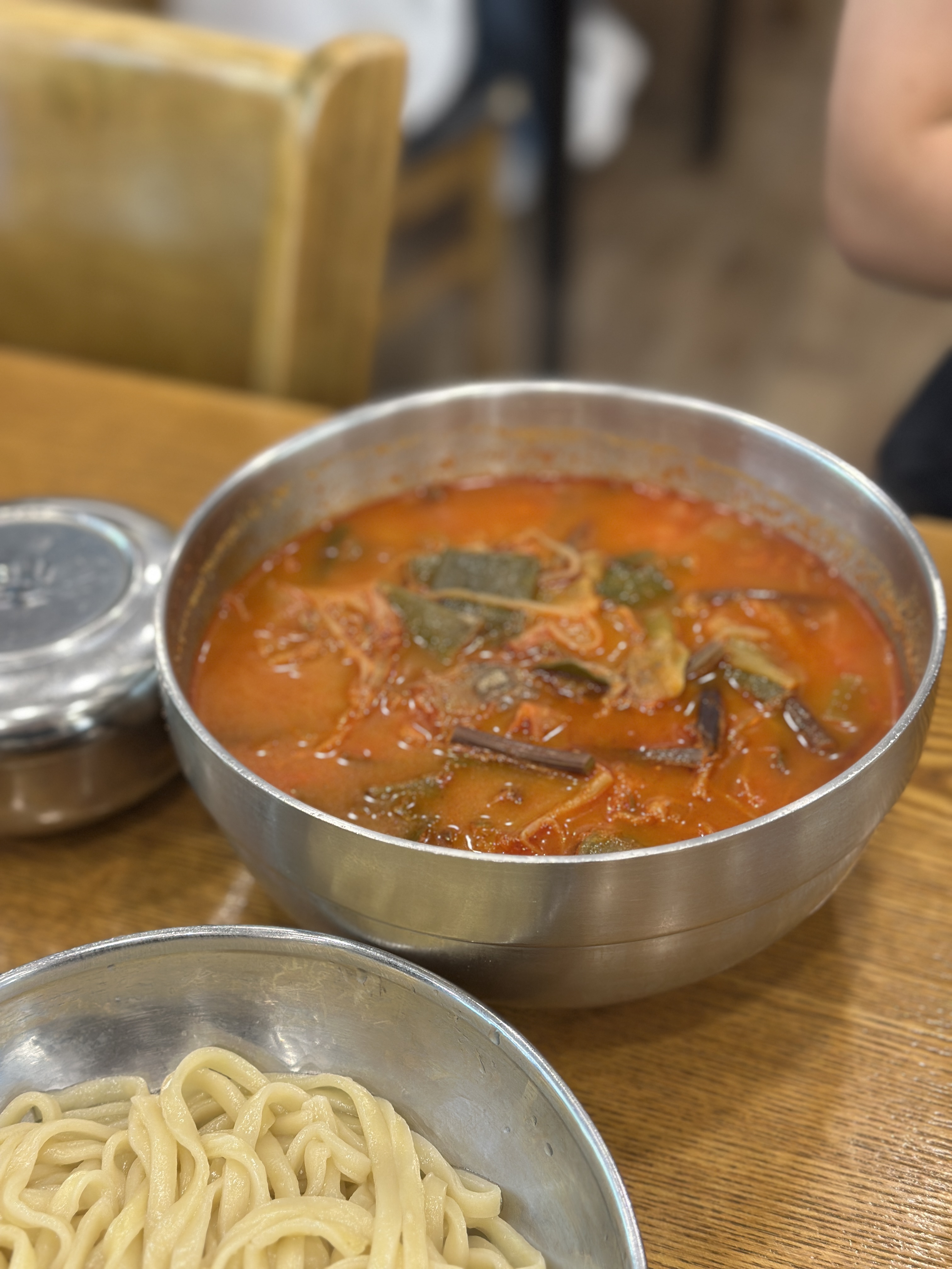육칼에서 나오는 칼국수면과 1개 추가한 면을 한 그릇에 주셨습니다. 외관상 들깨가 들어간 국물이 좀 더 구수한 색감이고, 기존 육칼은 역시 강렬한 붉은 색을 띕니다.